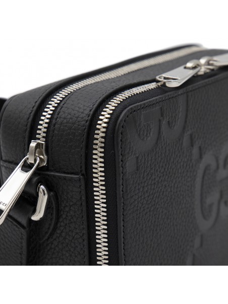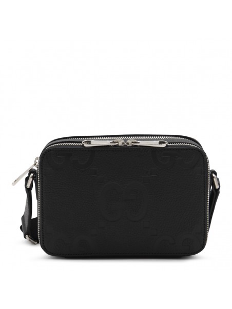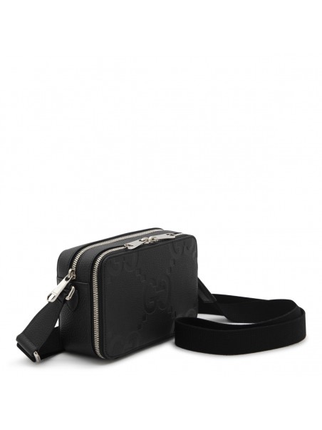 Black leather Jumbo GG mini bag from Gucci featuring all-over GG embossed motif, adjustable shoulder strap, double zip fastening, internal zip compartments and card slots.