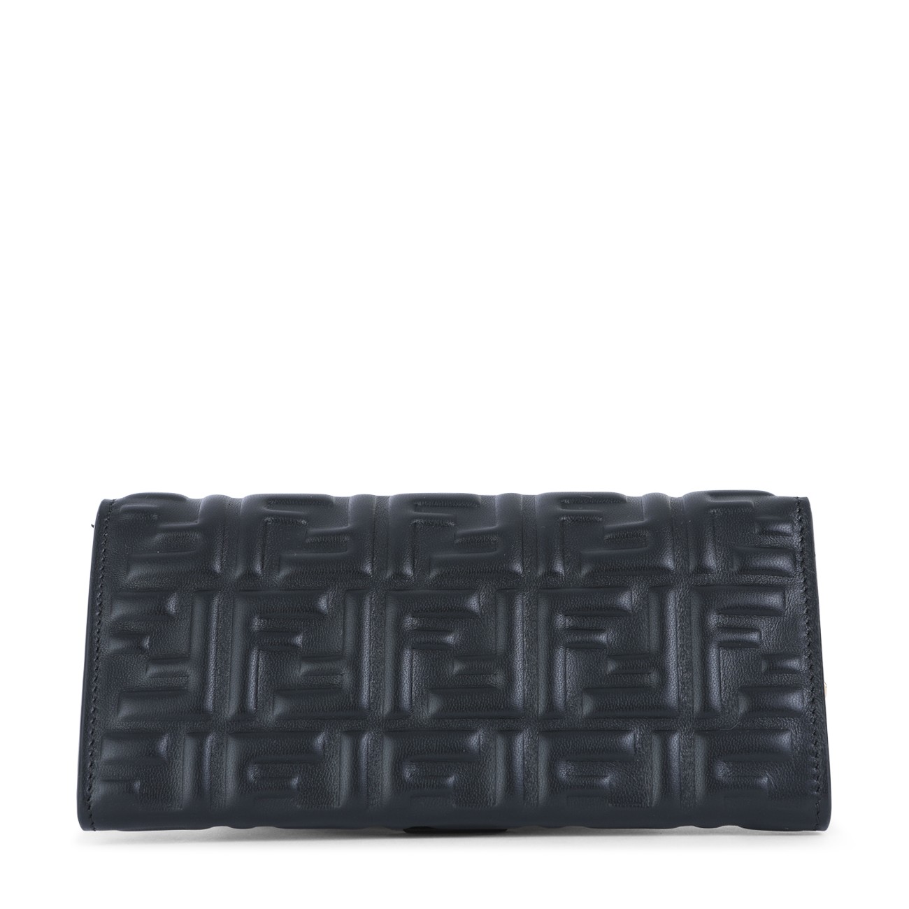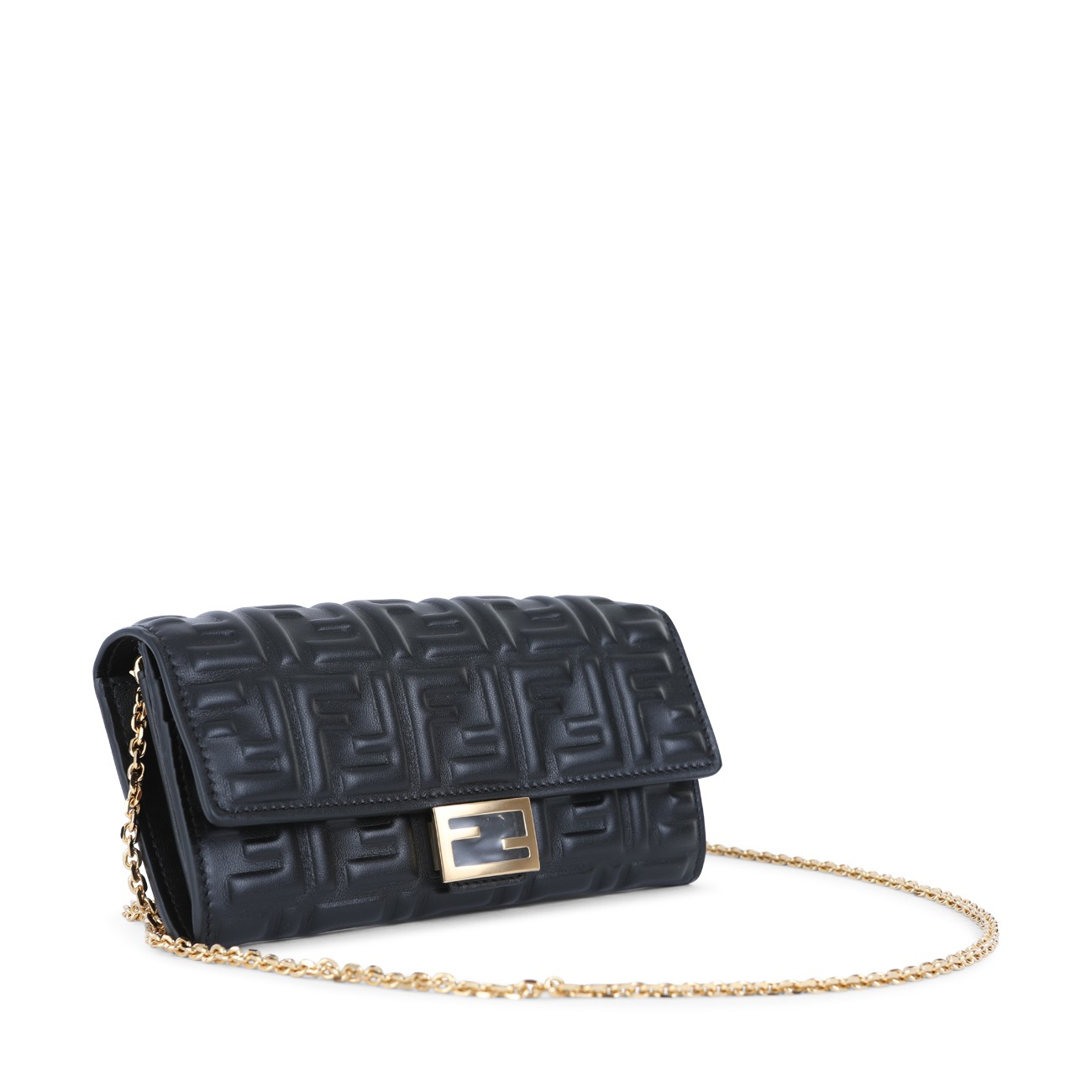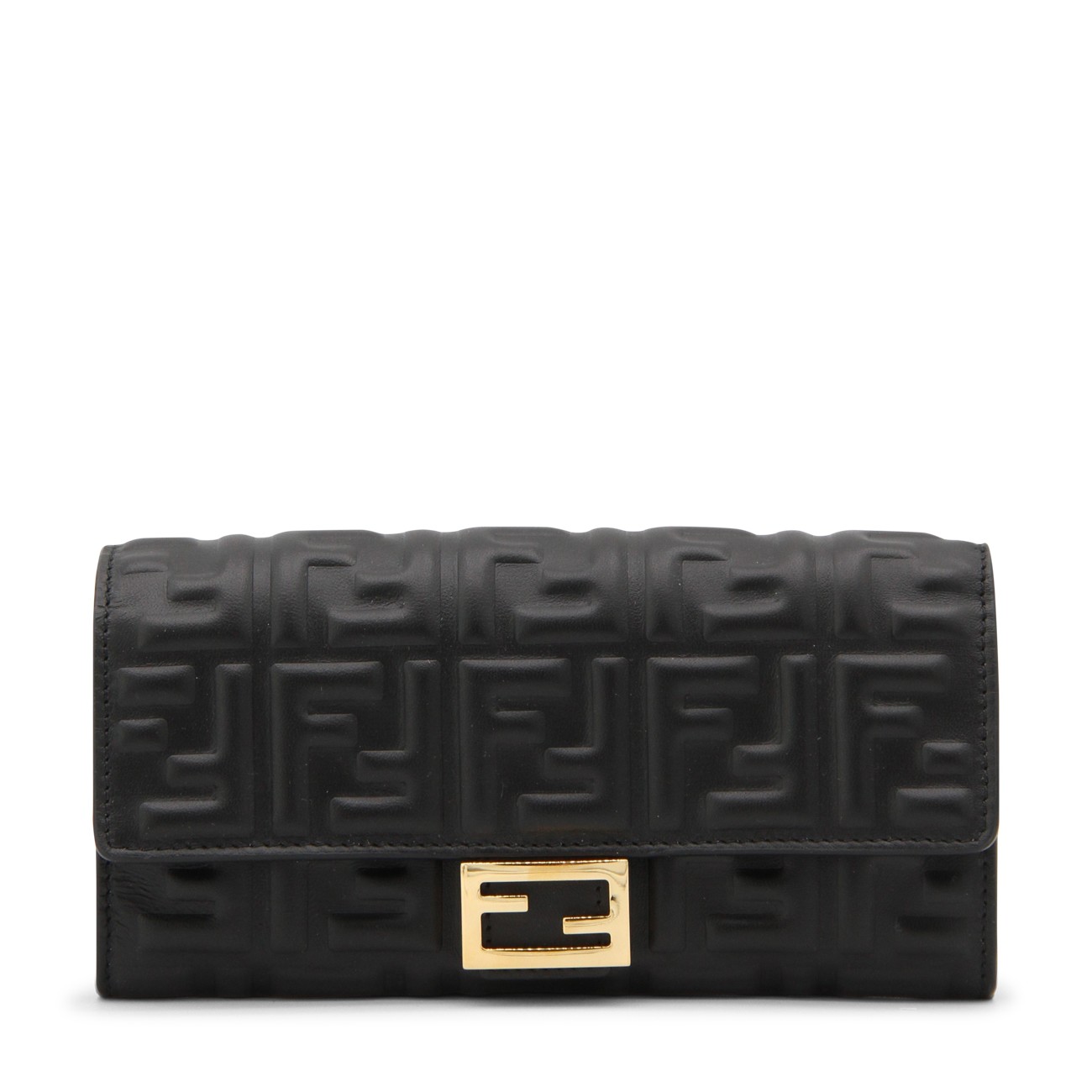 Black leather Baguette walllet from Fendi featuring magnetic clap closure, gold tone metal hardware, two compartments, ten card slots, detachable metal chain, FF buckle at front and zipped pocket.