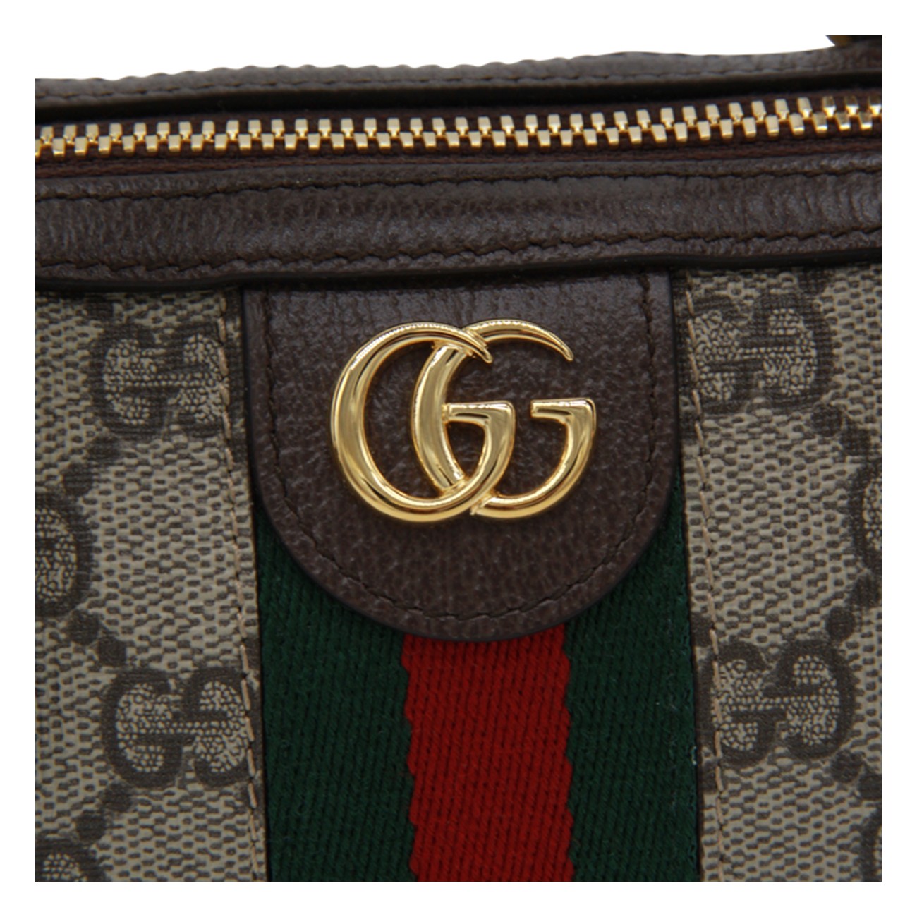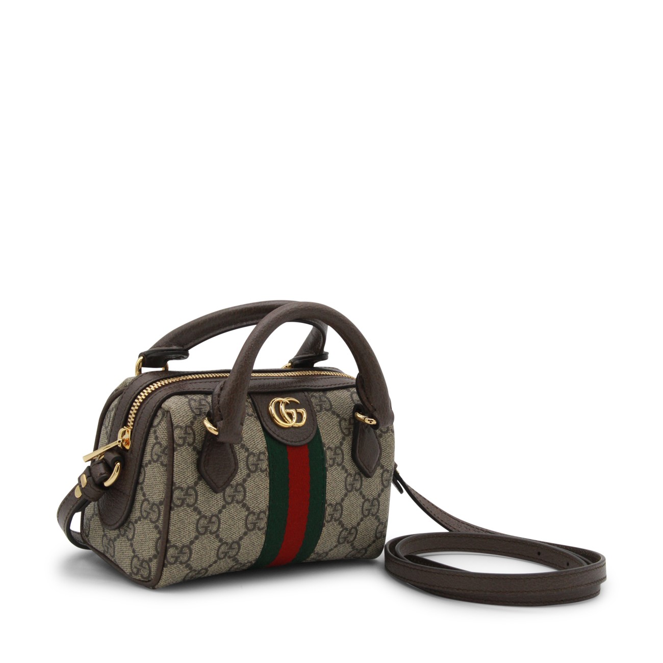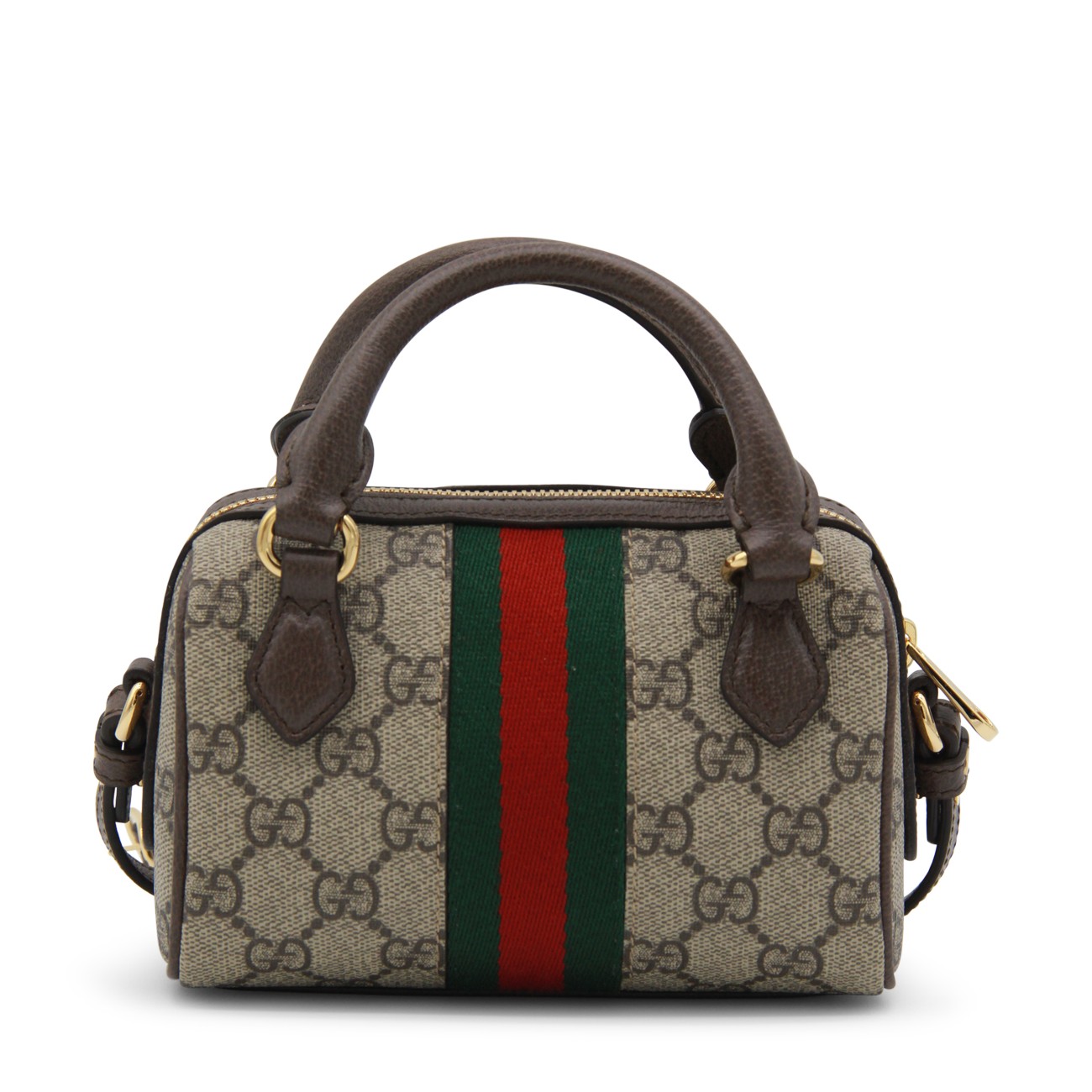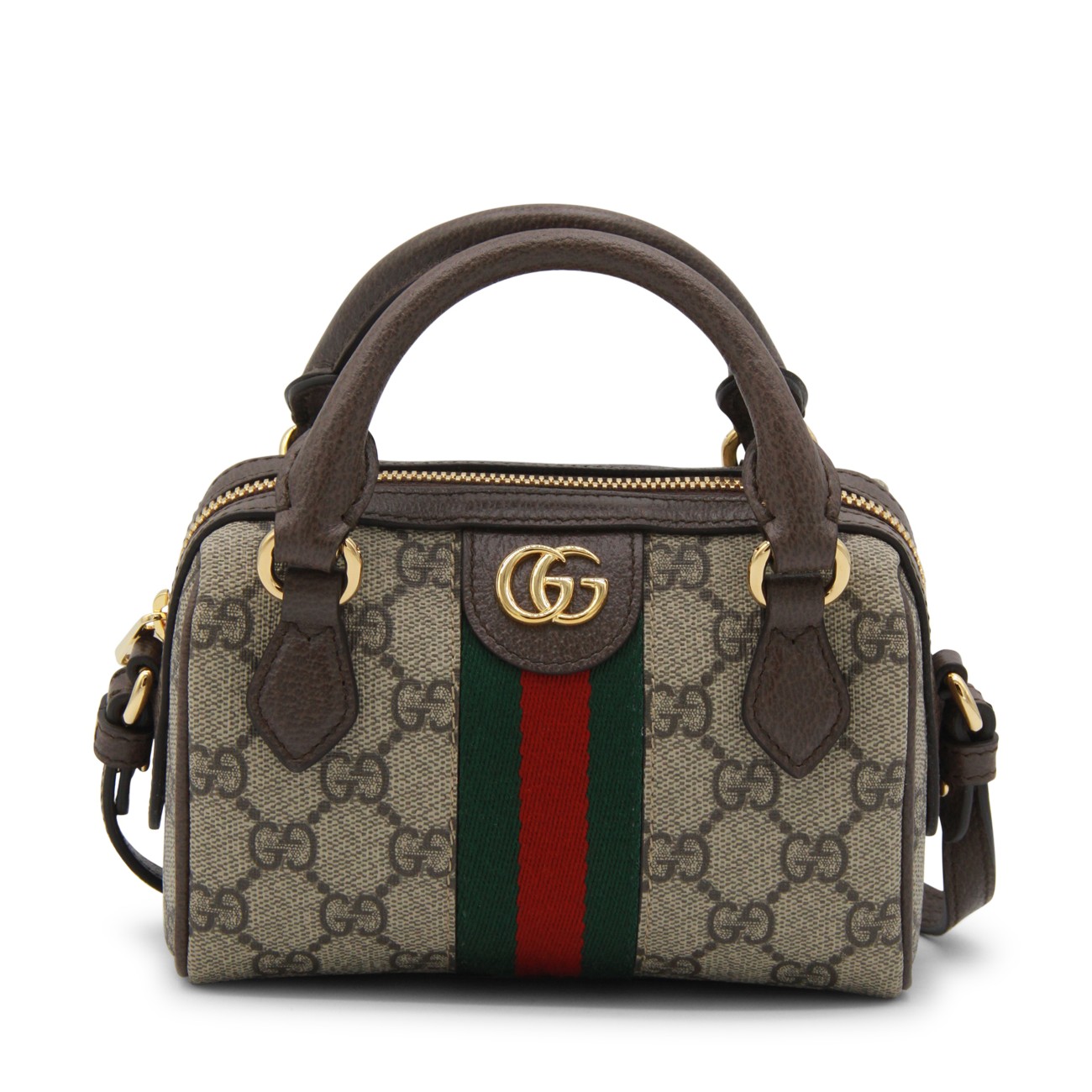 Beige leather Ophidia mini bag from Gucci featuring handles, adjiustable and removable shoulder strap, all-over GG logo texture, light gold metal hardware, frontal GG logo, Web ribbon, zip closure and main compartment.