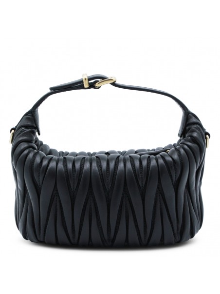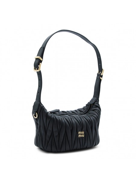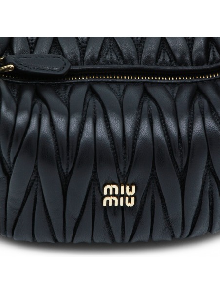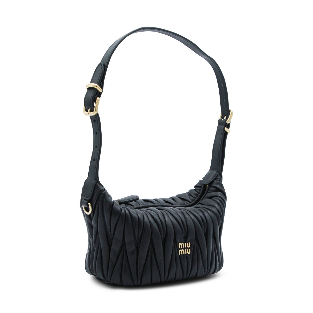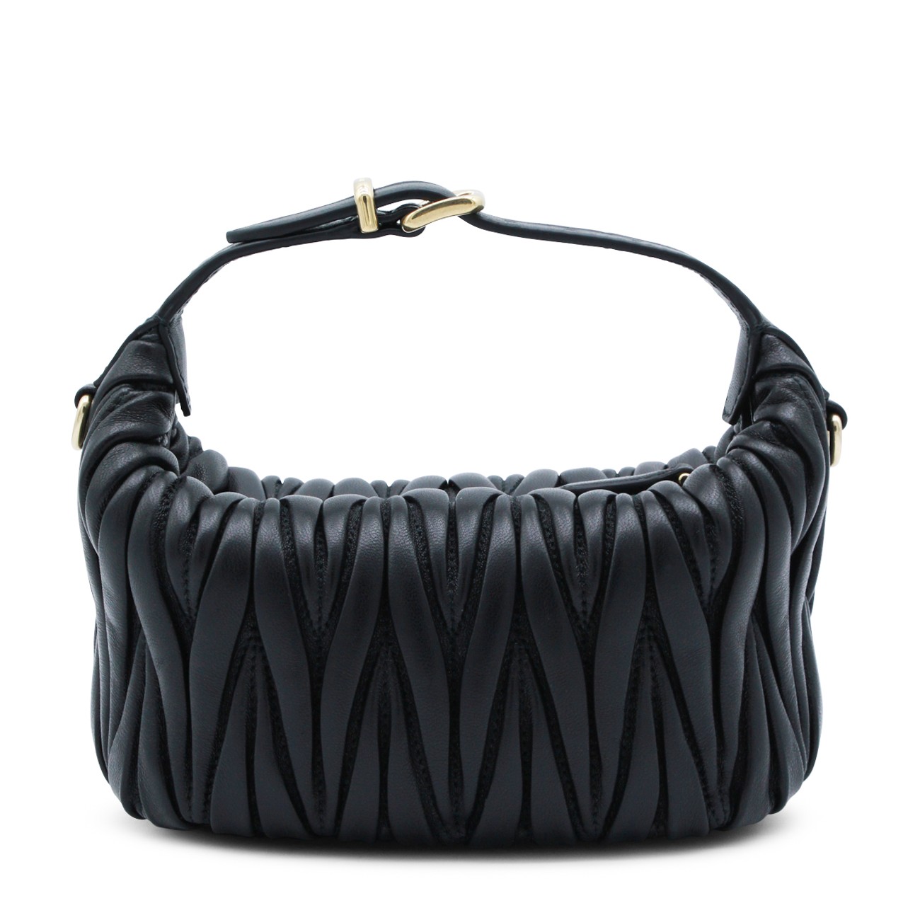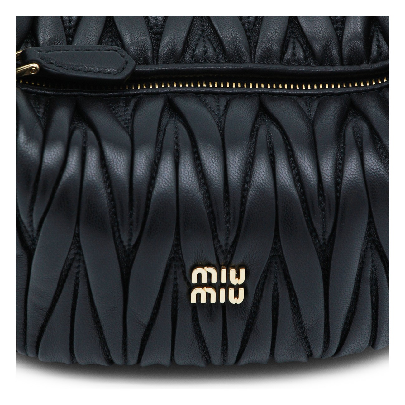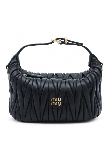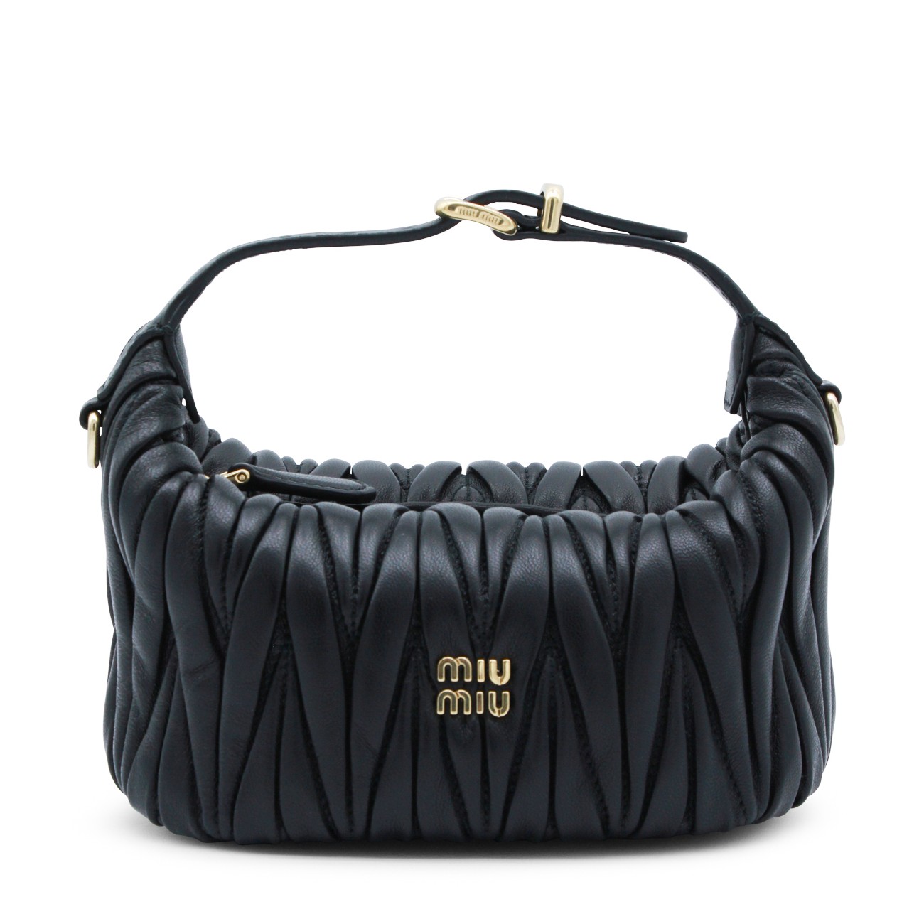 Black leather mini bag from Miu Miu featuring top handle, zip fastening, main compartment, internal zip pocket, golden hardware,frontal logo detail and all over details.