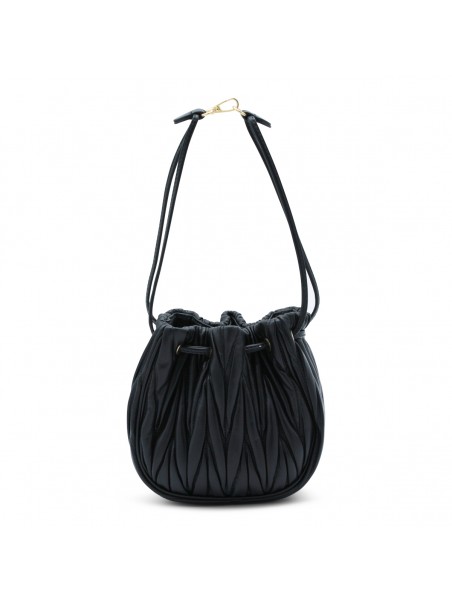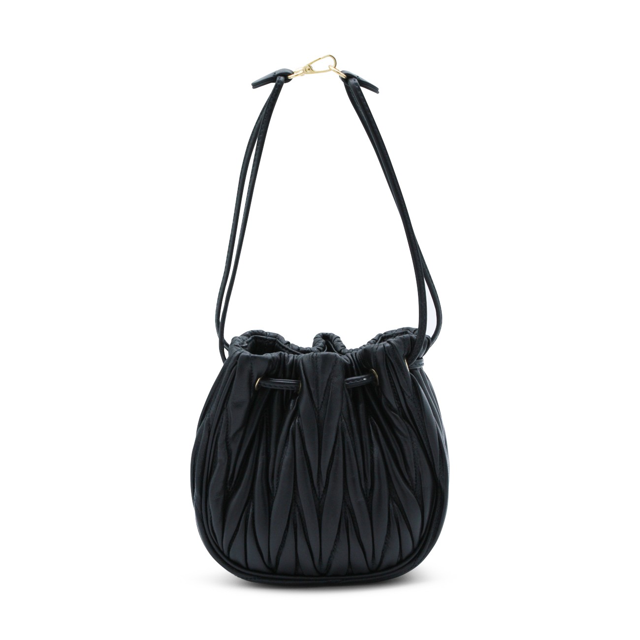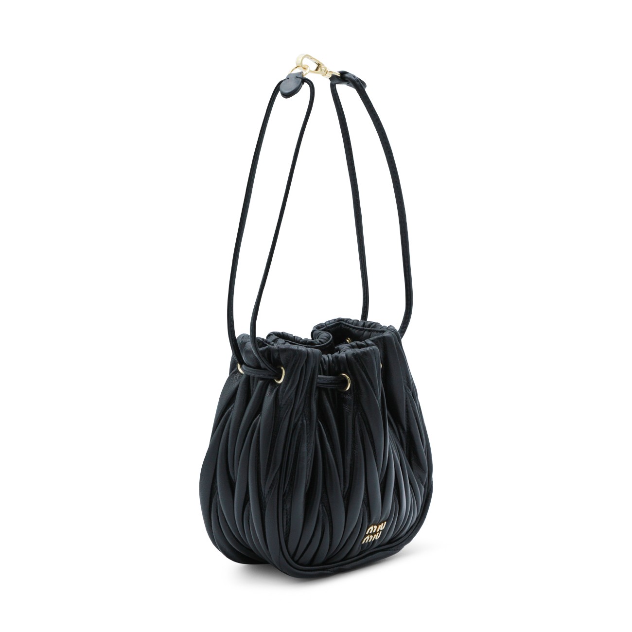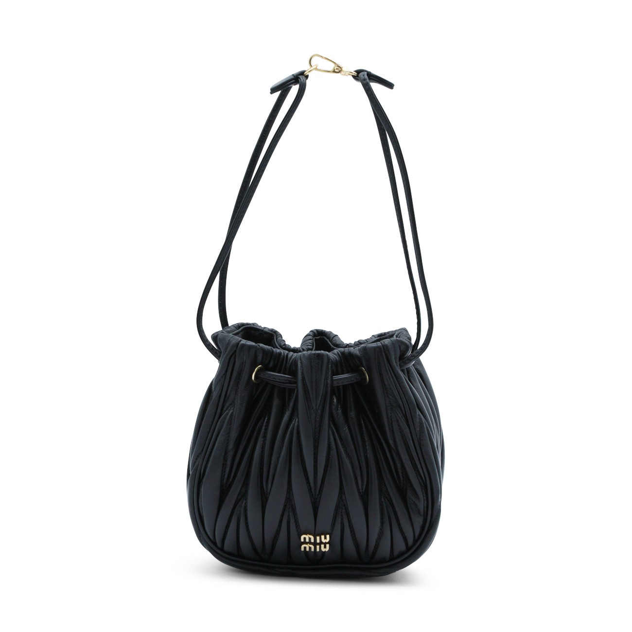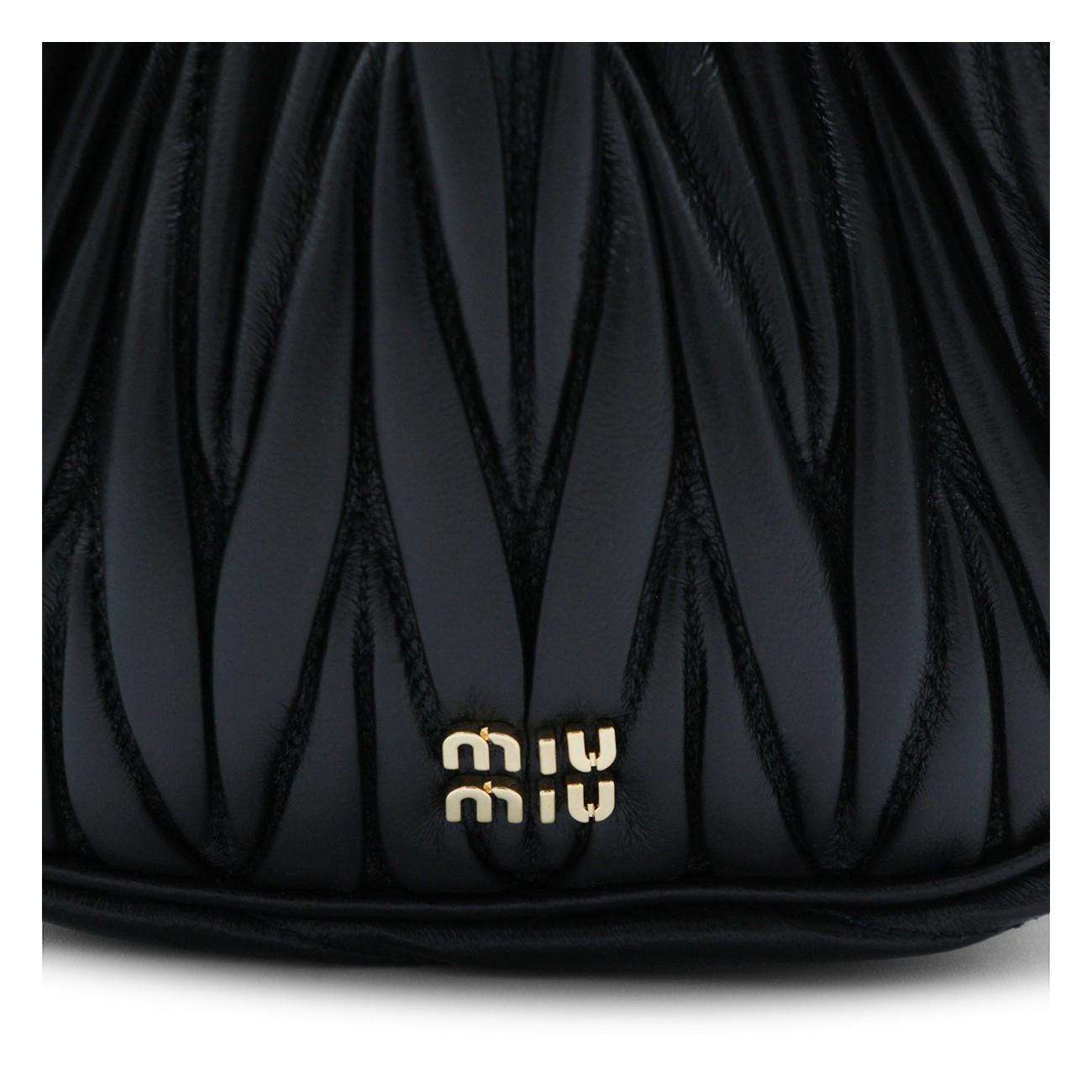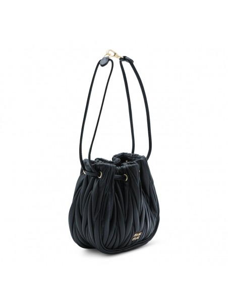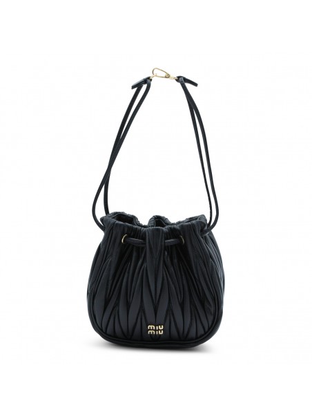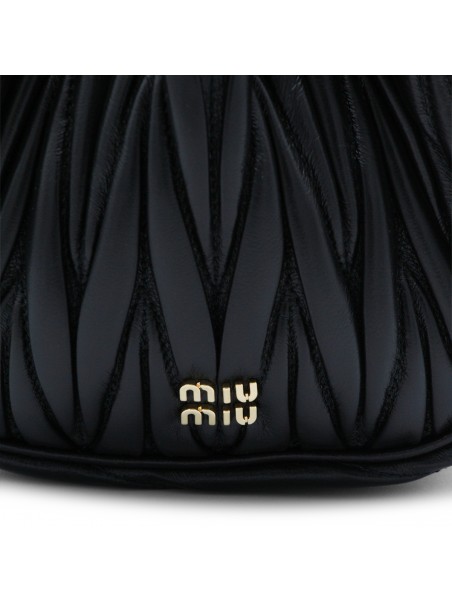 Black leather mini bag from Miu Miu featuring top handle, upper closure with drawstring, embellishments, logo golden detail and main compartment.