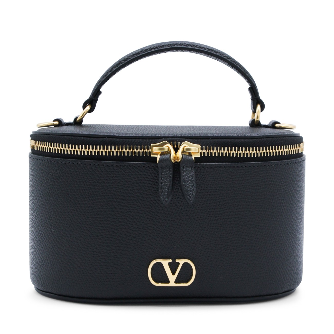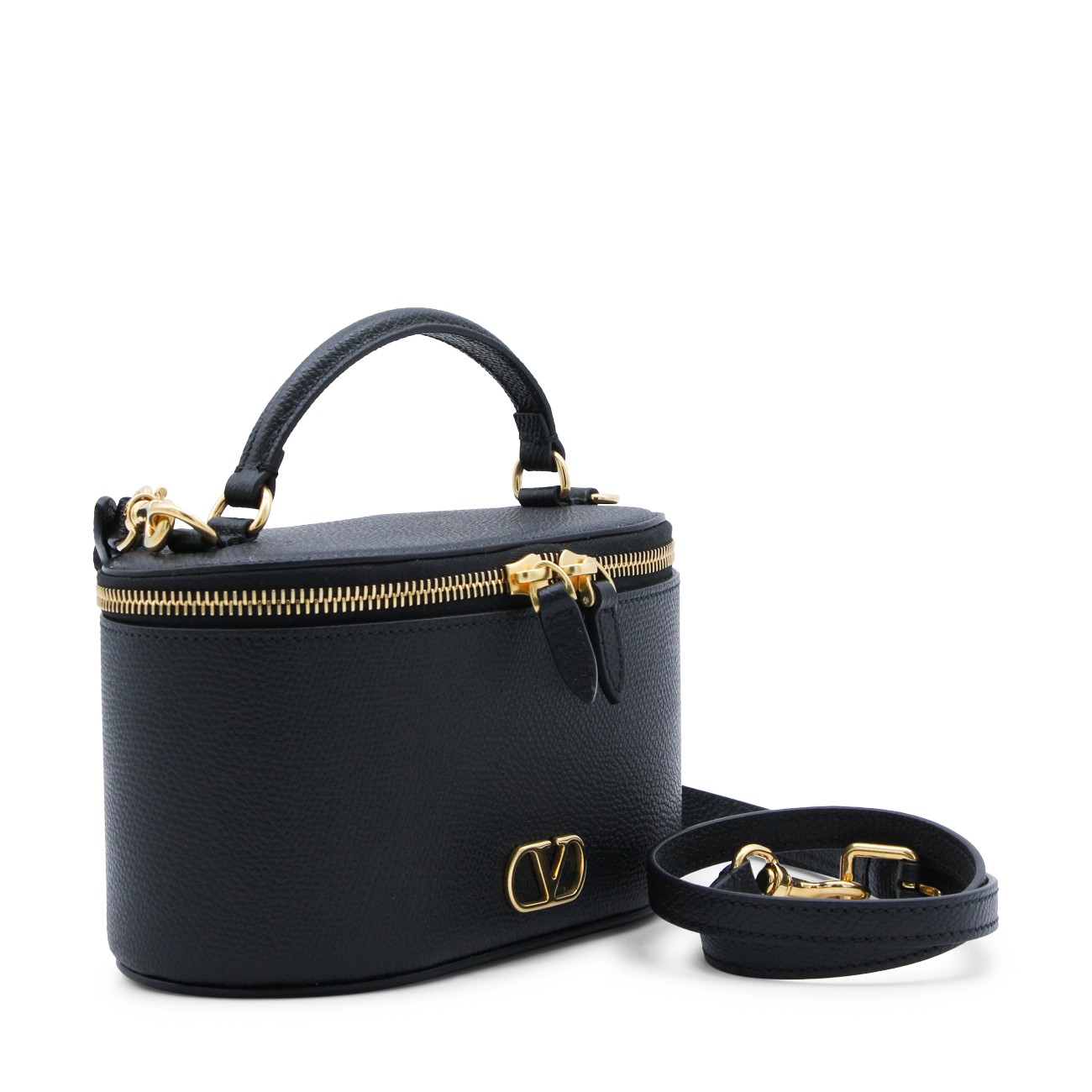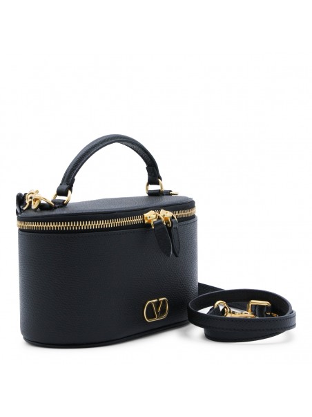 Black leather Mini Vanity bag from Valentino Garavani featuring top handle, adjustable and removable shoulder strap, zip closure, main compartment and gold tone logo.