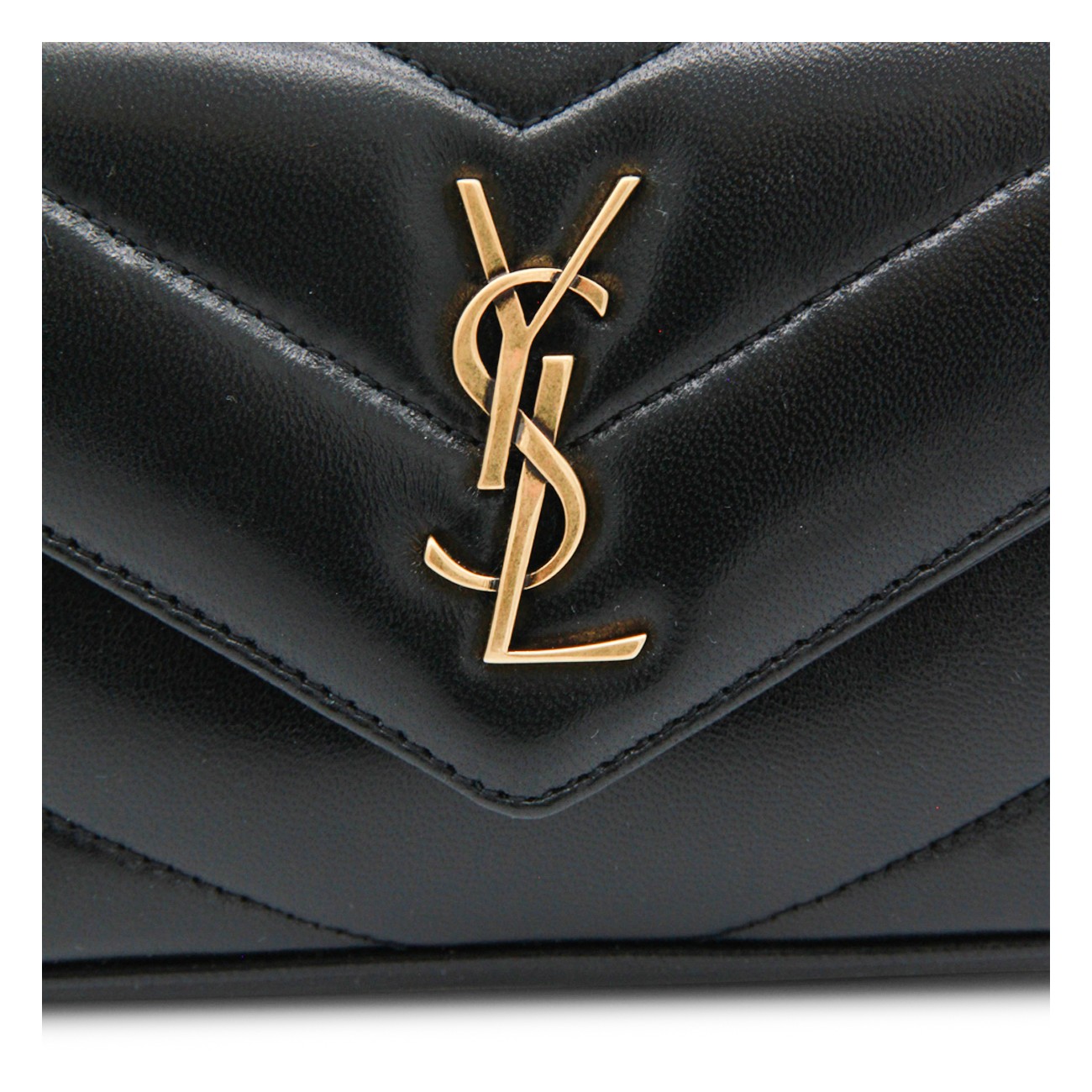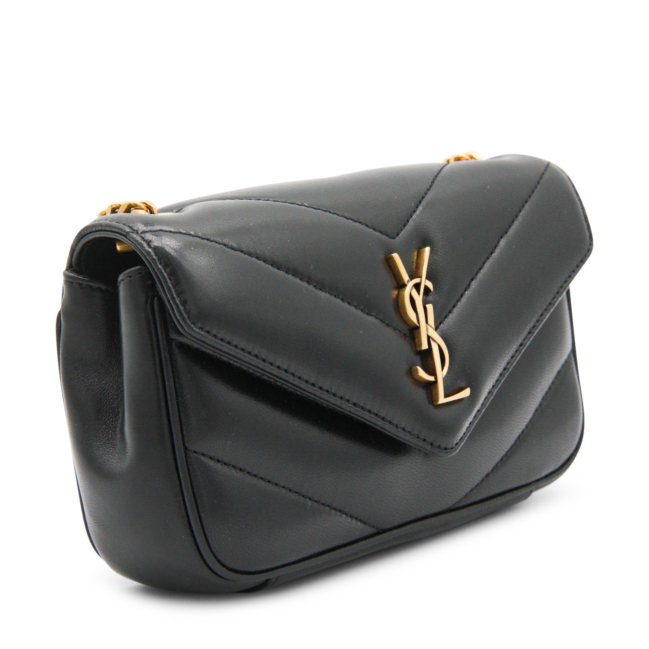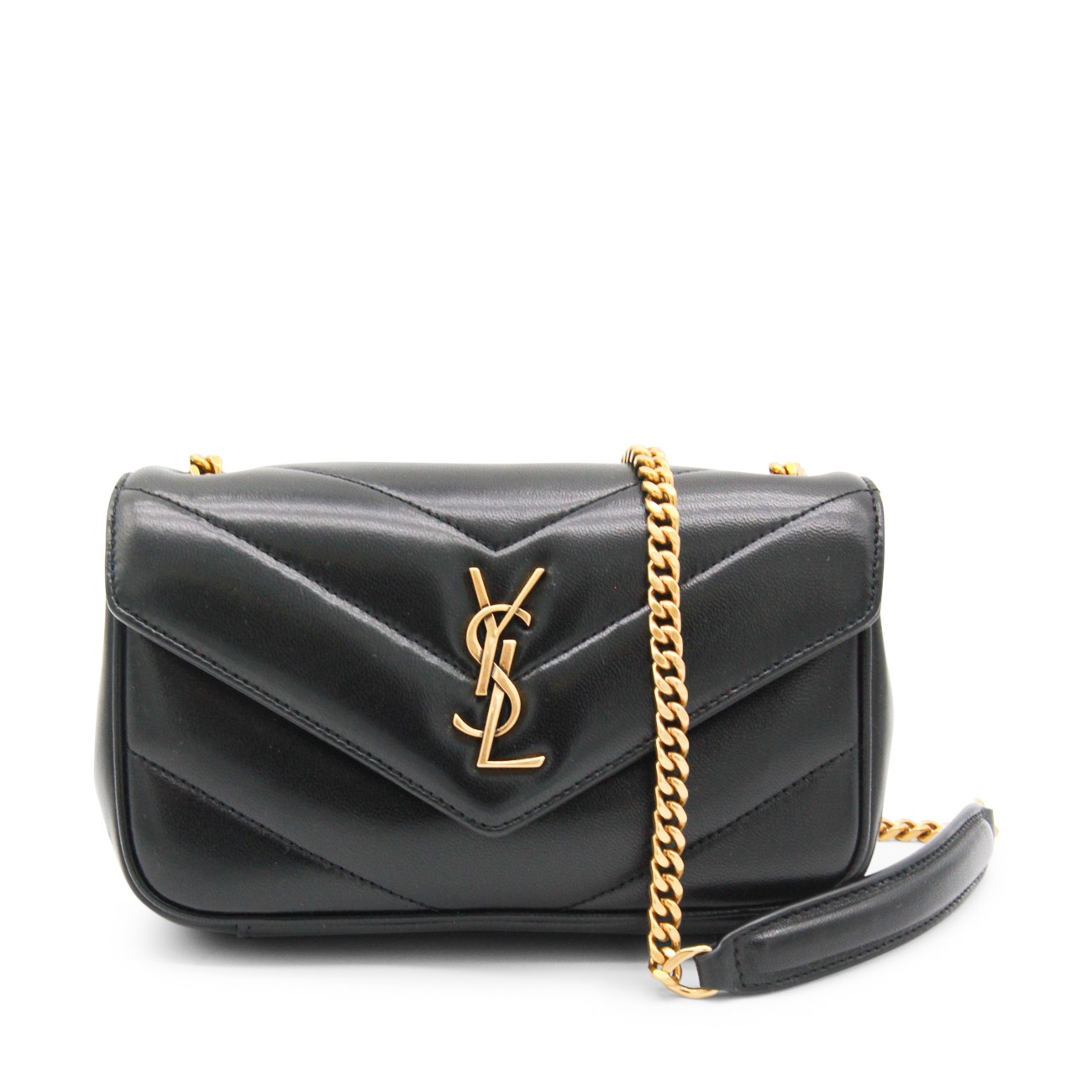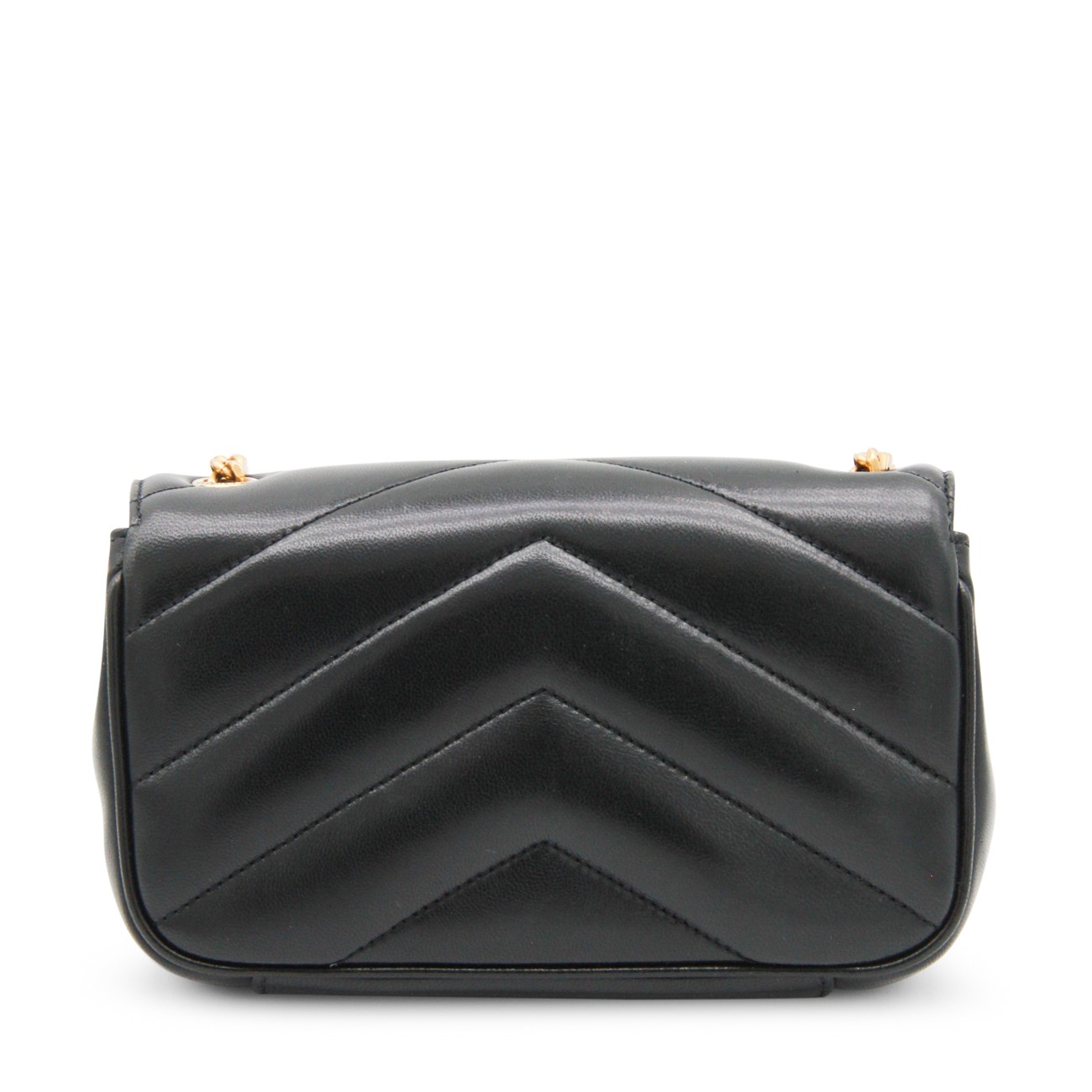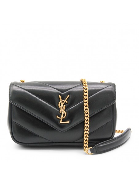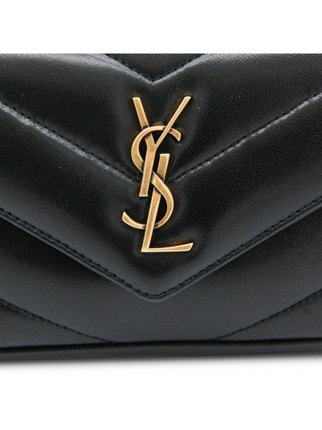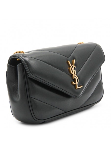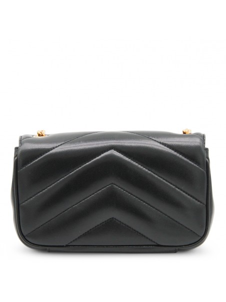 Black leather mini LouLou bag from Saint Laurent with bronze tone metal hardware, magnetic closure with logo details, flat pocket and inside pocket.