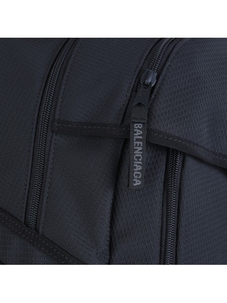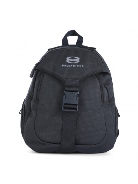 Black leather Unity Medium backpack from Balenciaga featuring top handle, adjustable shoulder straps, frontal buckle fastening, embroidered logo, frontal and lateral zip pockets, main compartment and internal zip pocket.
