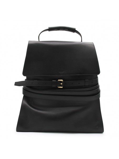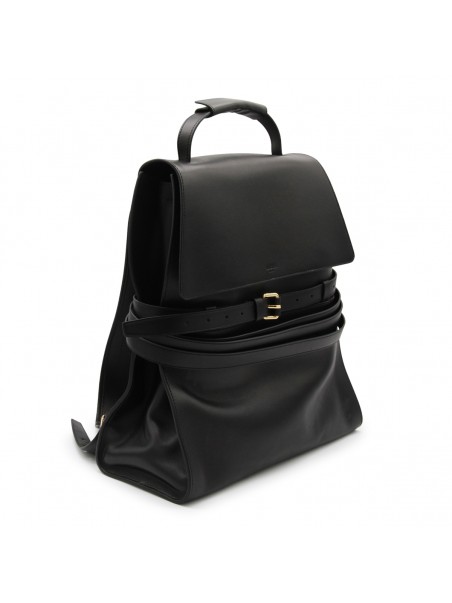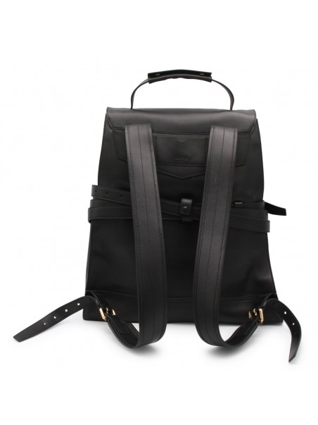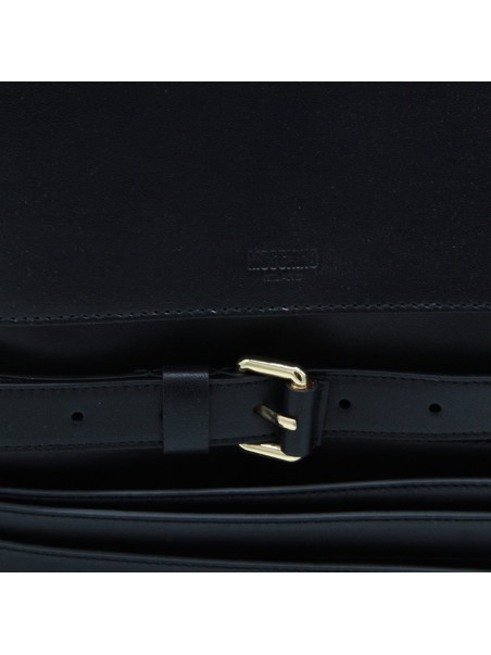 Black leather backpack from Moschino featuring frontal fastening, laces detail, gold tone hardware and adjustable straps.