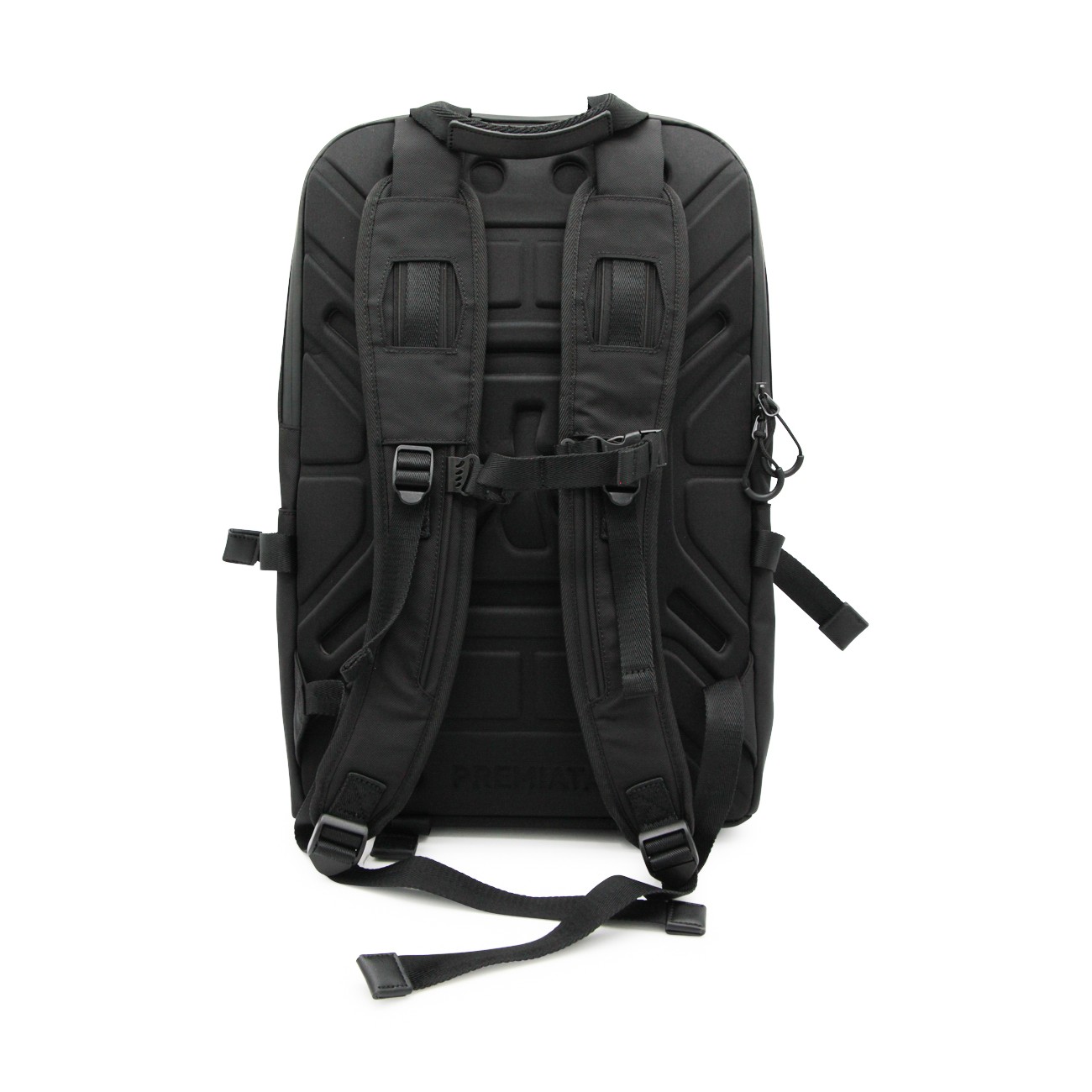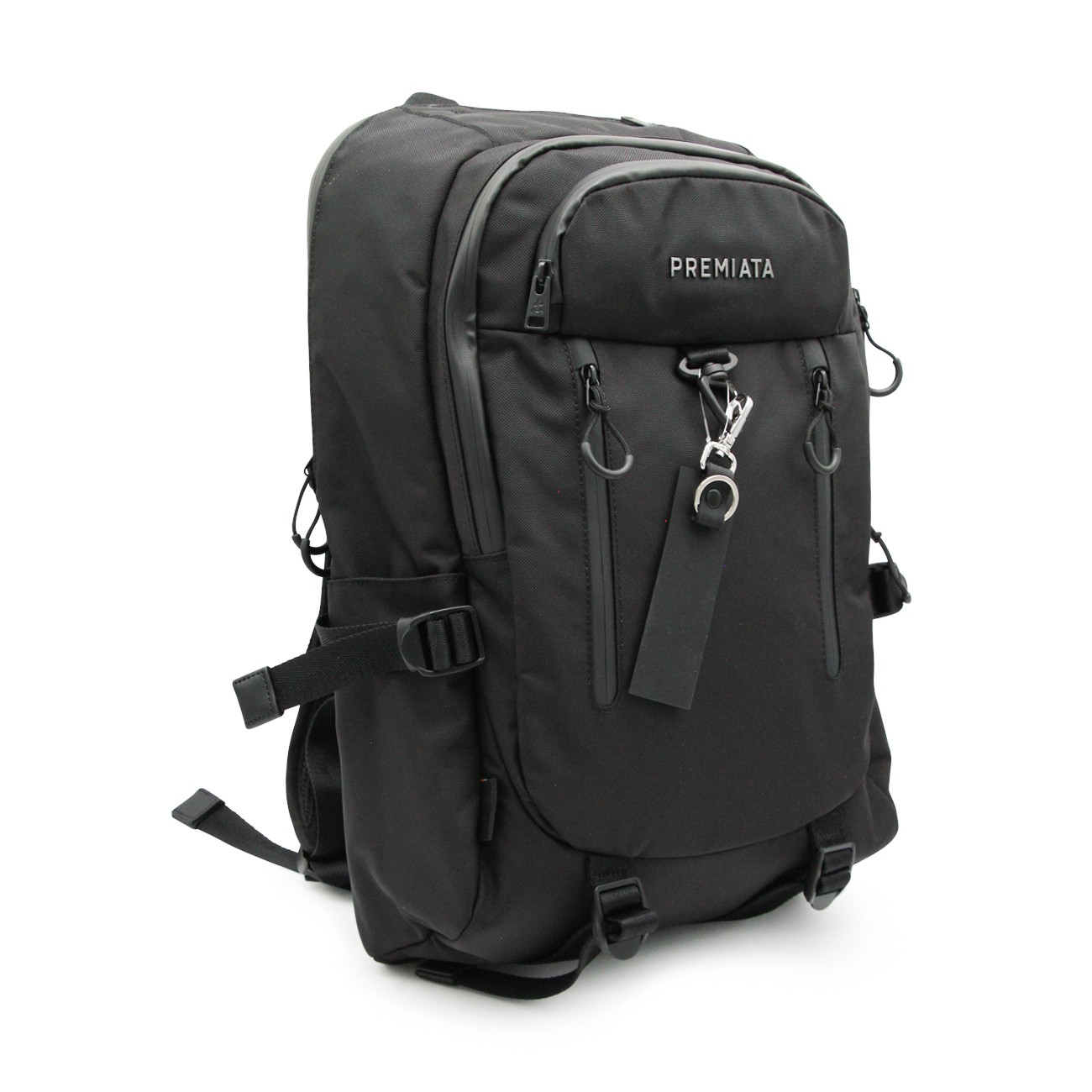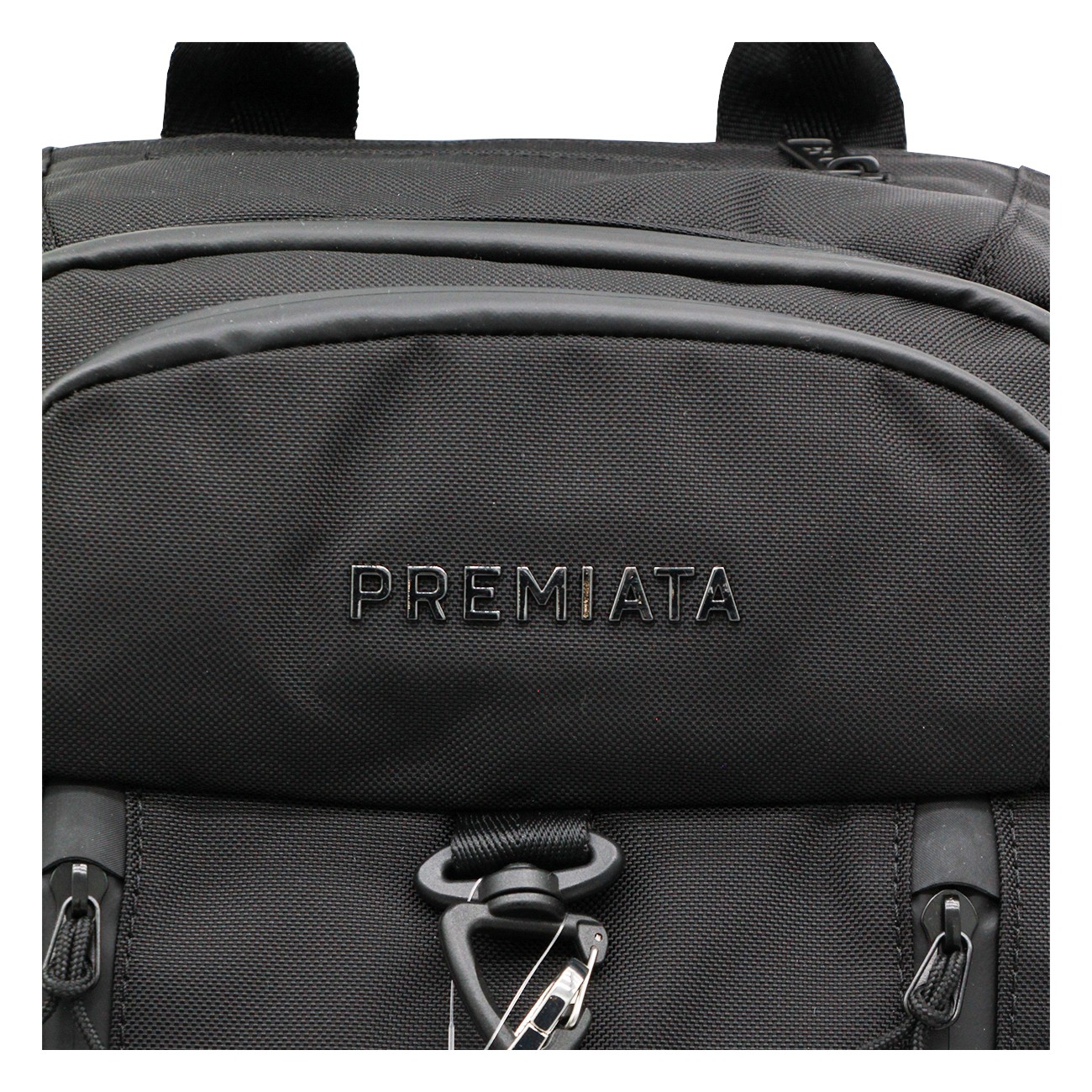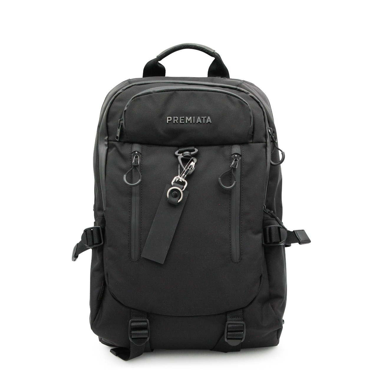 Black nylon Ventura backpack from Premiata featuring short top handle, frontal pocket, internal compartments, branded key ring, side pockets and adjustable straps.