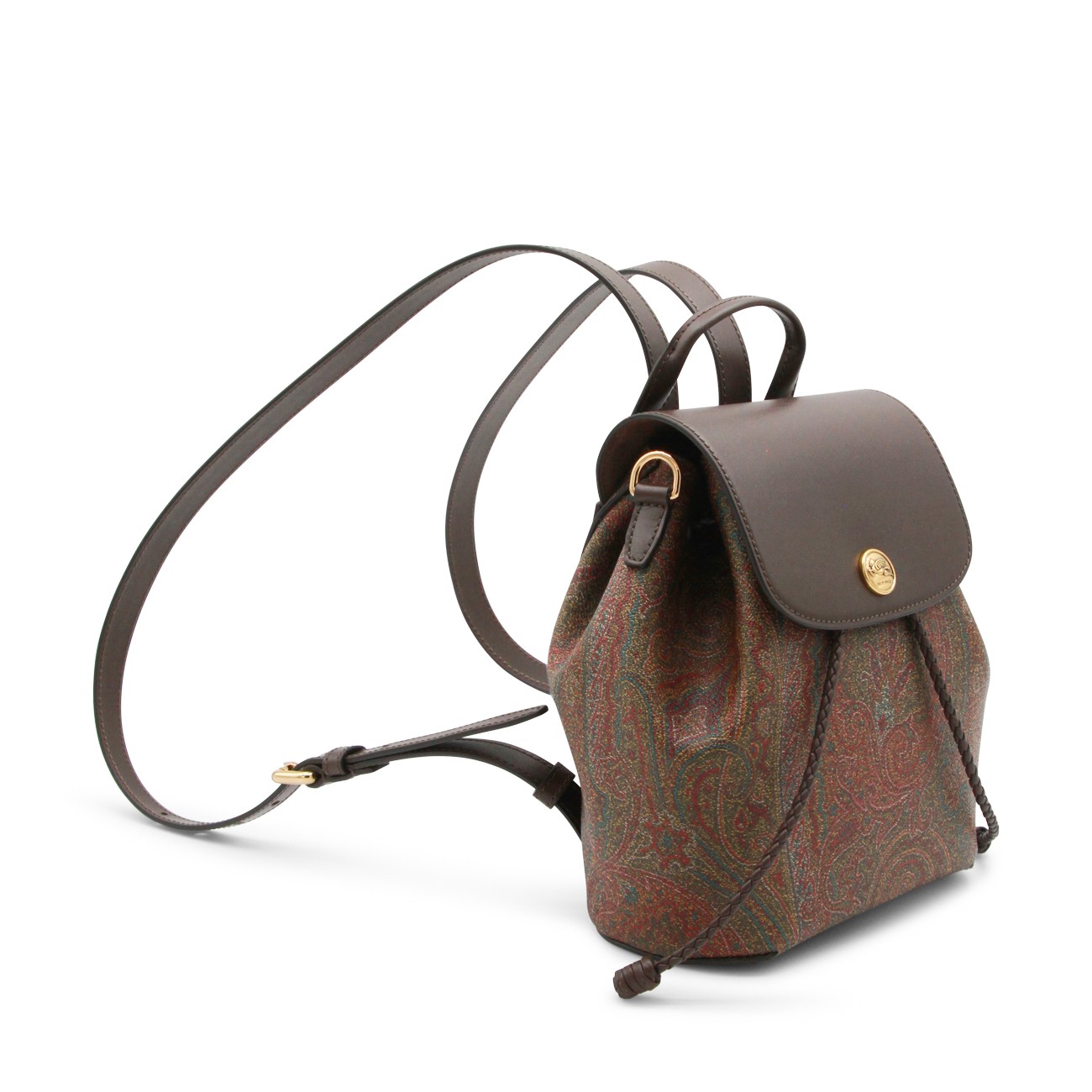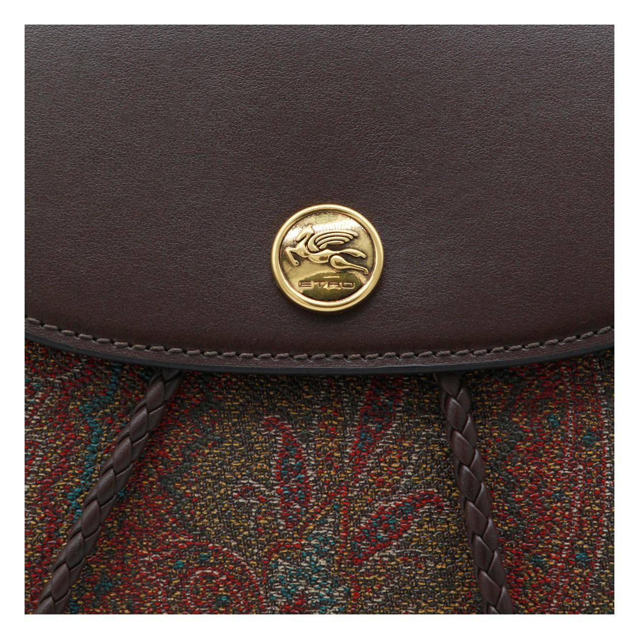 Brown backpack from Etro featuring handles, laces fastening, gold tone logo patch and adjustable straps.