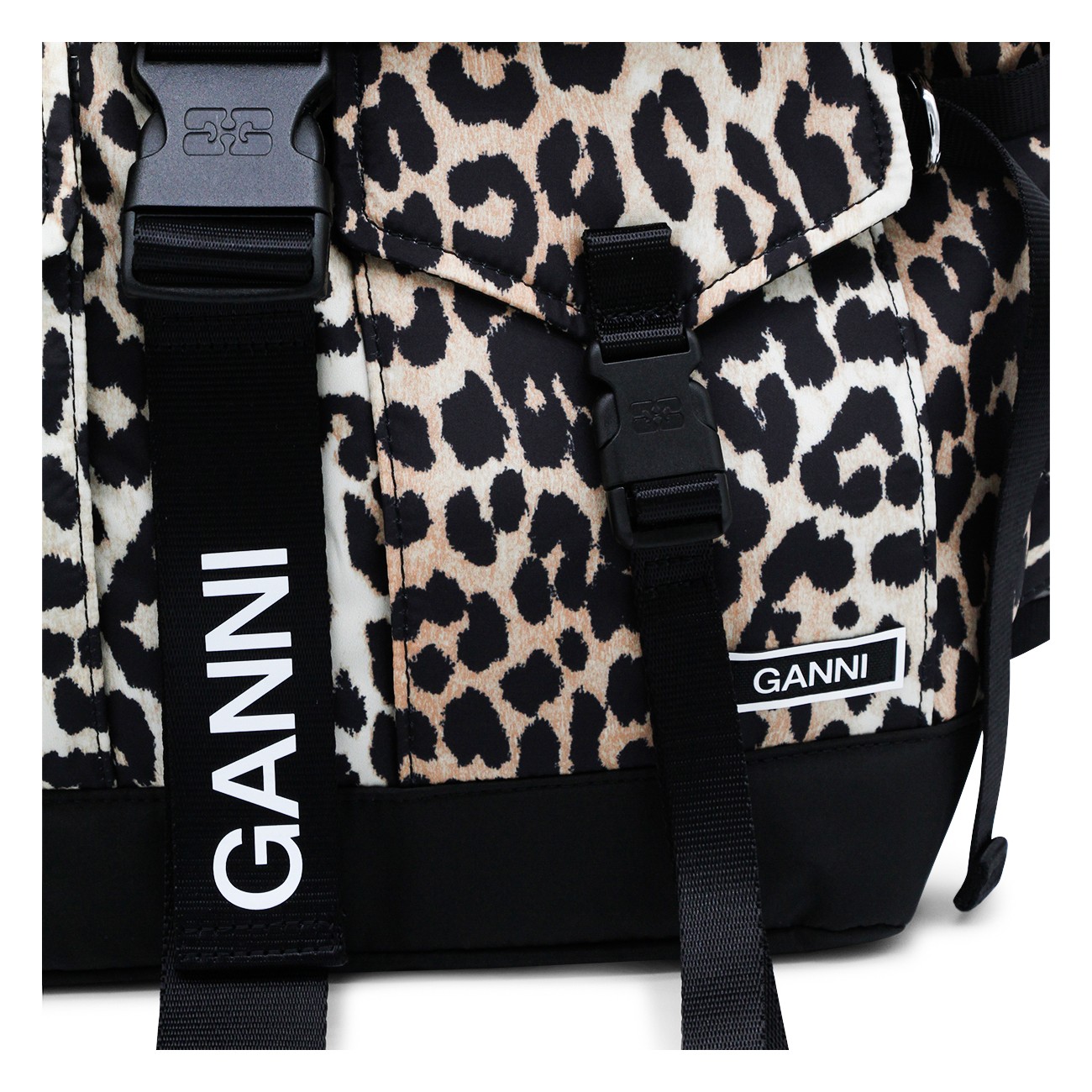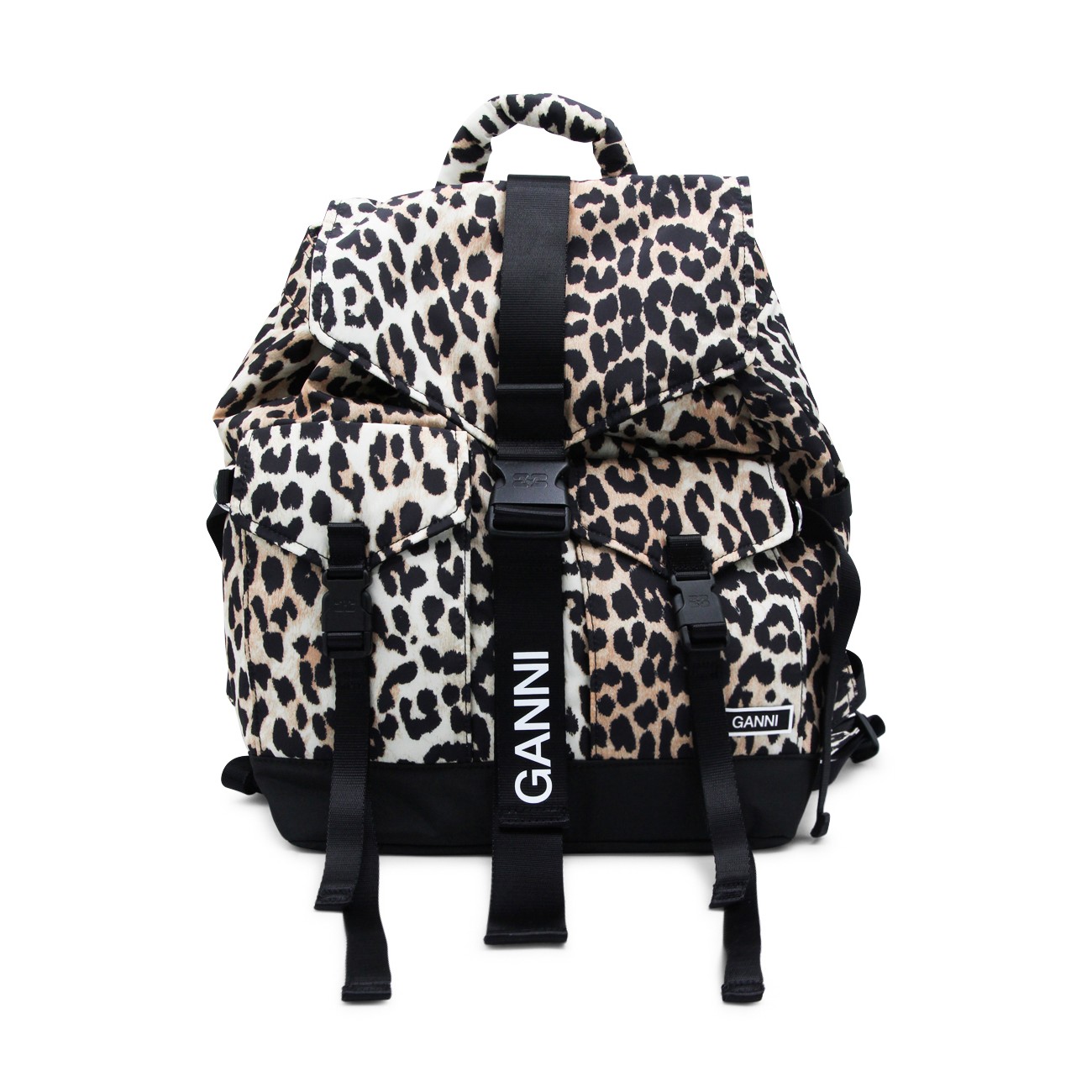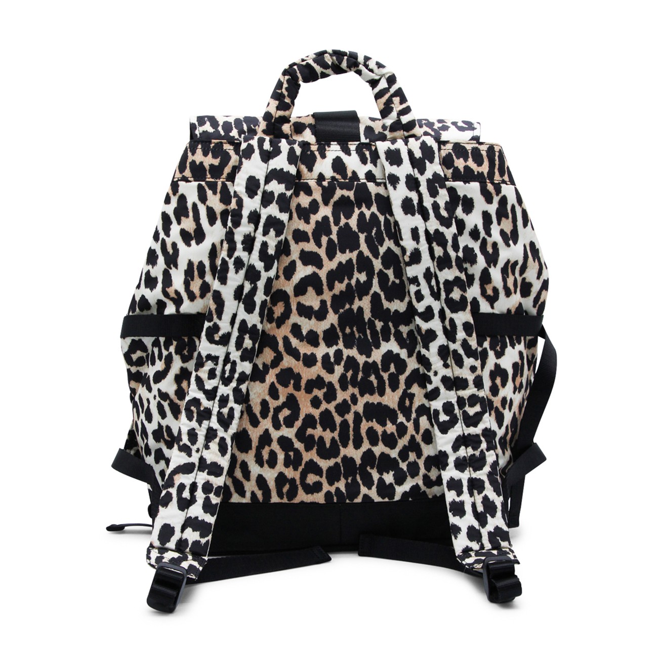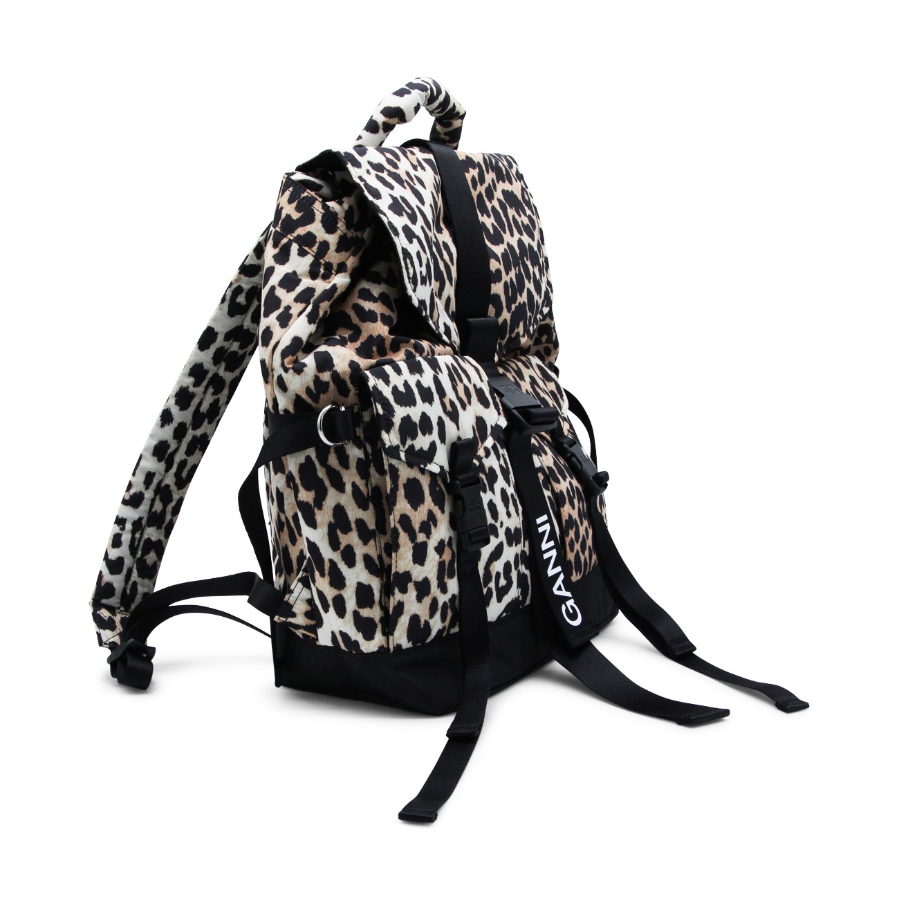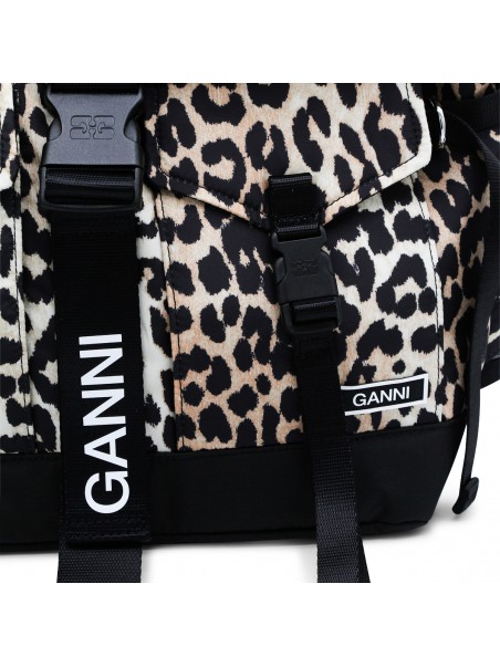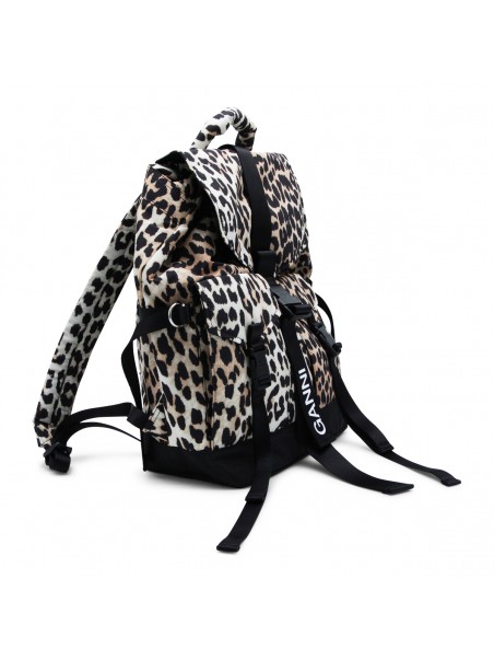 Leopard backpack from Ganni featuring adjustable shoulder straps, top handle, foldover top, front pockets, buckle fastening and main compartment.