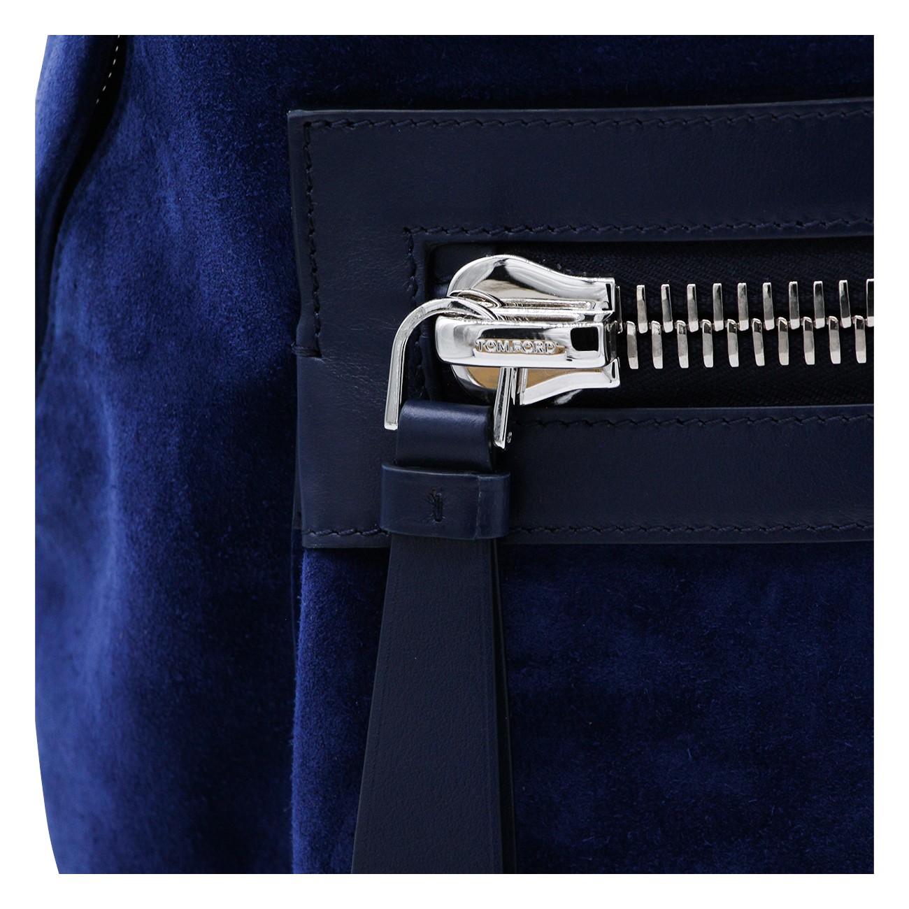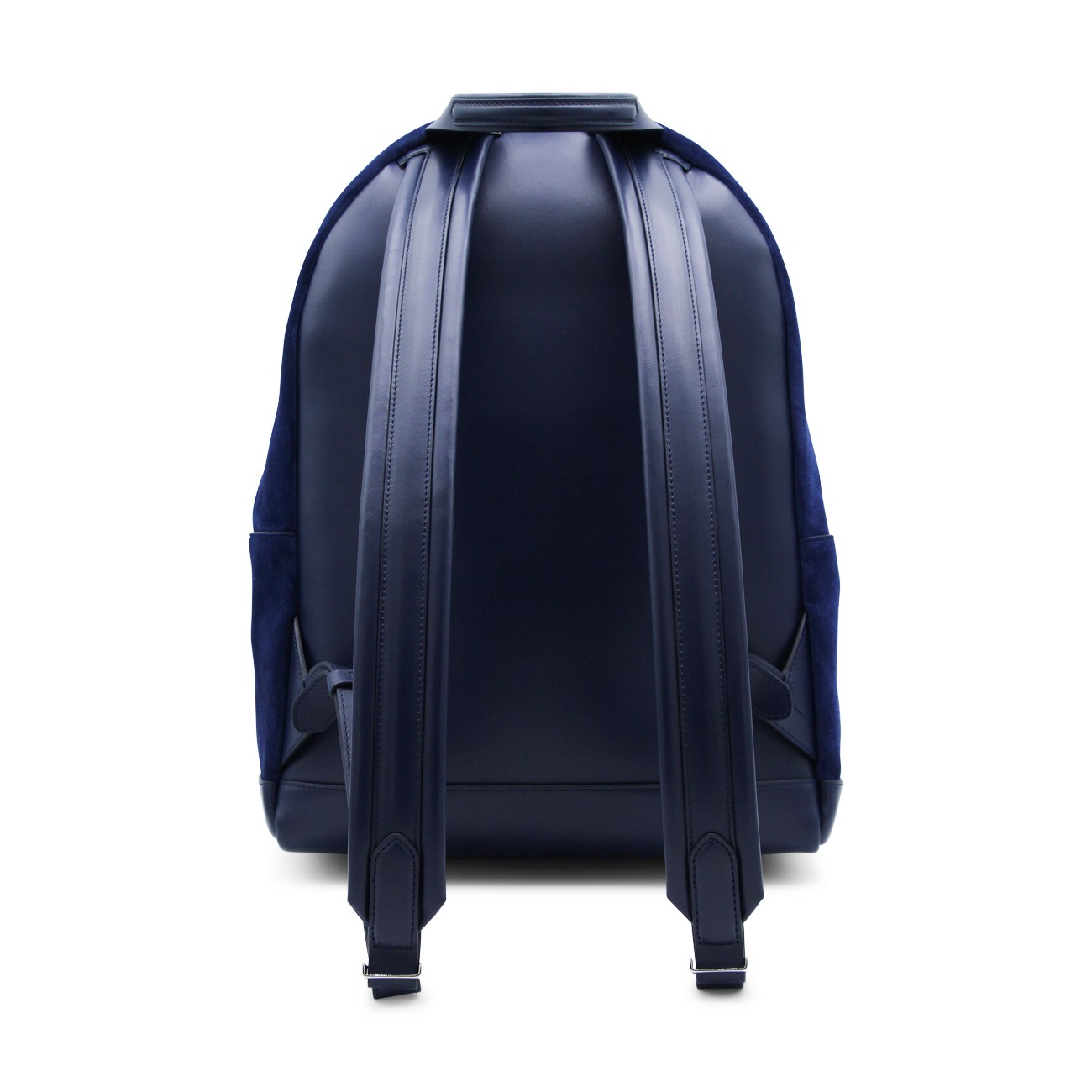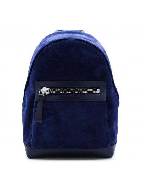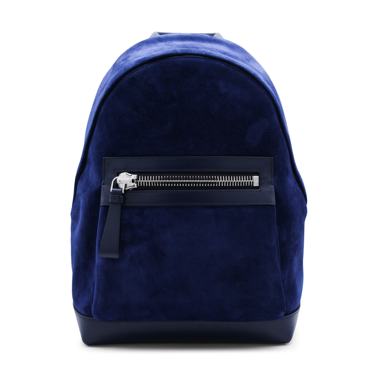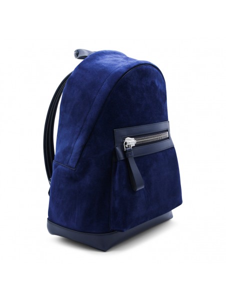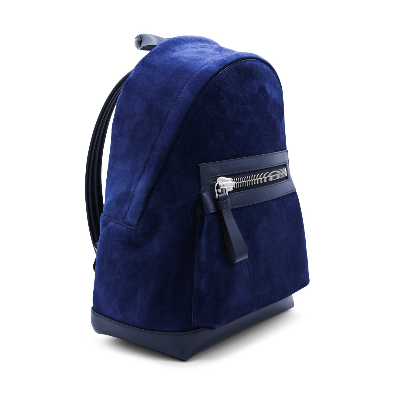 Blue suede backpack from Tom Ford featuring top handle, two adjustable shoulder straps, double slider zip closure, front zip pocket, internal zip and snap button pockets.