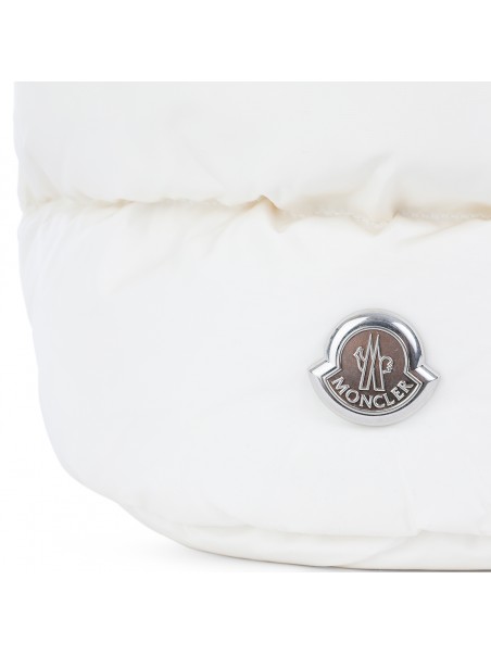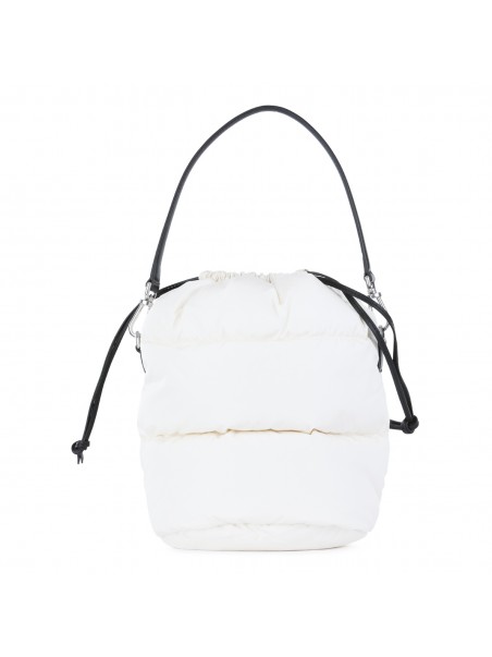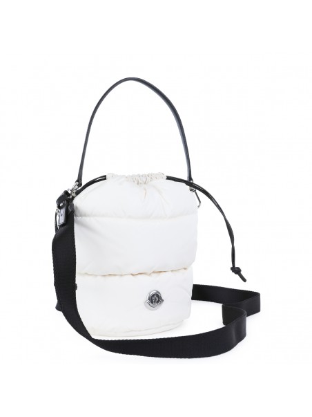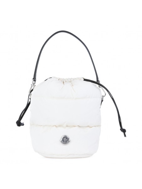White satchel from Moncler featuring top handle, drawstrings, frontal logo patch and inside pocket.
