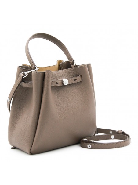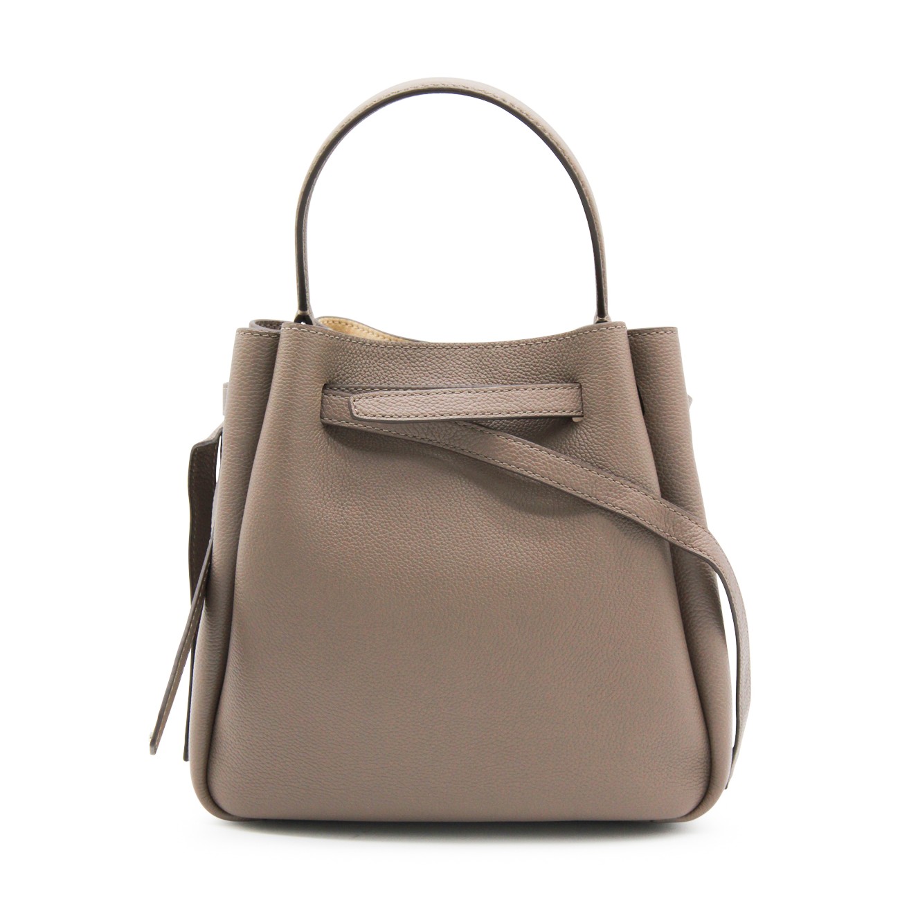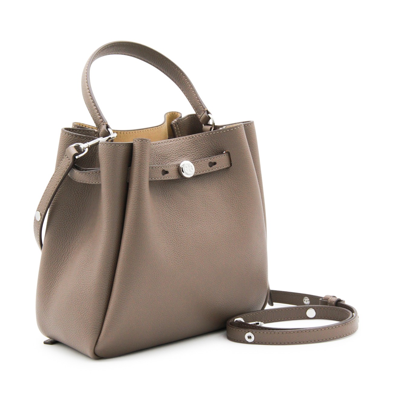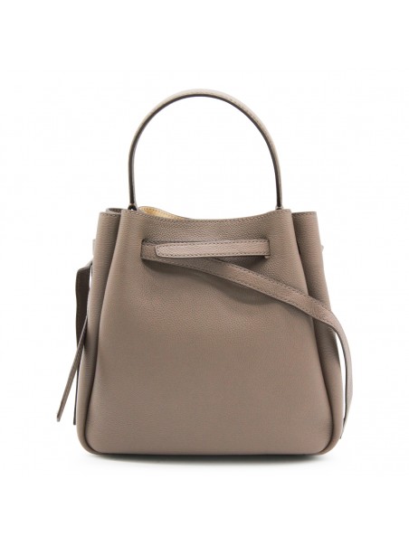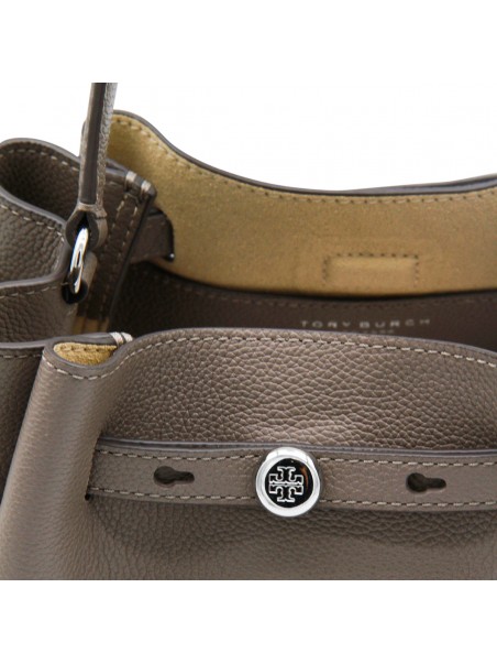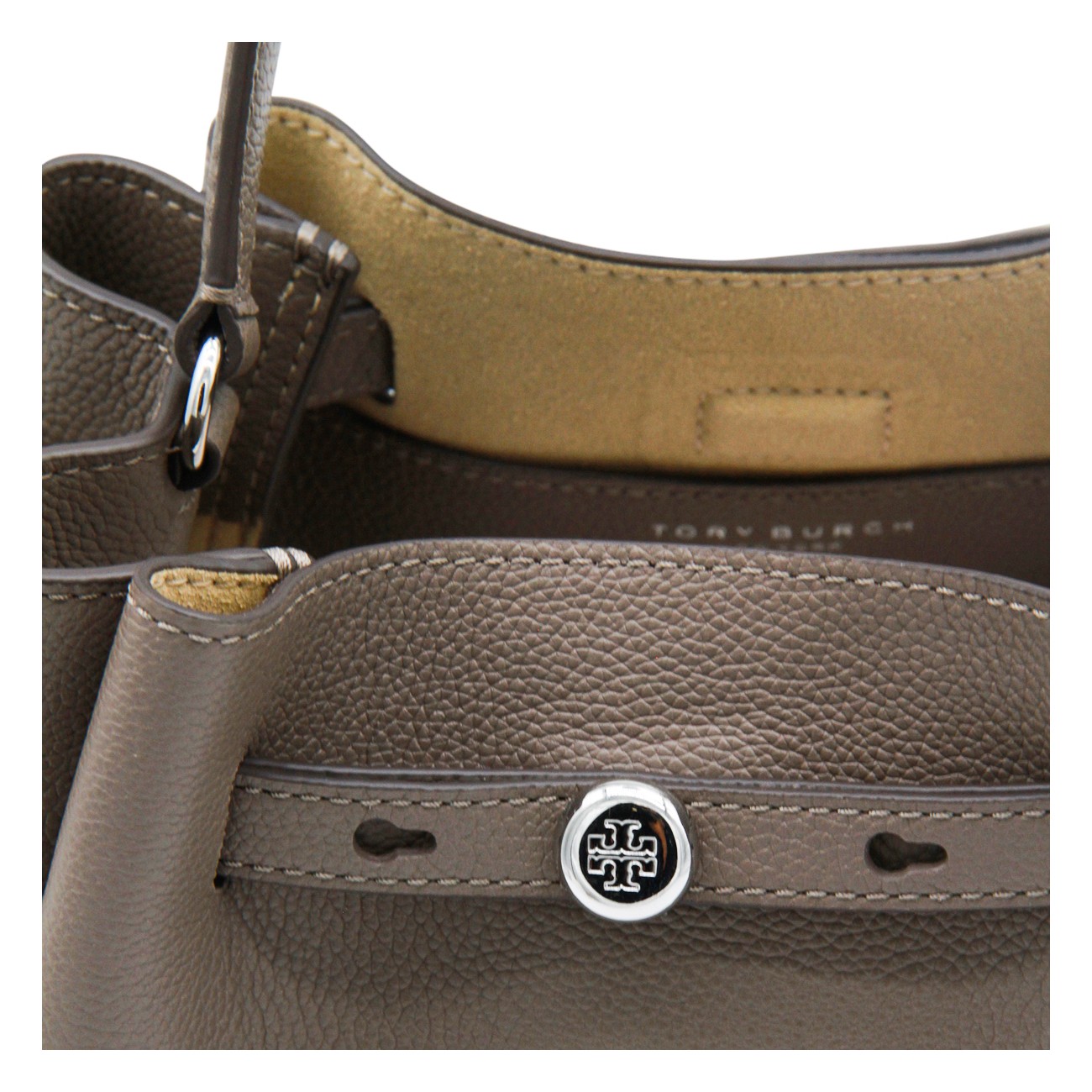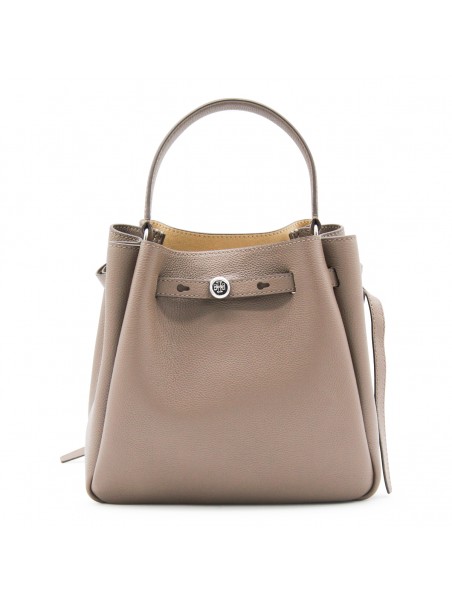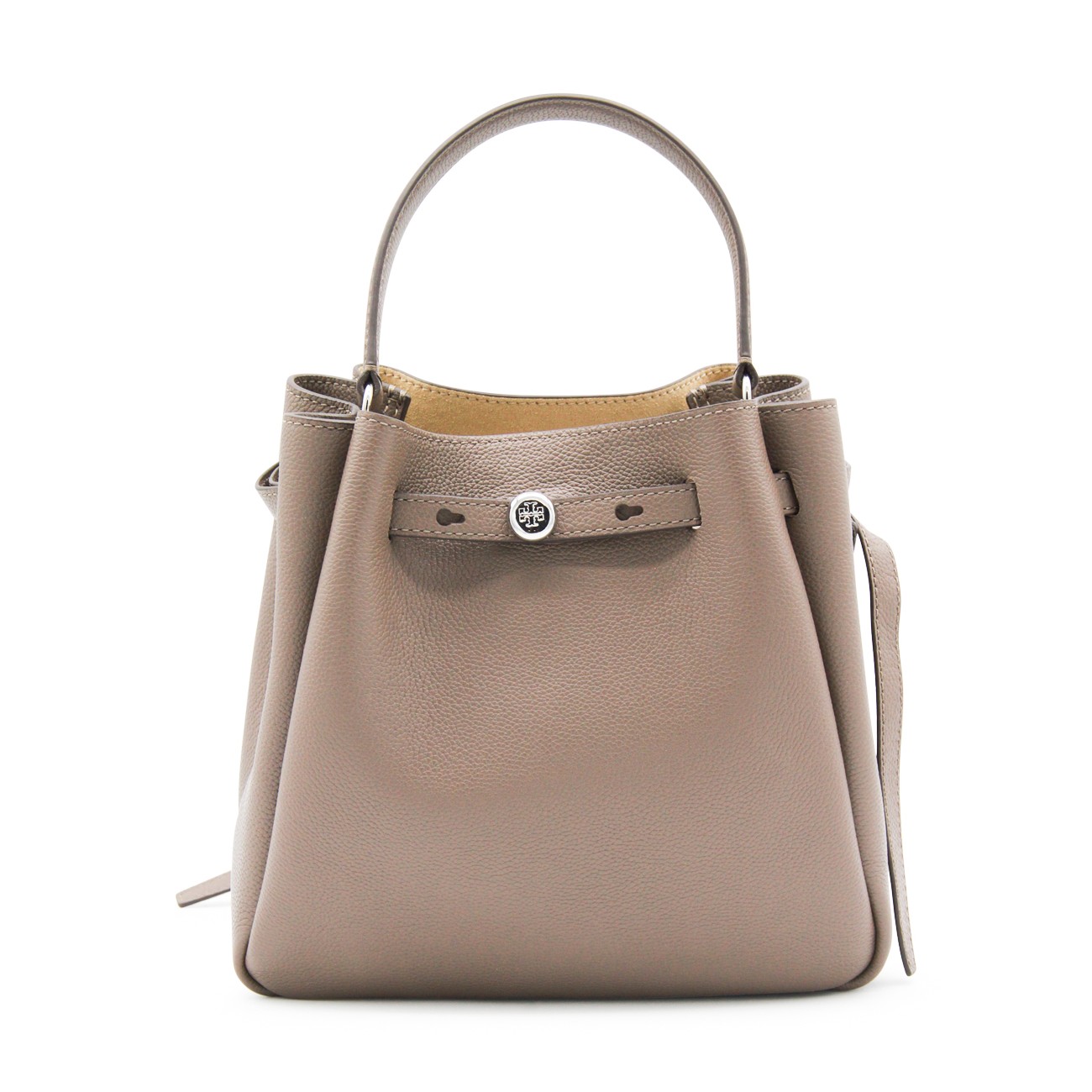Beige leather Romy satchel from Tory Burch featuring top handle, silver tone hardware, upper fastening, inside pocket and adjustable strap.