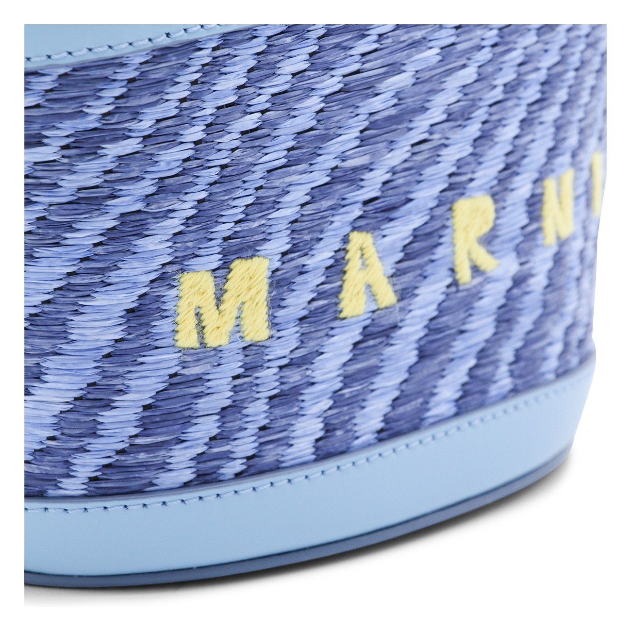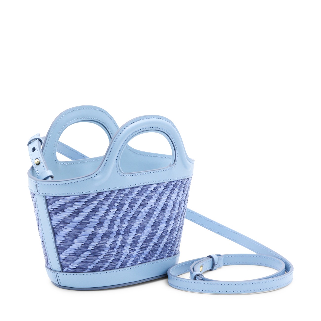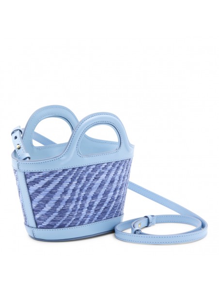 Light blue Micro Tropicalia satchel from Marni featuring top handles, frontal logo, adjustable and removable strap, raffia detail and inside pocket.