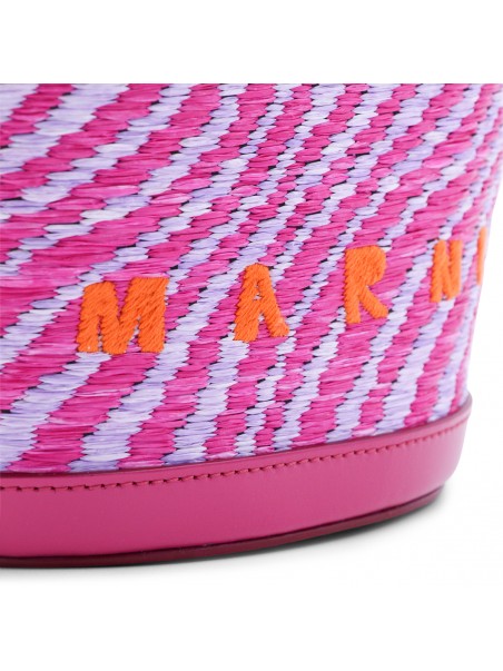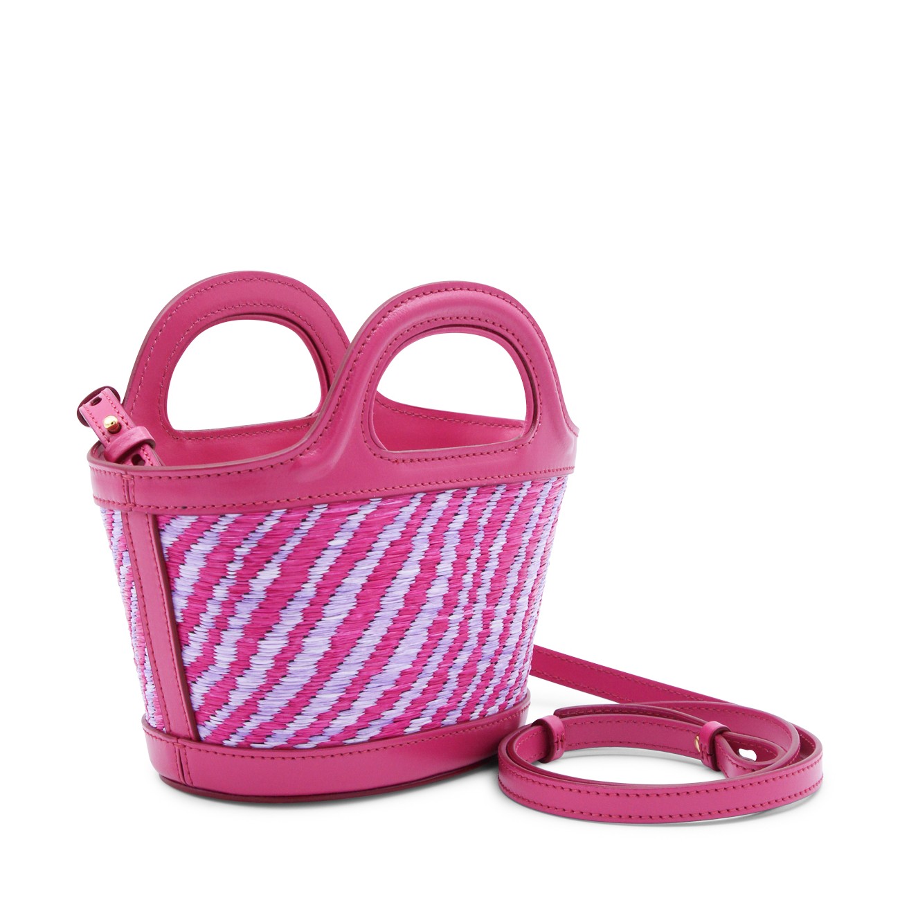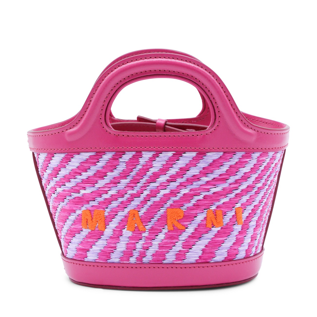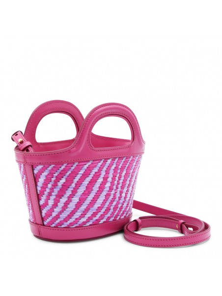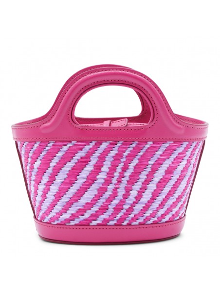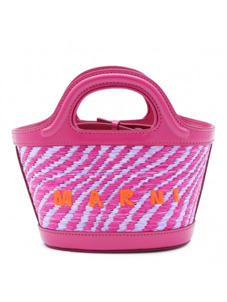 Dark pink Micro Tropicalia satchel from Marni featuring top handles, frontal logo, adjustable and removable strap, raffia detail and inside pocket.