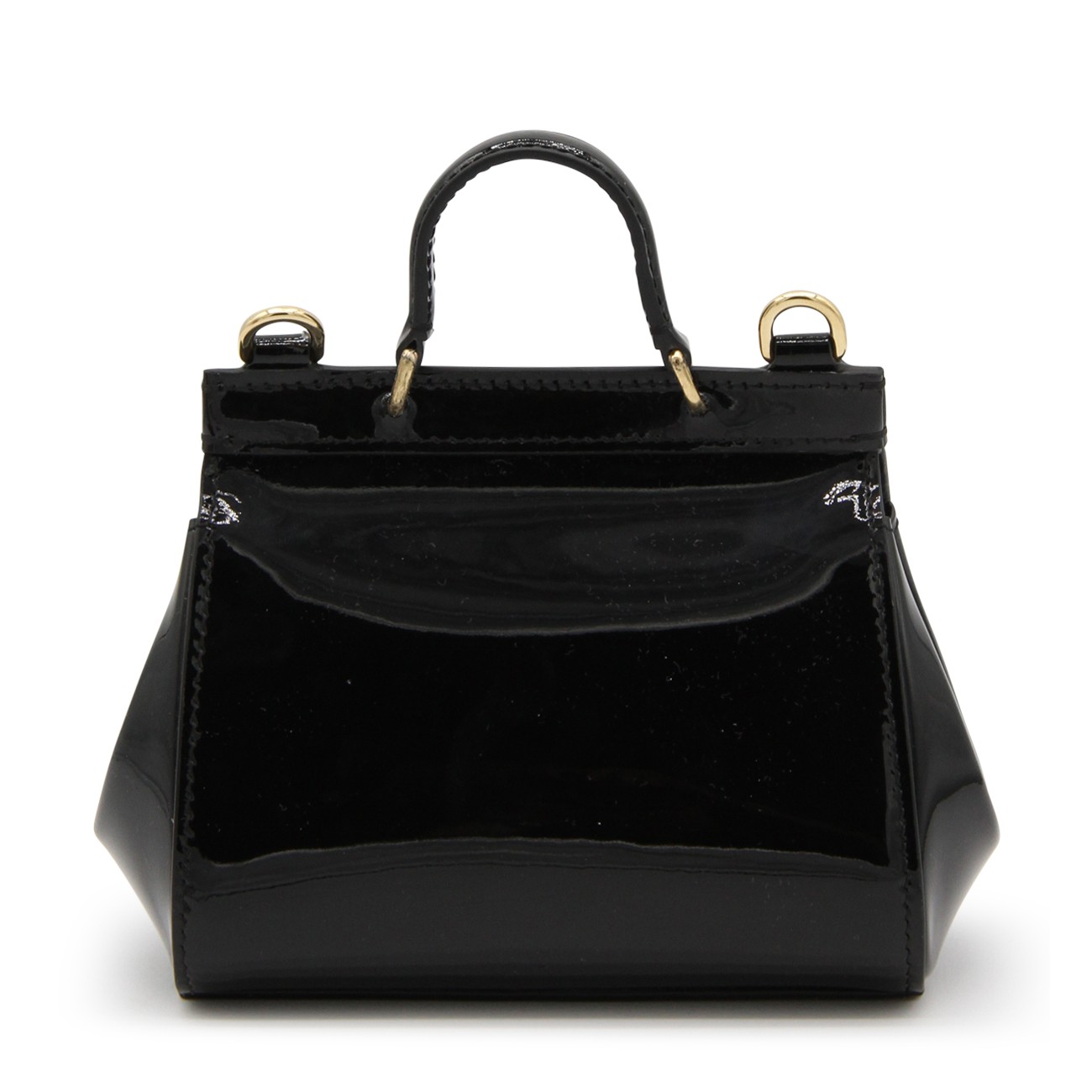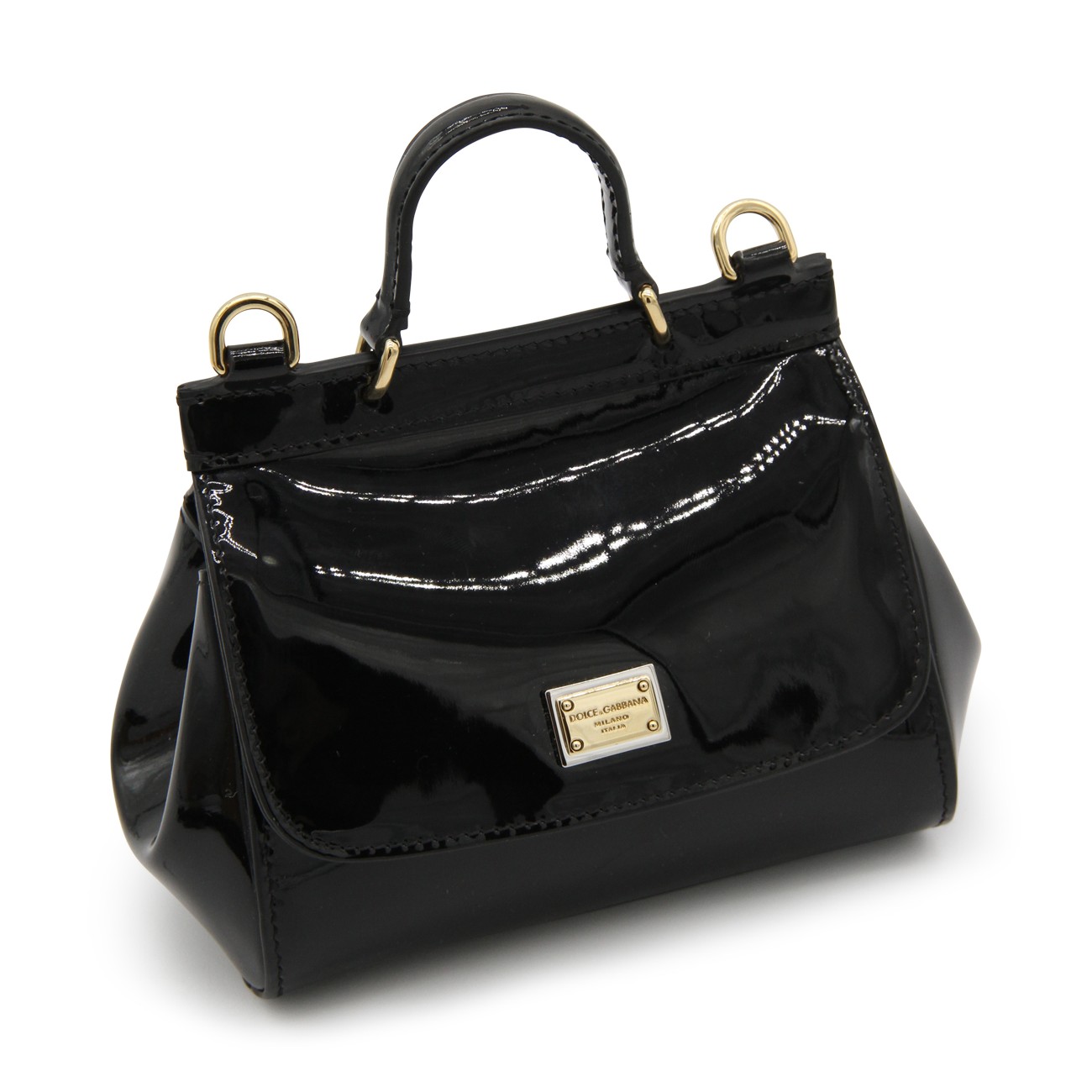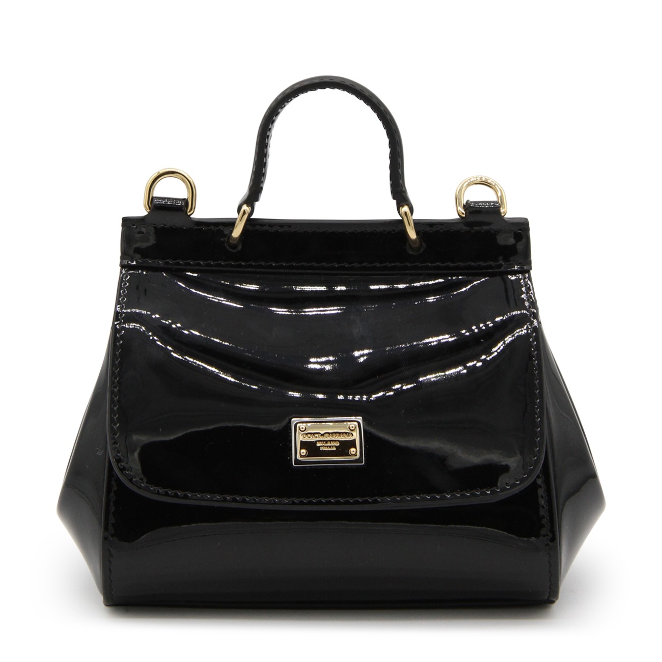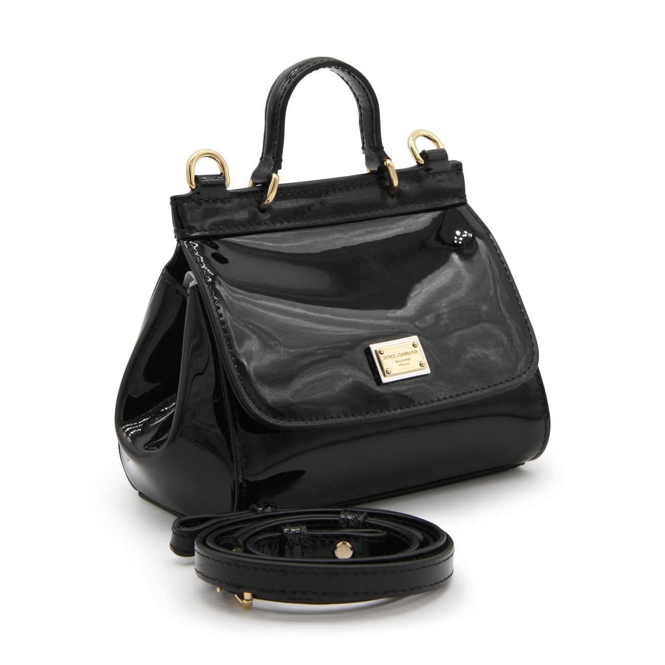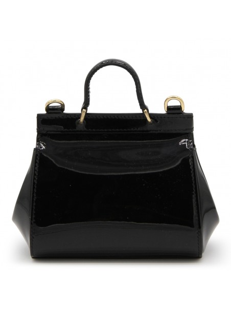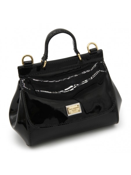 Black leather Sicily top handle bag from Dolce & Gabbana featuring a round top handle, flap closure, magnetic fastening, gold-tone hardware, logo plaque, adjustable shoulder strap and internal slip pocket.