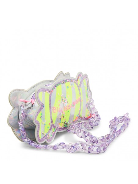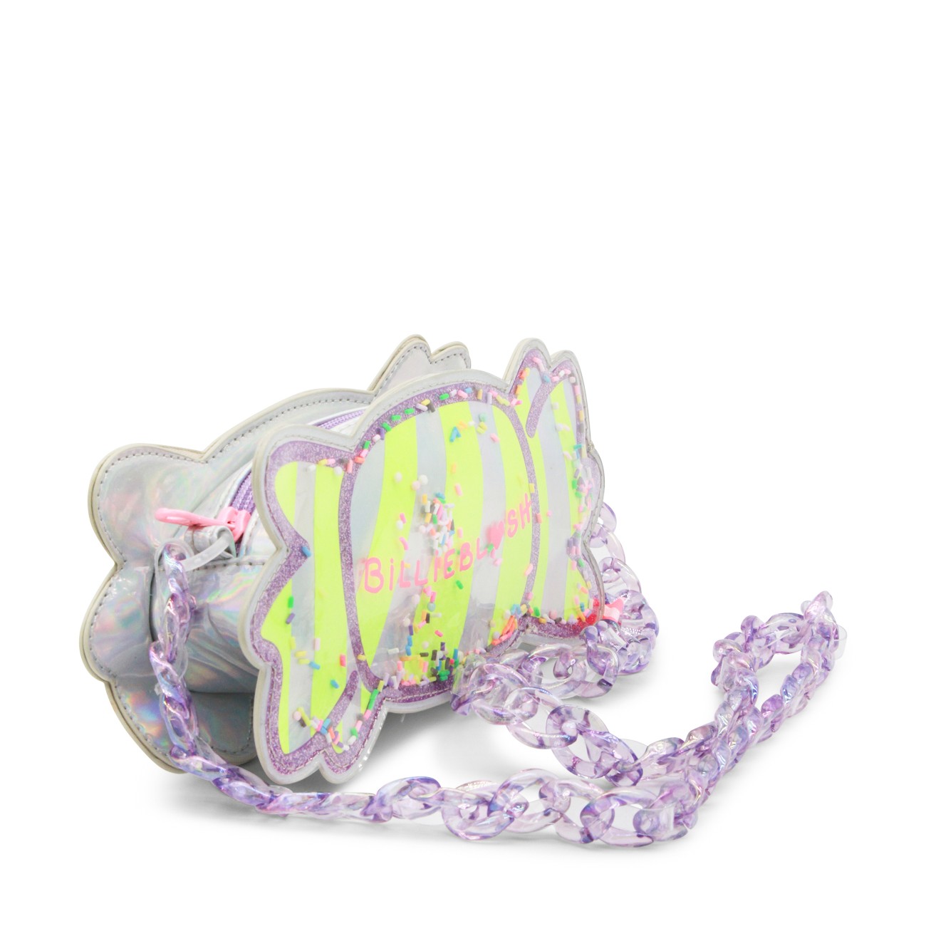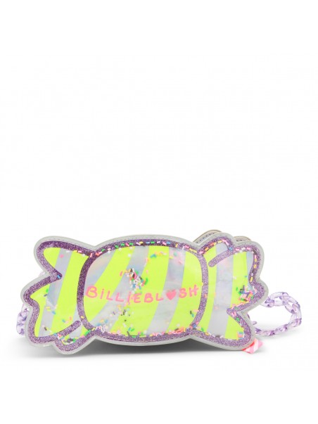 White clutch from Billieblush featuring candy details, glitter and neon, multicolor chain shoulder strap, zip fastening, main compartment and frontal logo stamp.