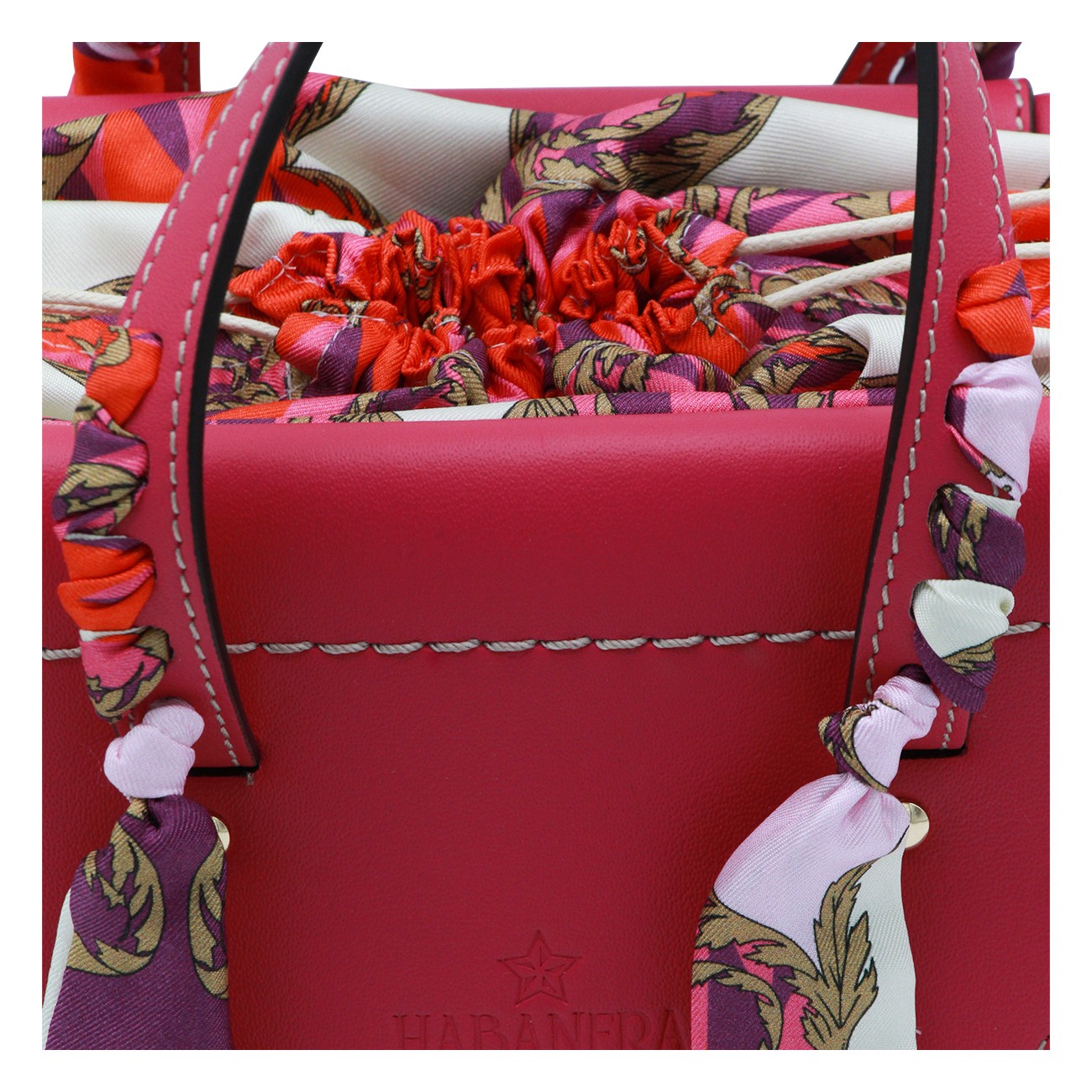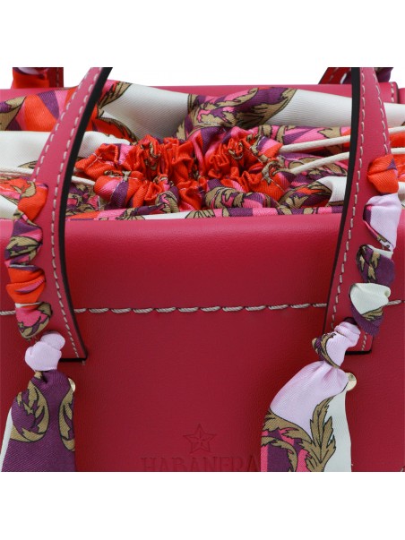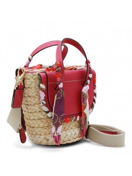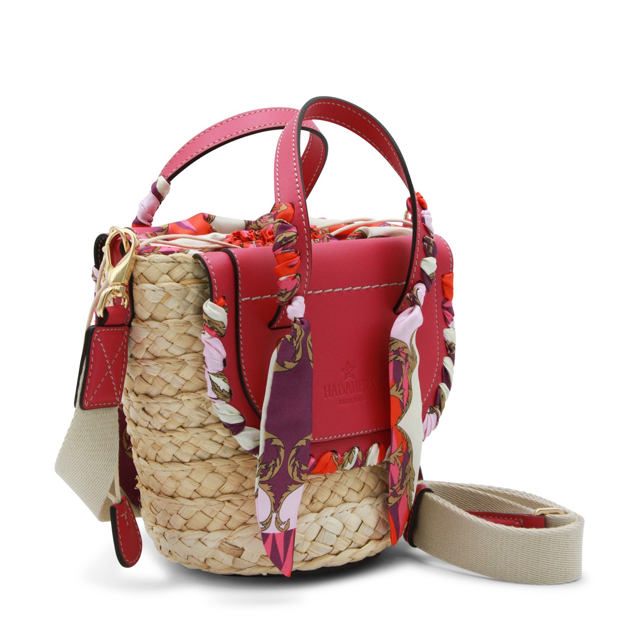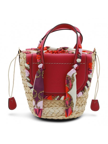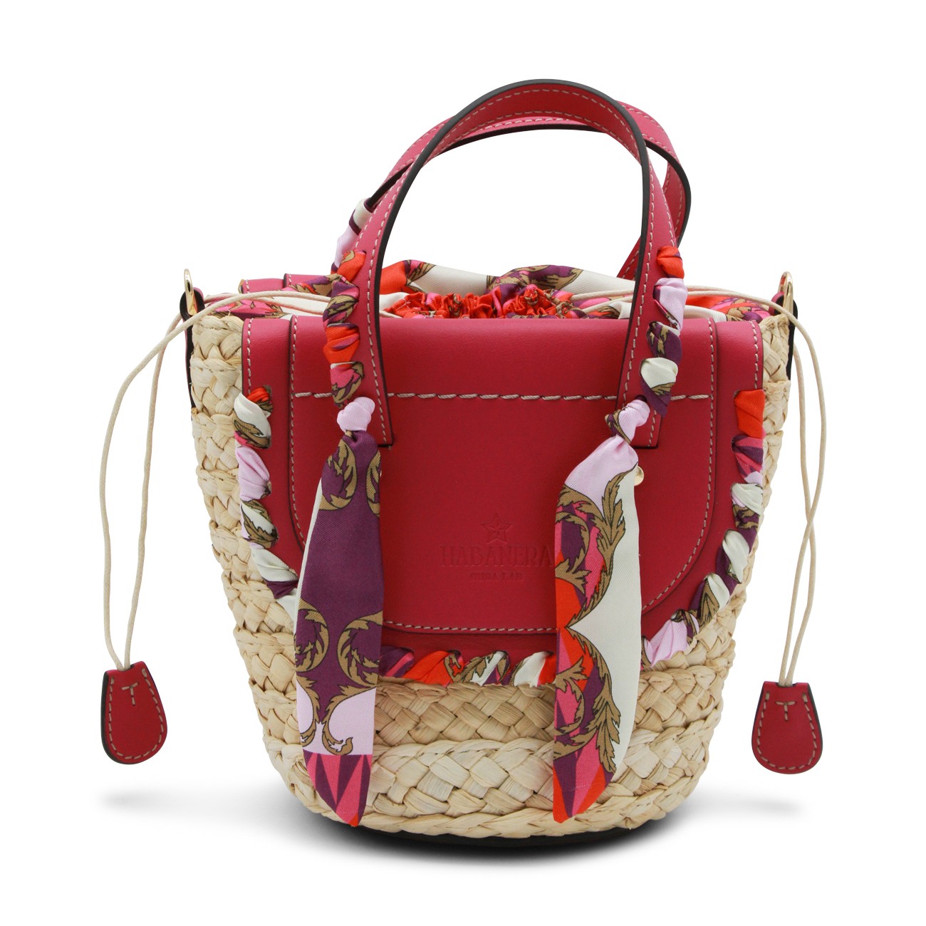 Red raffia satchel from Cuba Lab featuring top handles, silk details, drawstring, raffia and main compartment.