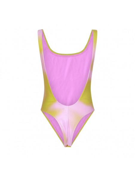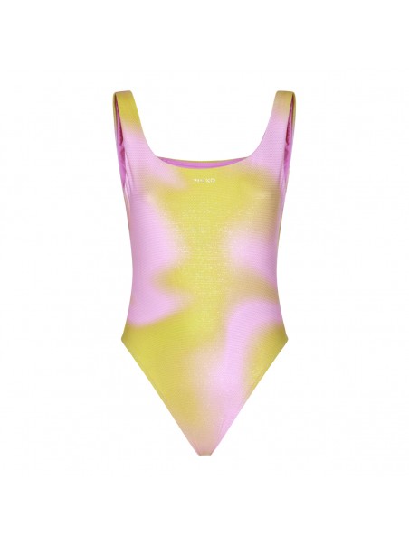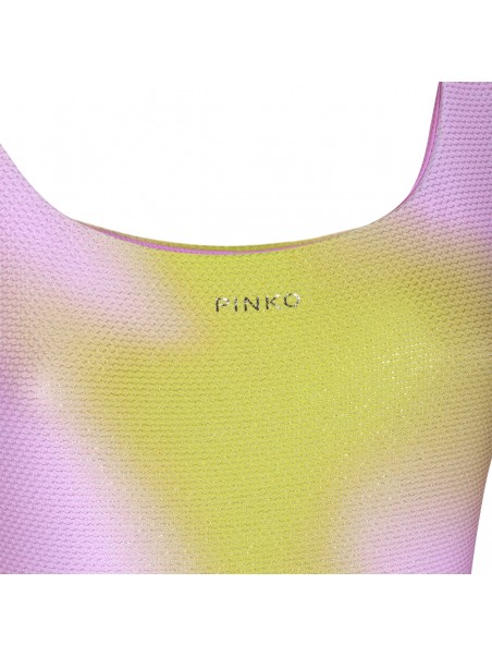 Pink and yellow beachwear from Pinko featuring round deep collar, sleeveless and all over print.