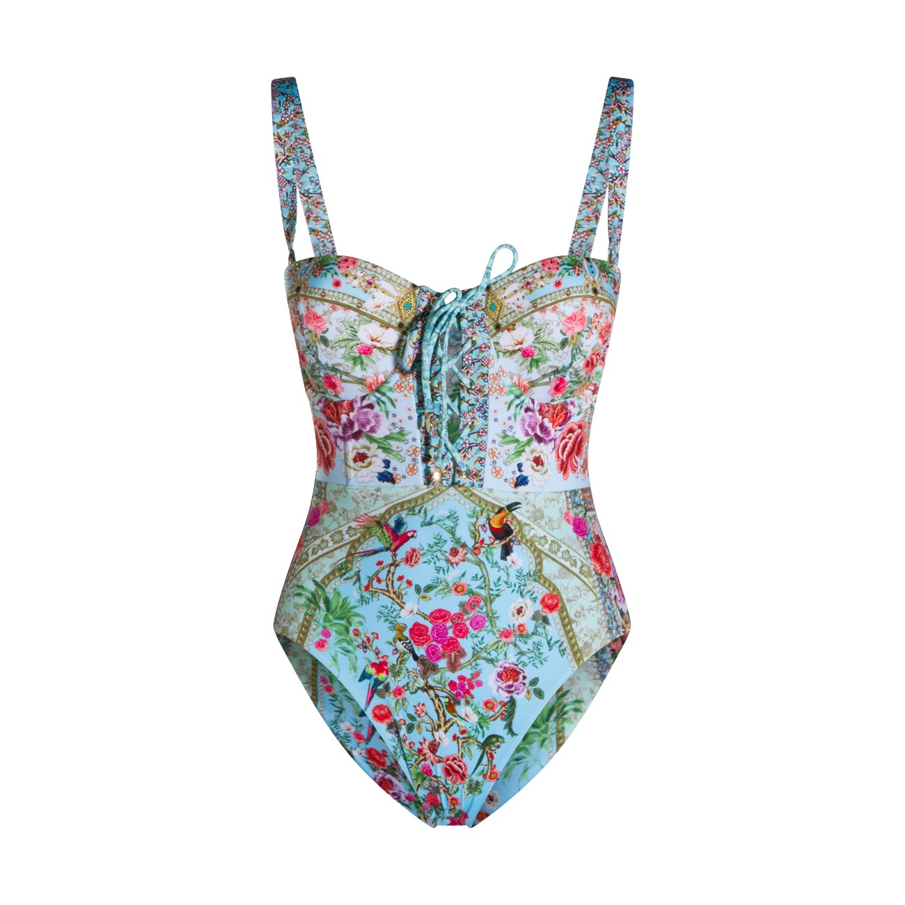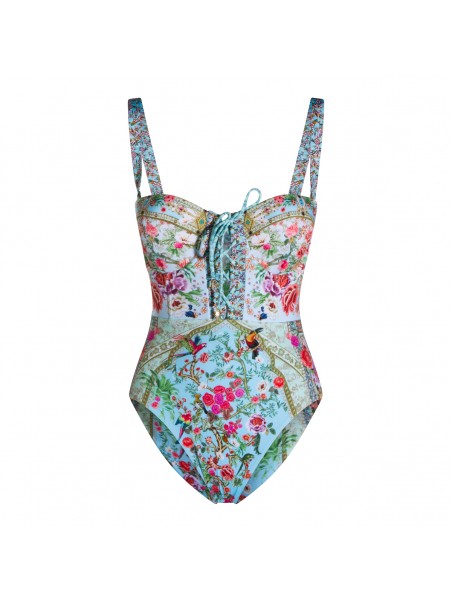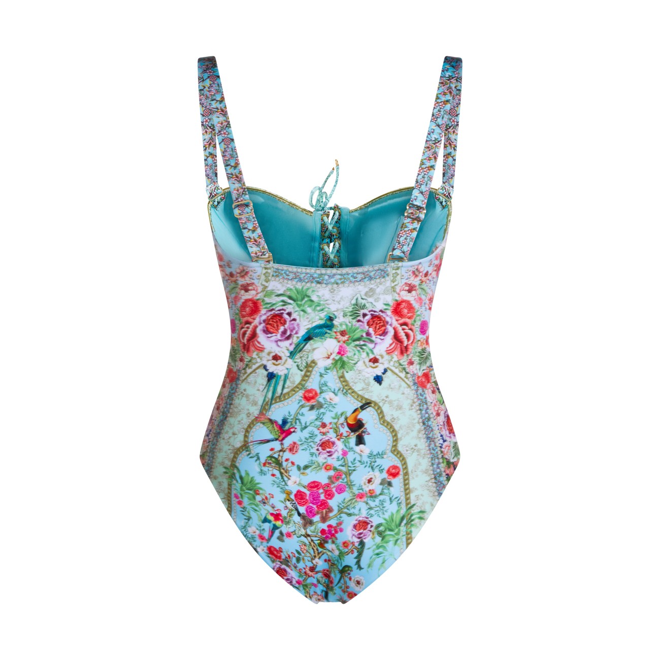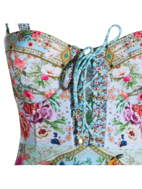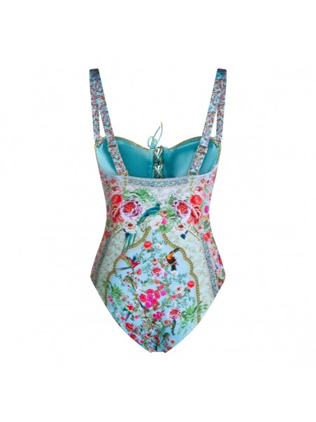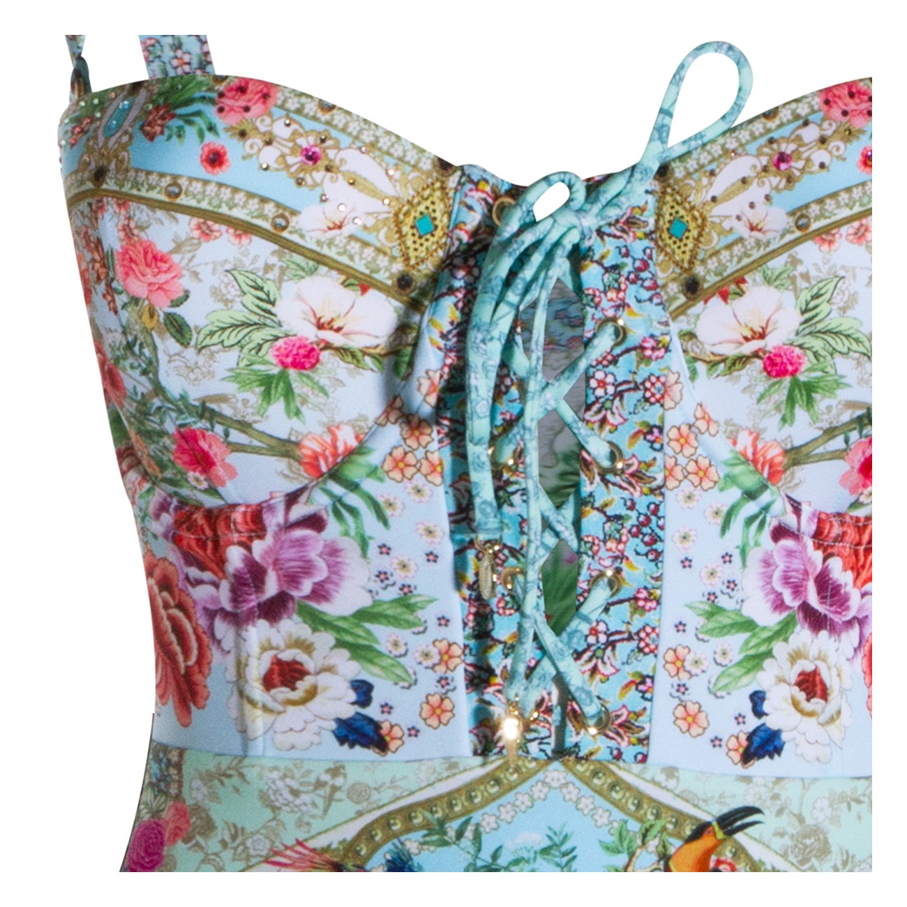 Light blue beachwear from Camilla featuring heart neck, adjustable straps, regular-to-low leg line, crystal embellishemnt, all over stamp and soft cups.
