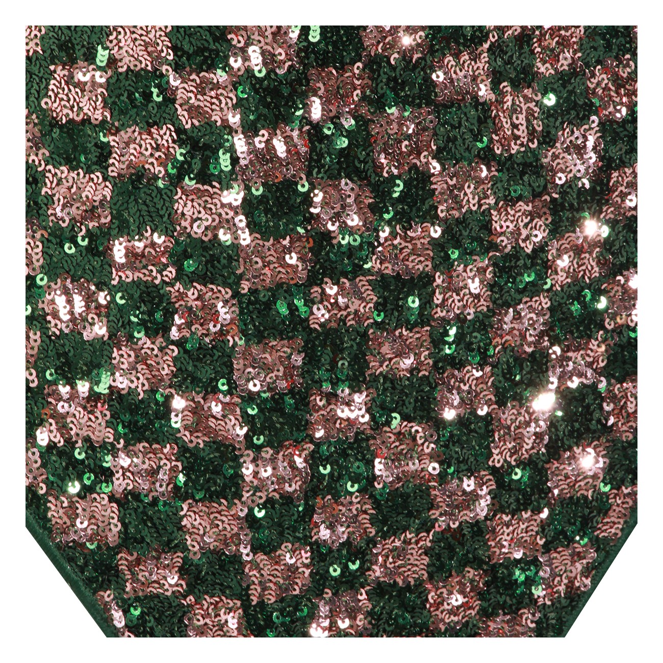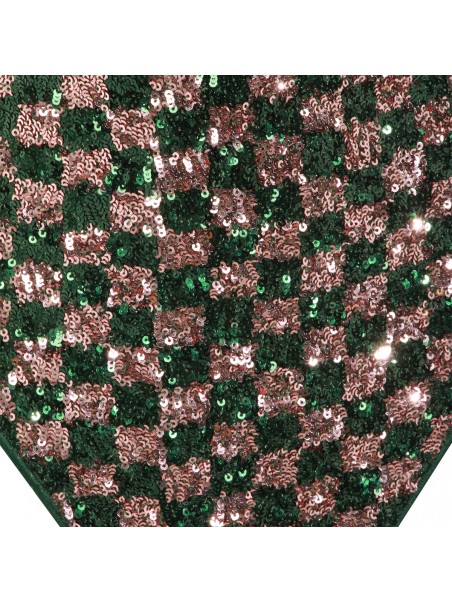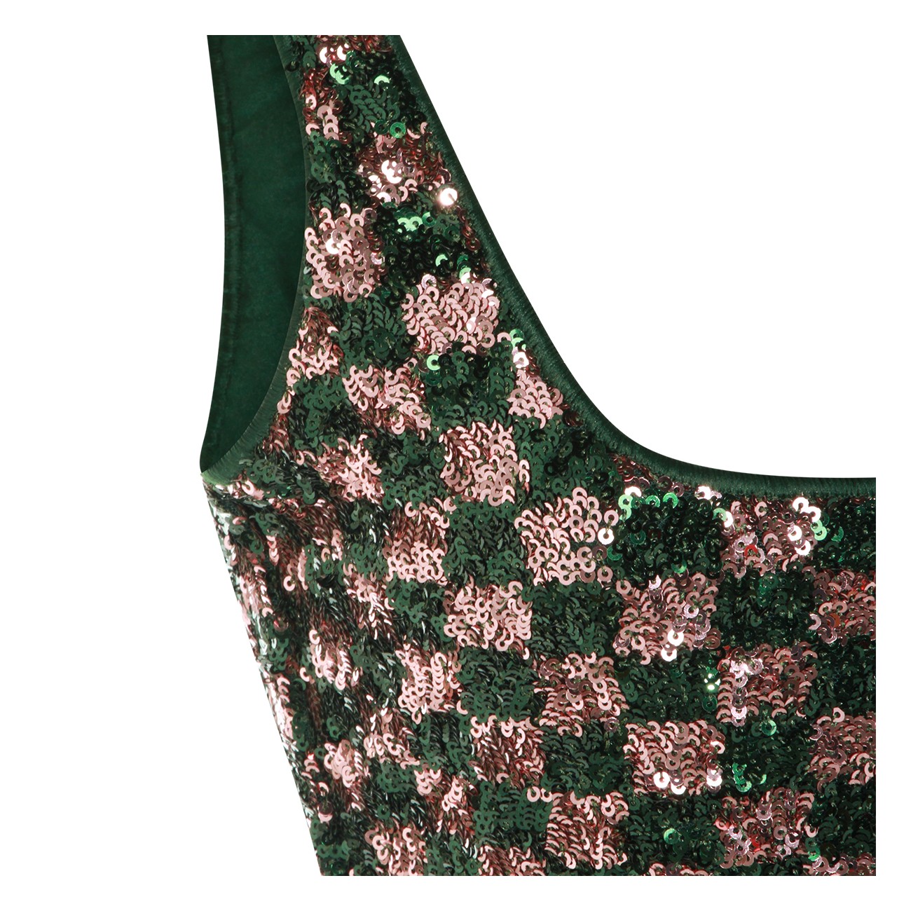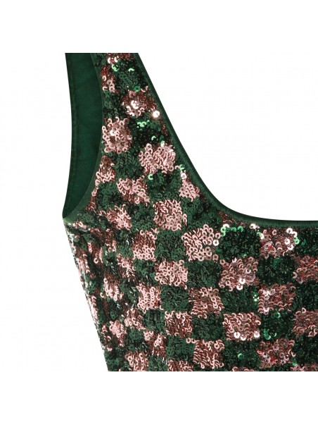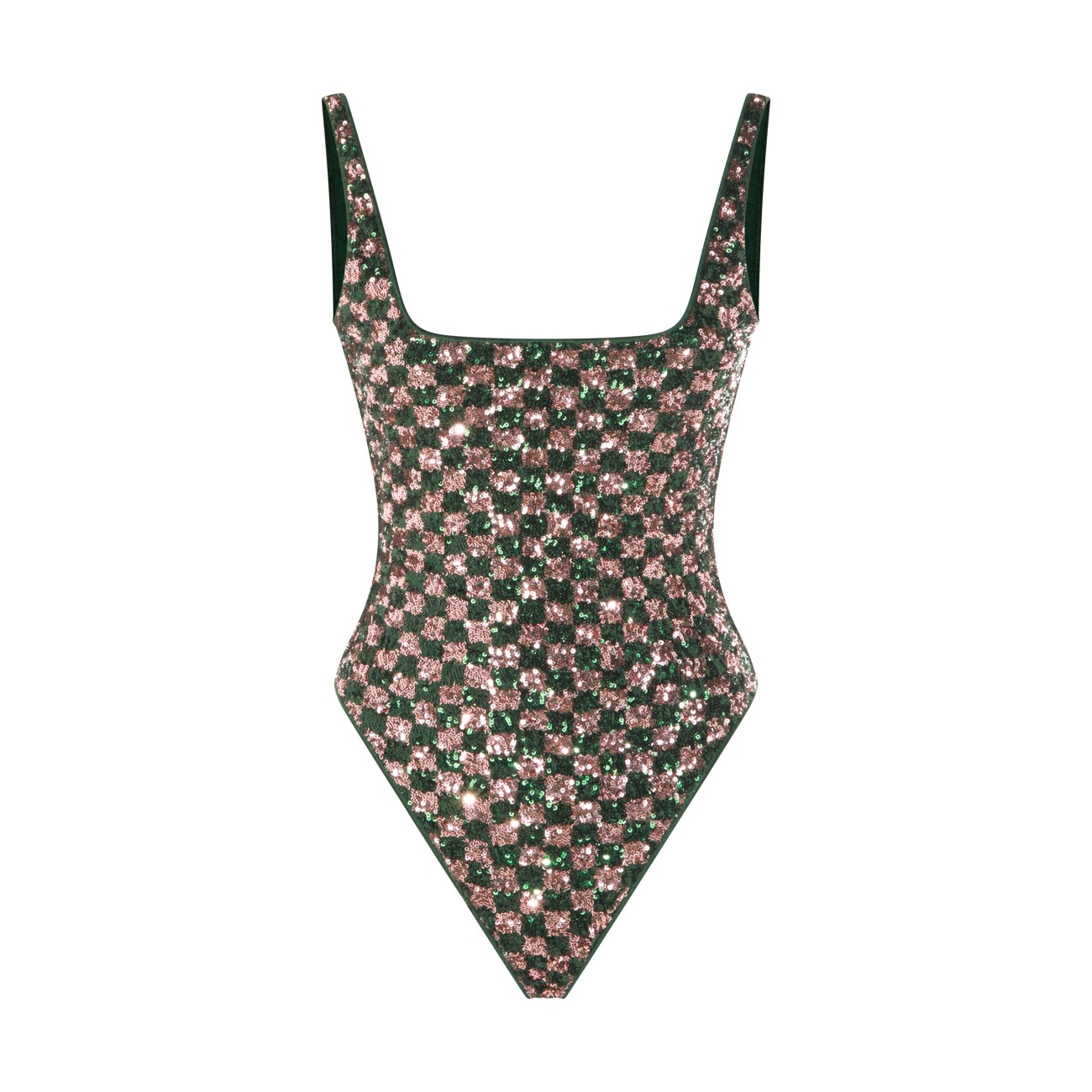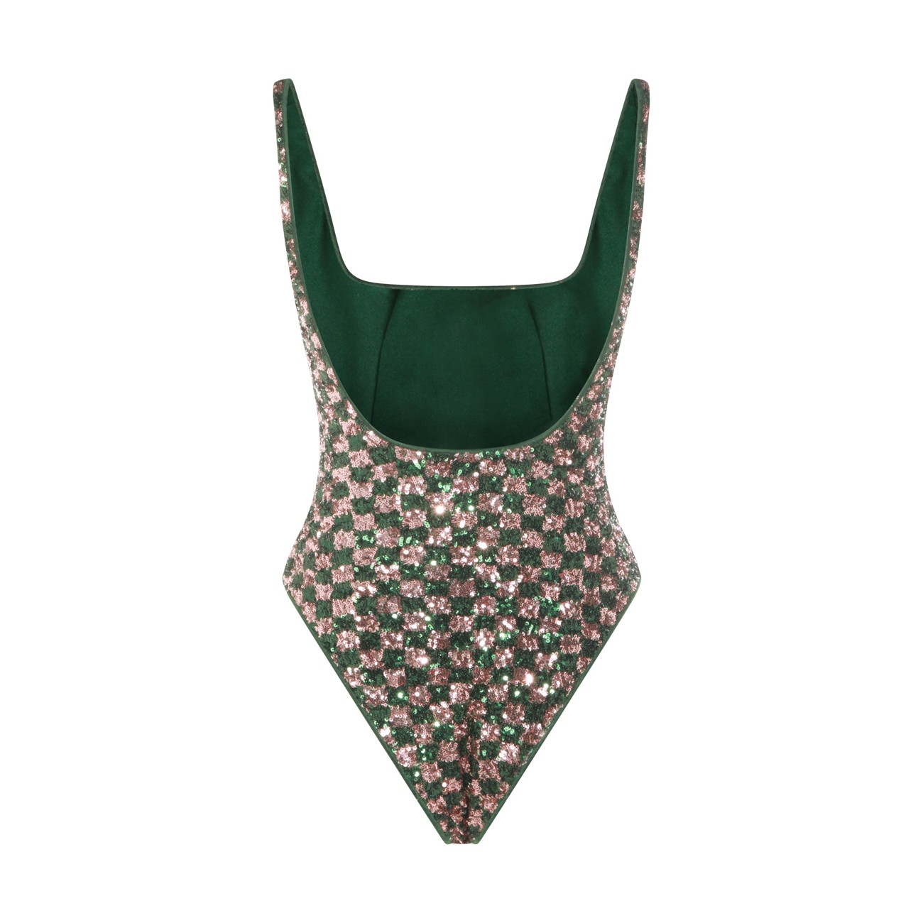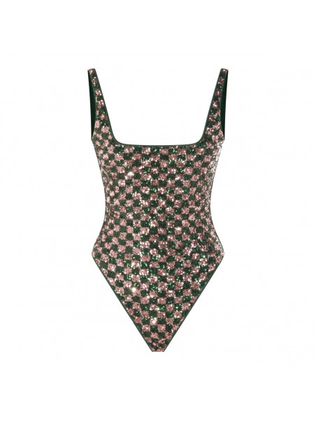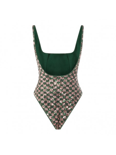 Pink and green beachwear from Oseree featuring square deep collar, sleeves and all over pailettes detail.