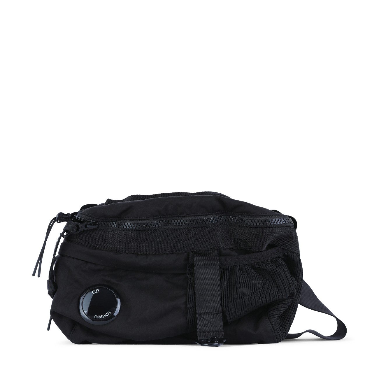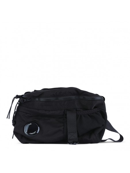 Black belt bag from Cp Company featuring main compartment with zip fastening, adjustable belt, logo patch and buckle closure.