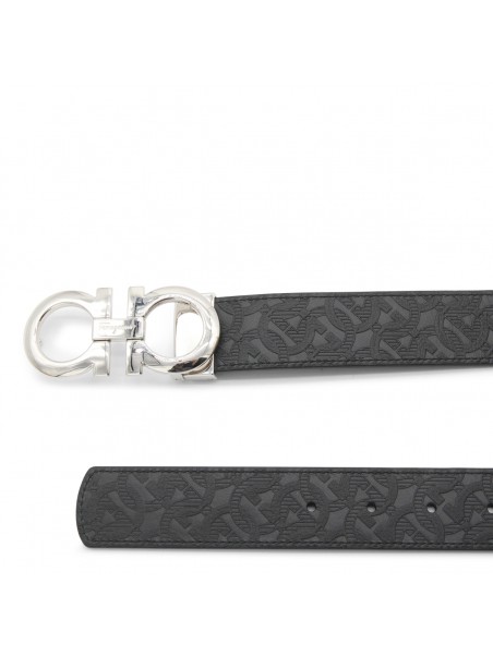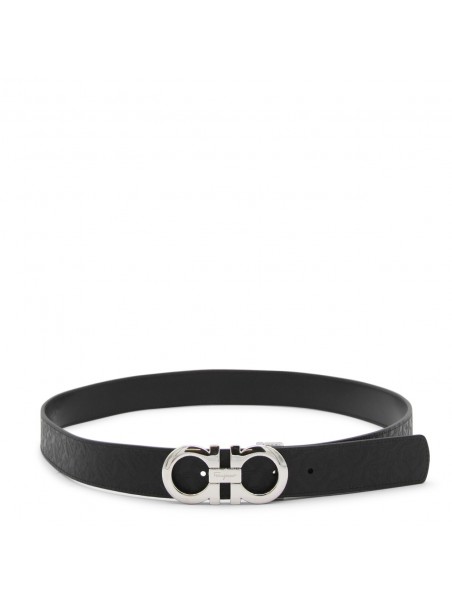 Black leather Gancini belt from Ferragamo featuring adjustable closure with logo plaque buckle and silver tone metal hardware.