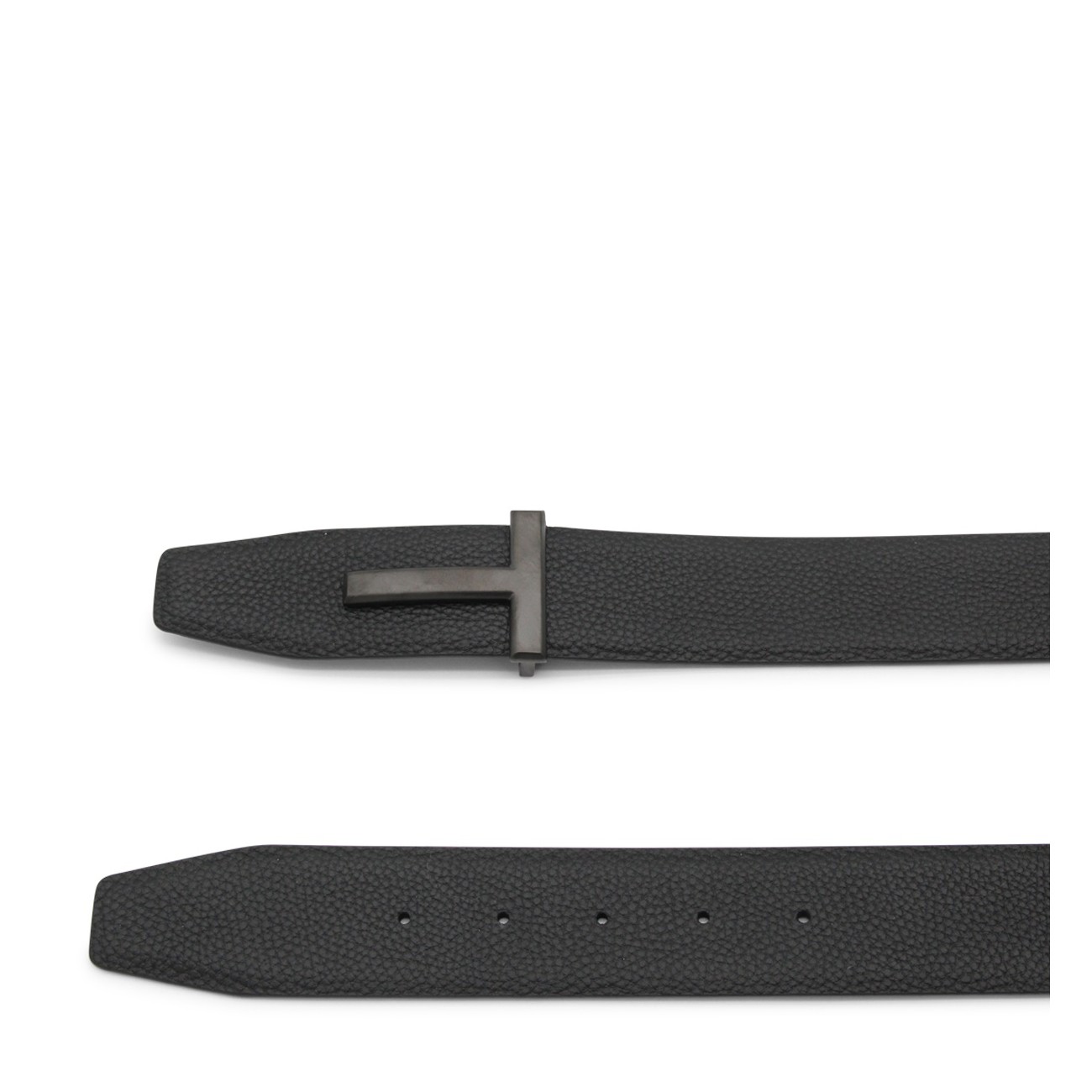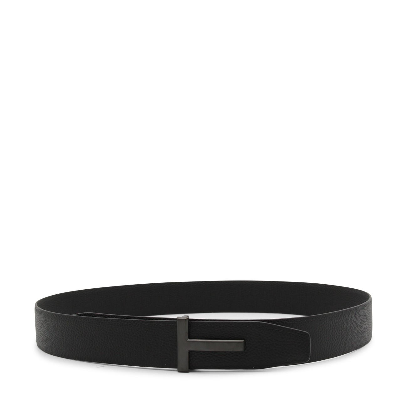 Black leather T belt from Tom Ford featuring front logo plaque and adjustable fit.