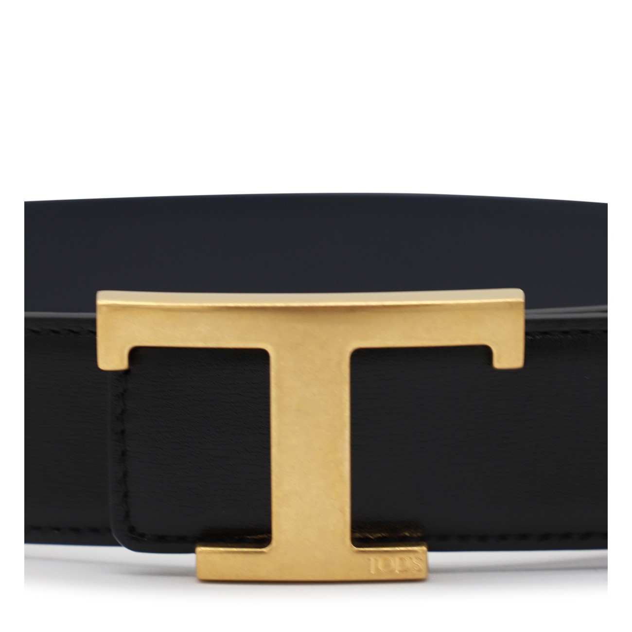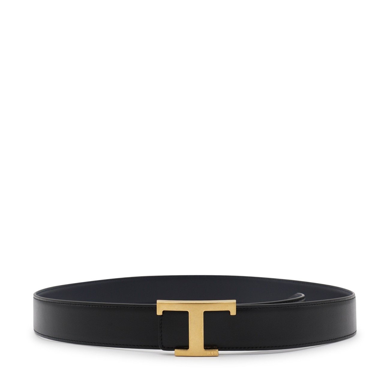 Black leather belt from Tod's featuring leather and frontal gold tone hardware.