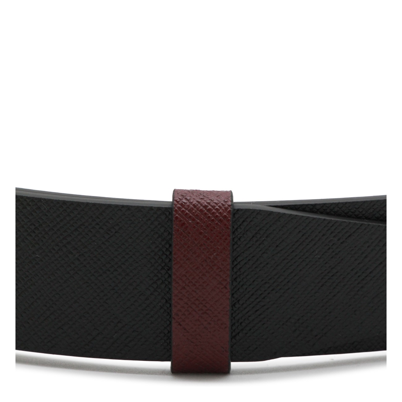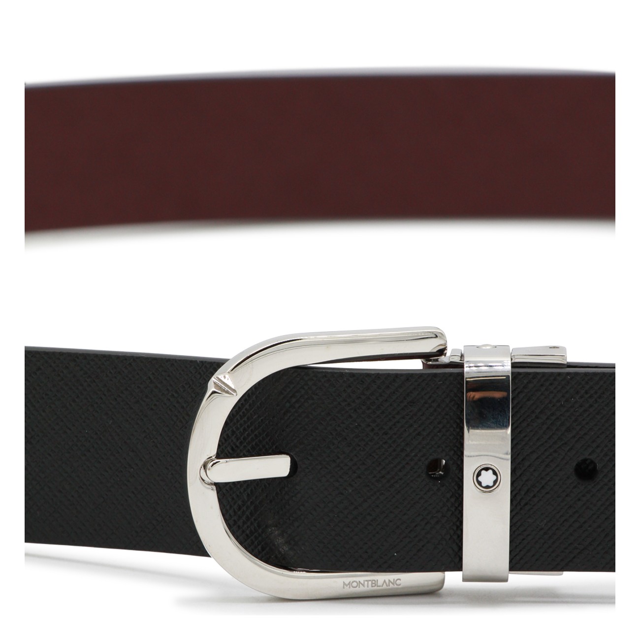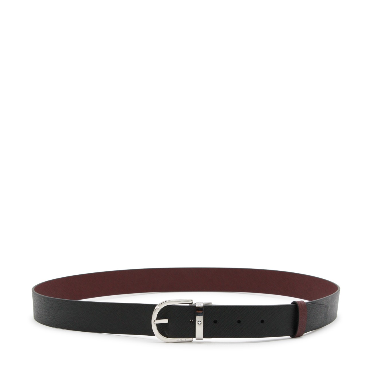 Black leather belt from Montblanc featuring silver tone buckle, adjustable size and logo.