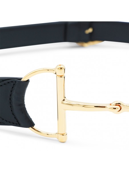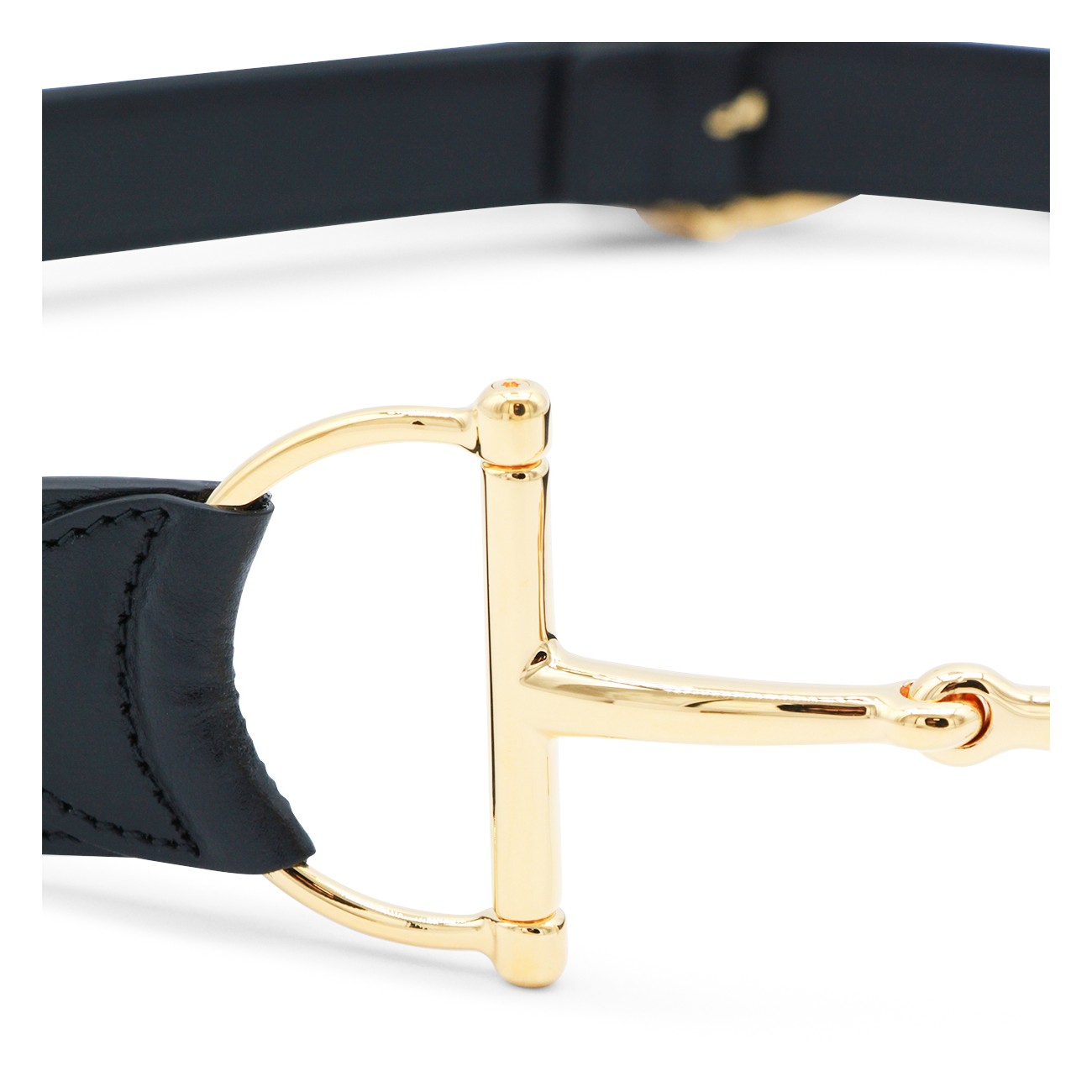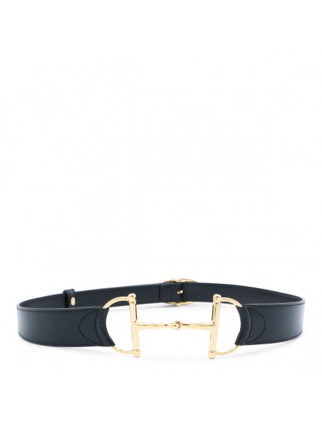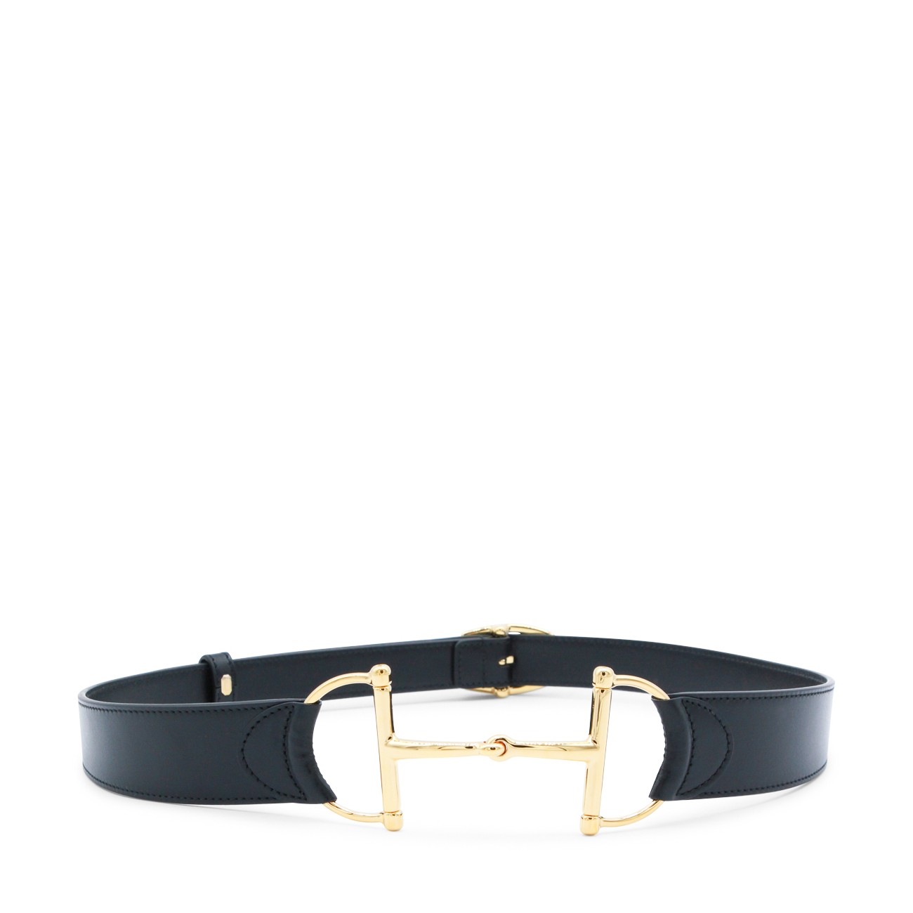 Black leather belt from Gucci featuring gold-tone hardware, oversize Horsebit buckle closure and adjustable size.