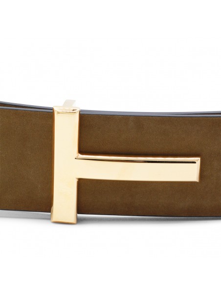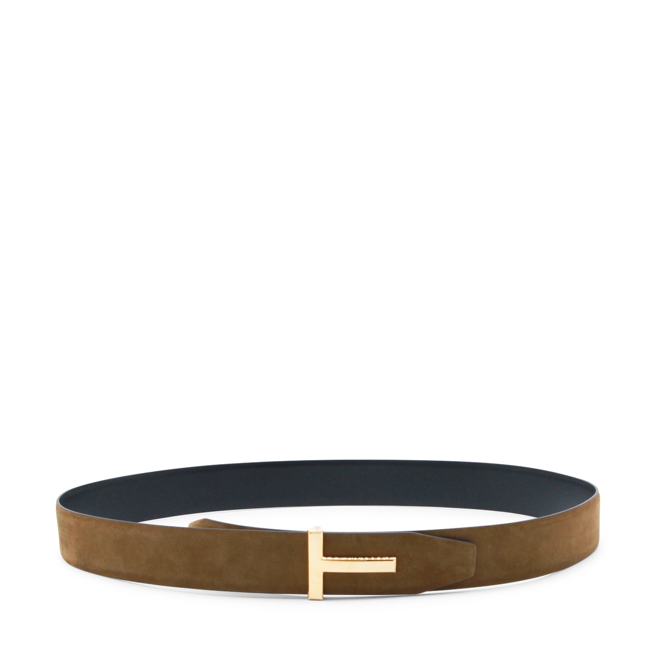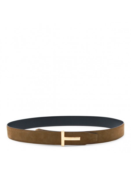 Brown leather belt from Tom Ford featuring gold tone T buckle fastening, suede lining and adjustable size.