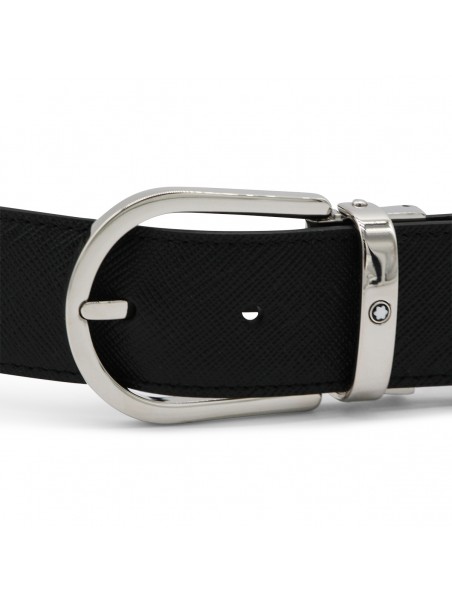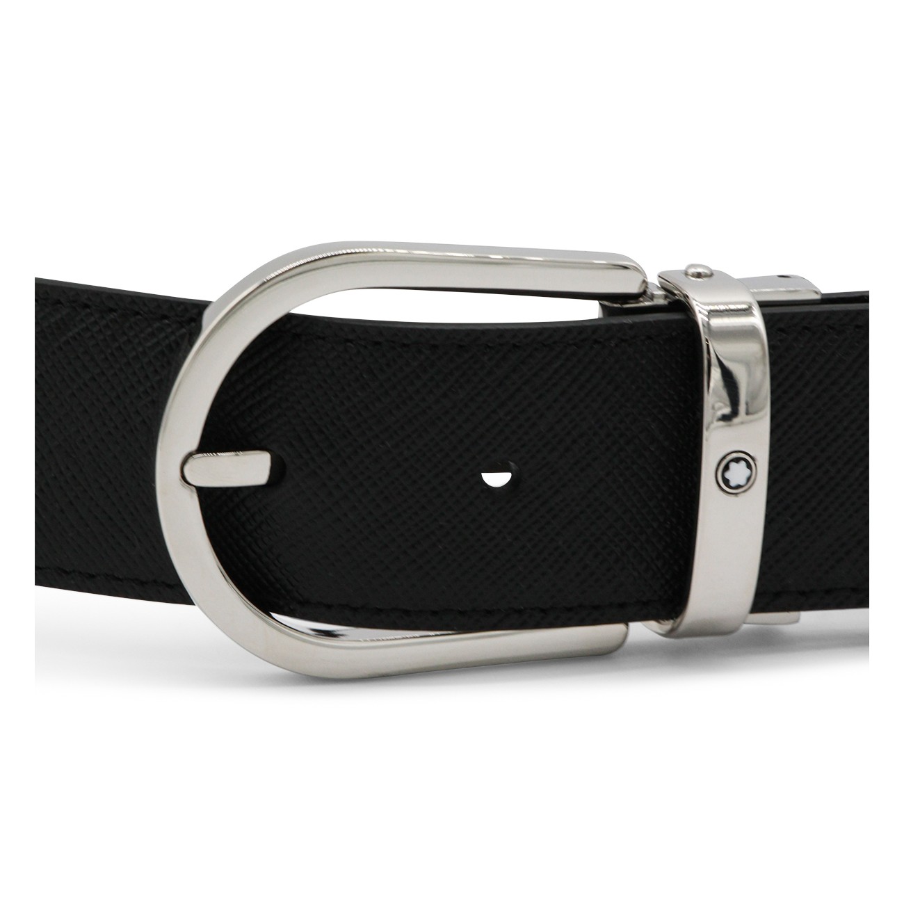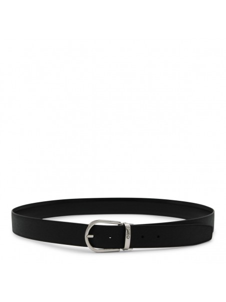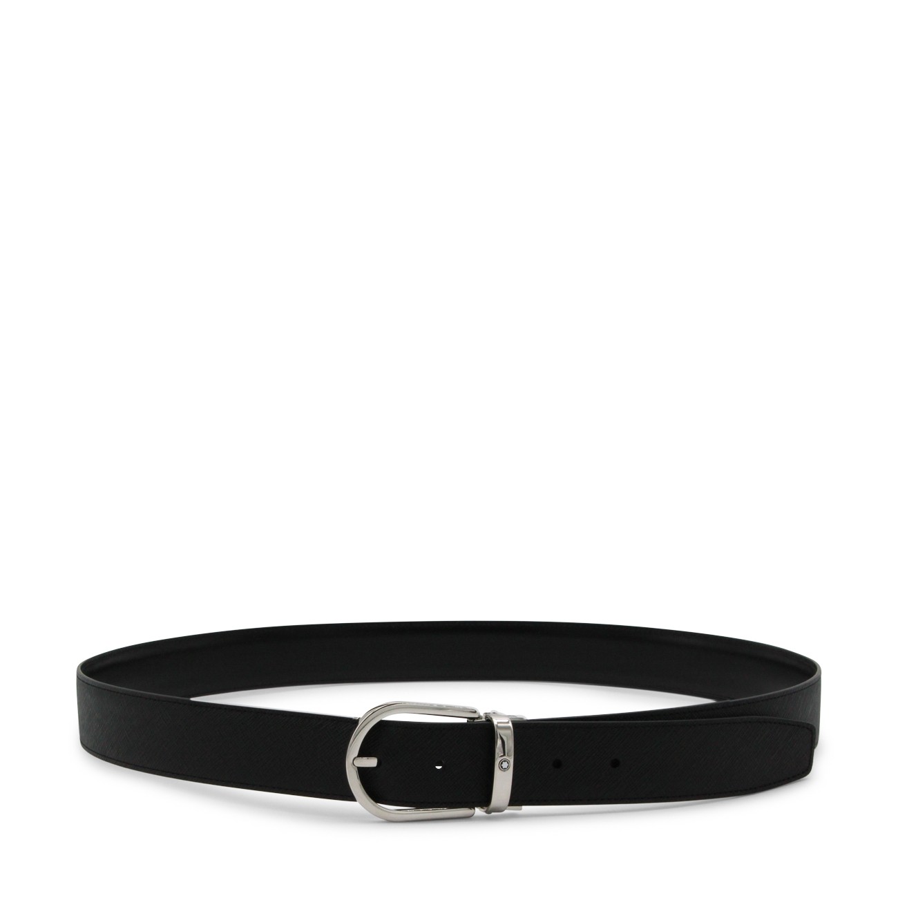 Black leather belt from Montblanc featuring silver tone buckle fastening and adjustable size.