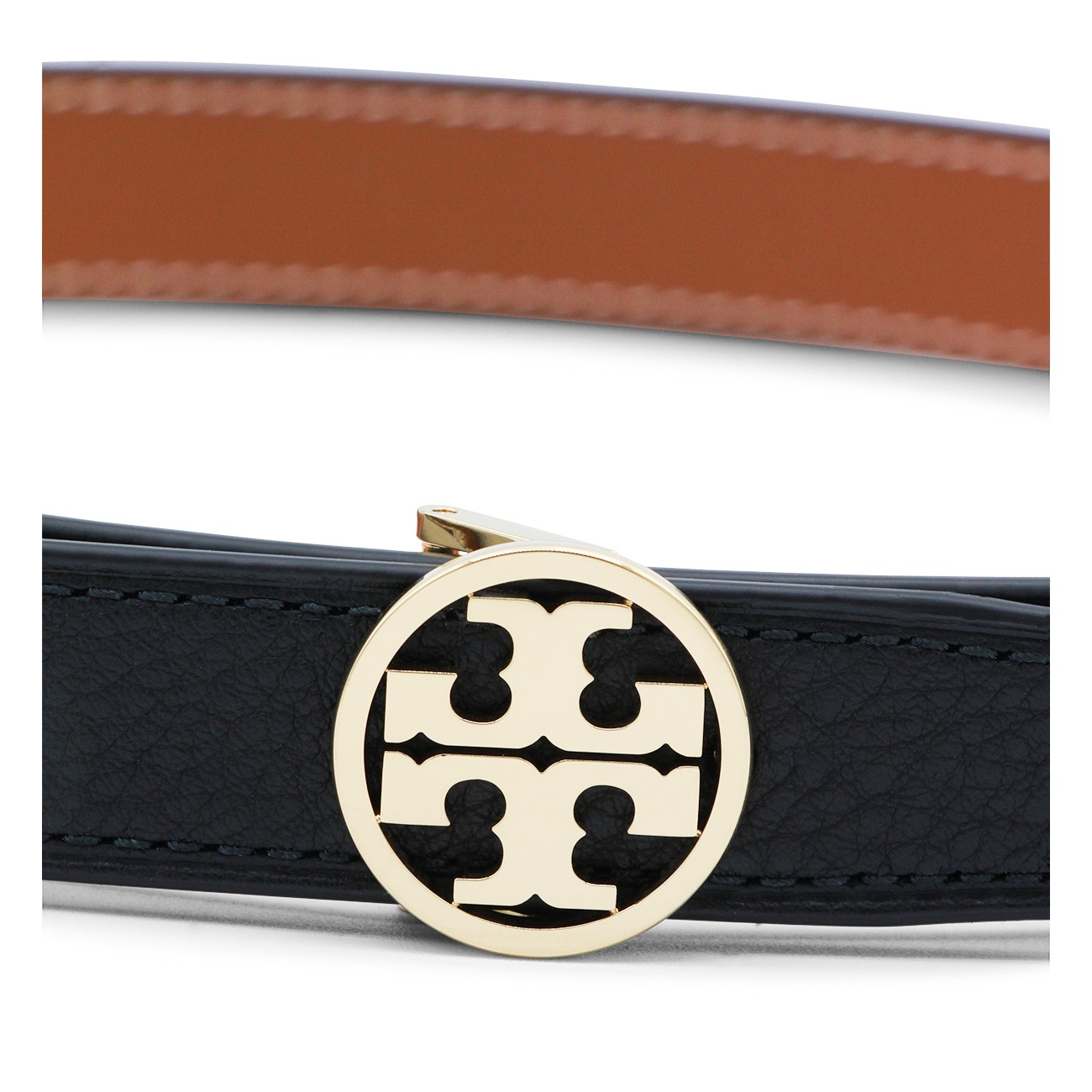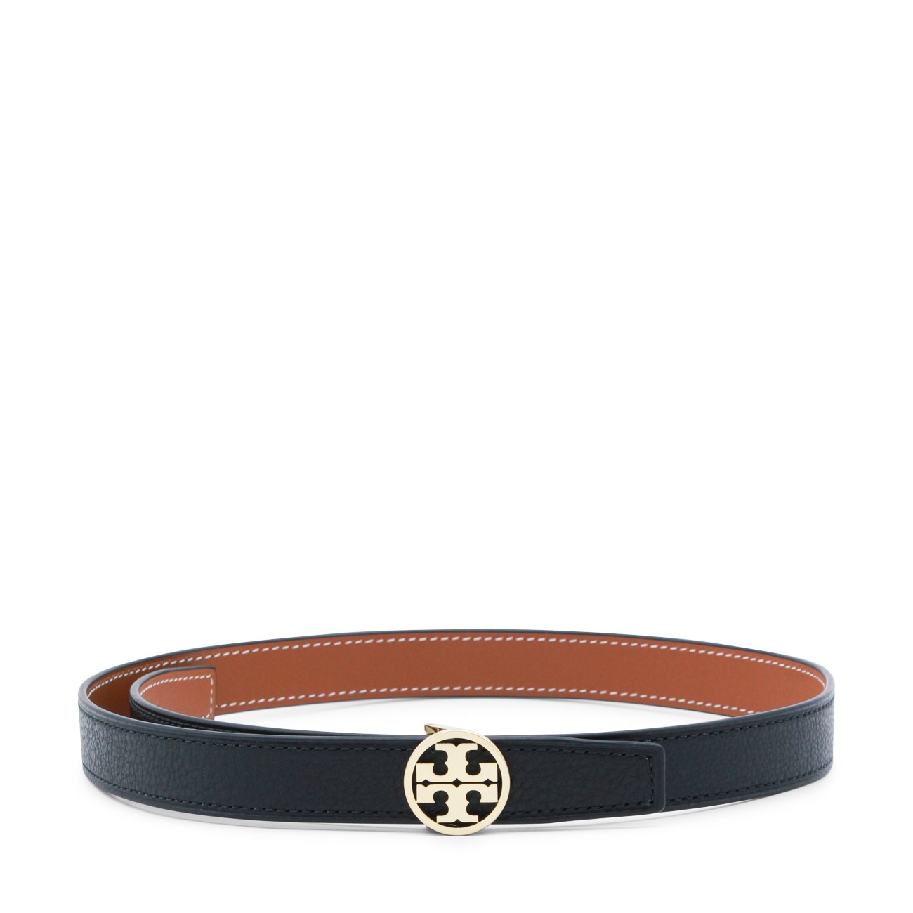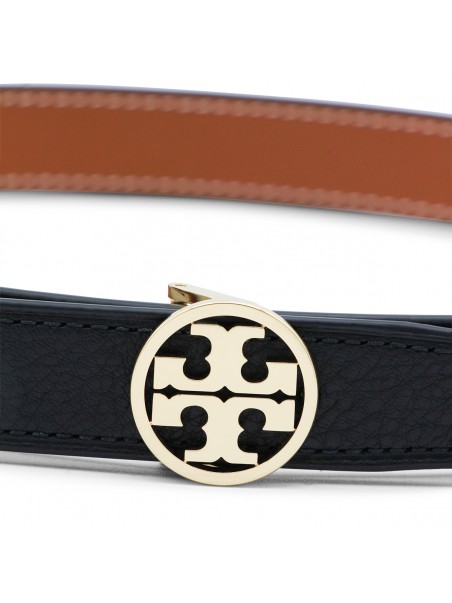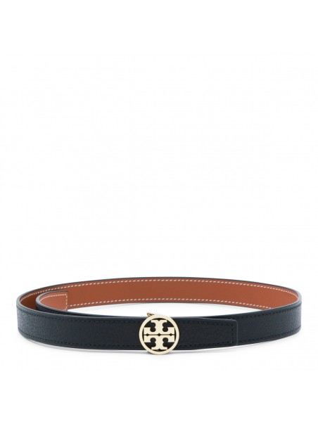Black leather belt from Tory Burch featuring gold tone logo hardware and adjustable size.