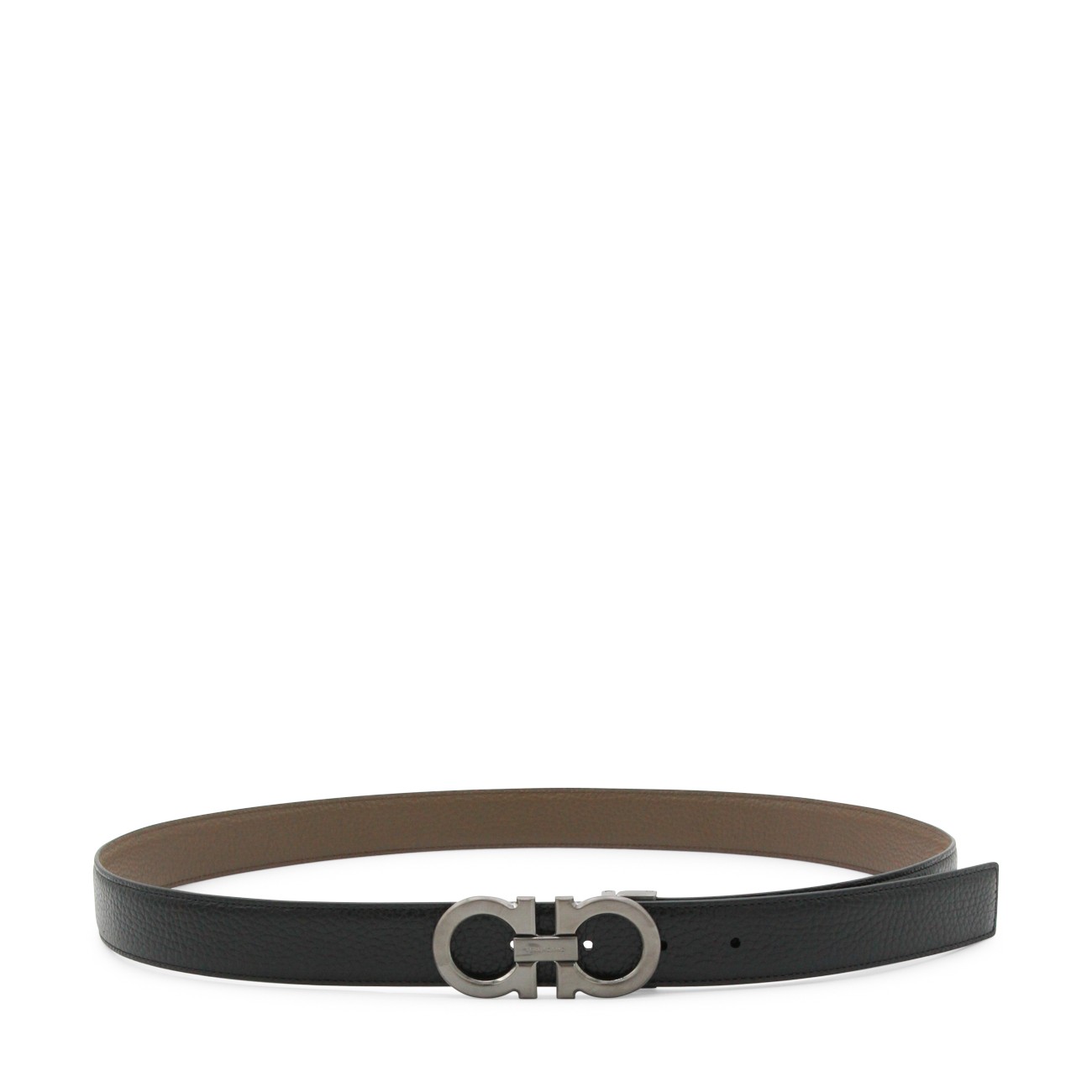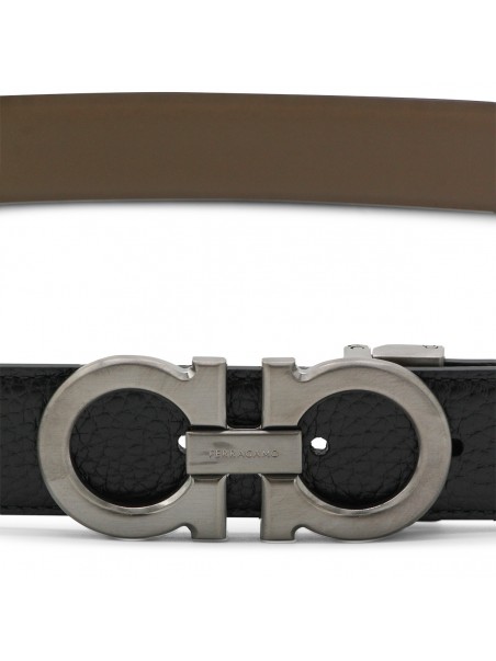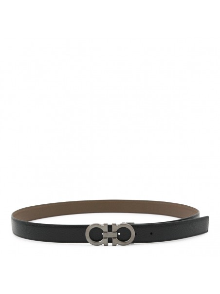 Black leather belt from Ferragamo featuring adjustable size and silver tone hardware.