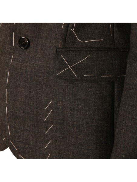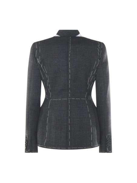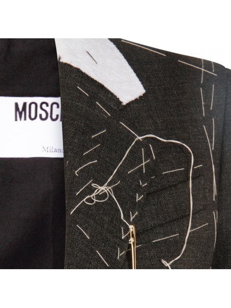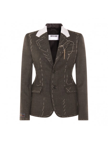 Grey wool blazer from Moschino featuring lapel collar, long sleeves, frontal fastening, stitchings detailing and regular vestibility.
