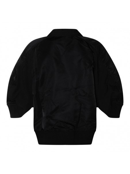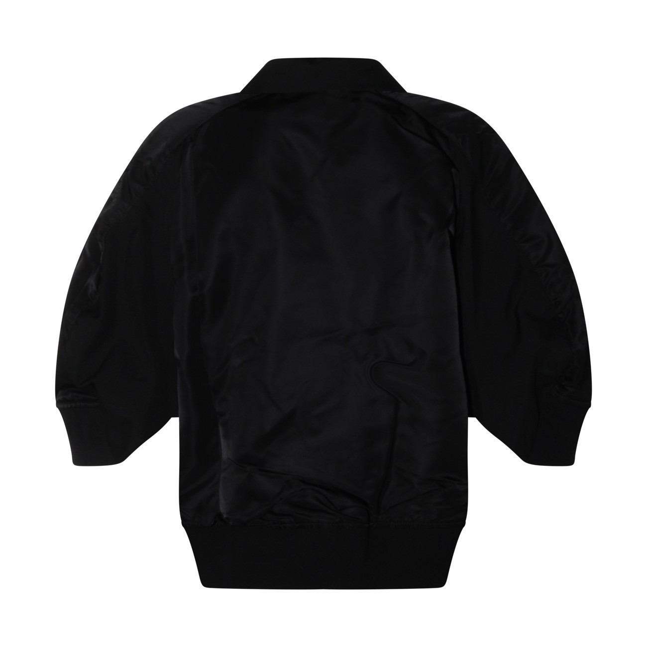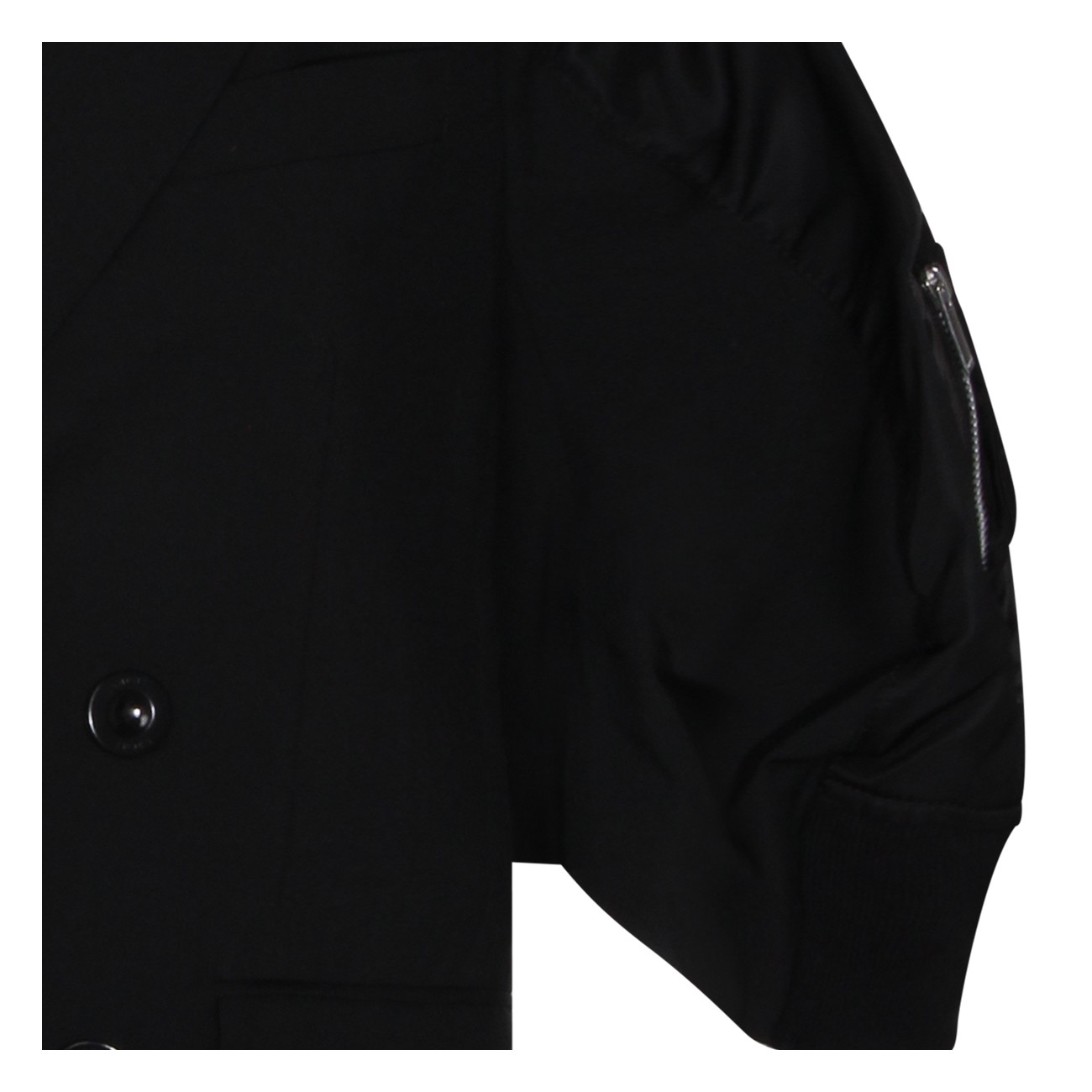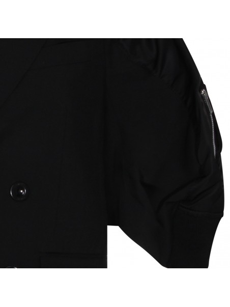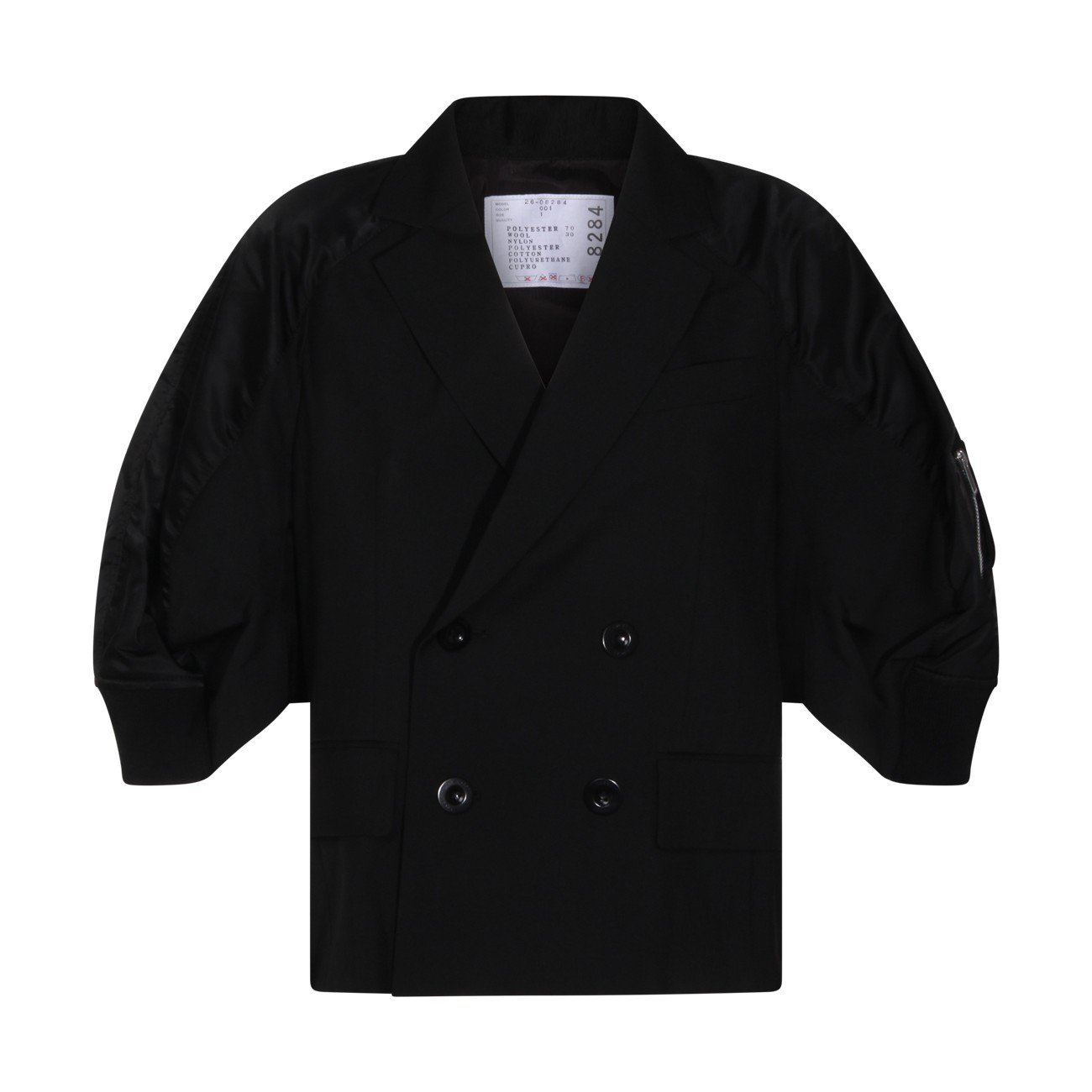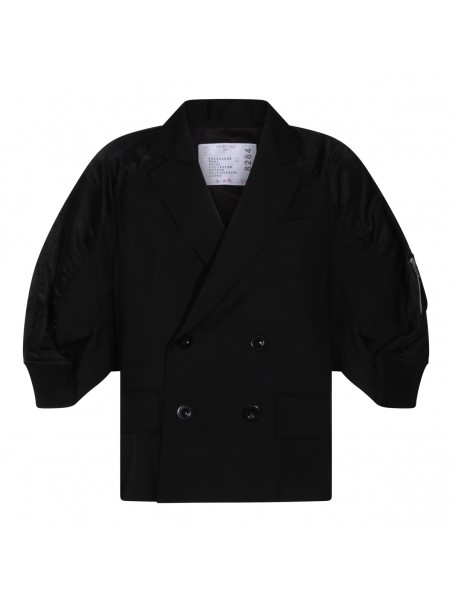 Black wool blend blazer from Sacai featuring double-brested buttons fastening, mid puffer sleeves, frontal pockets, sleeve zipped pocket and regular vestibility.