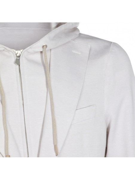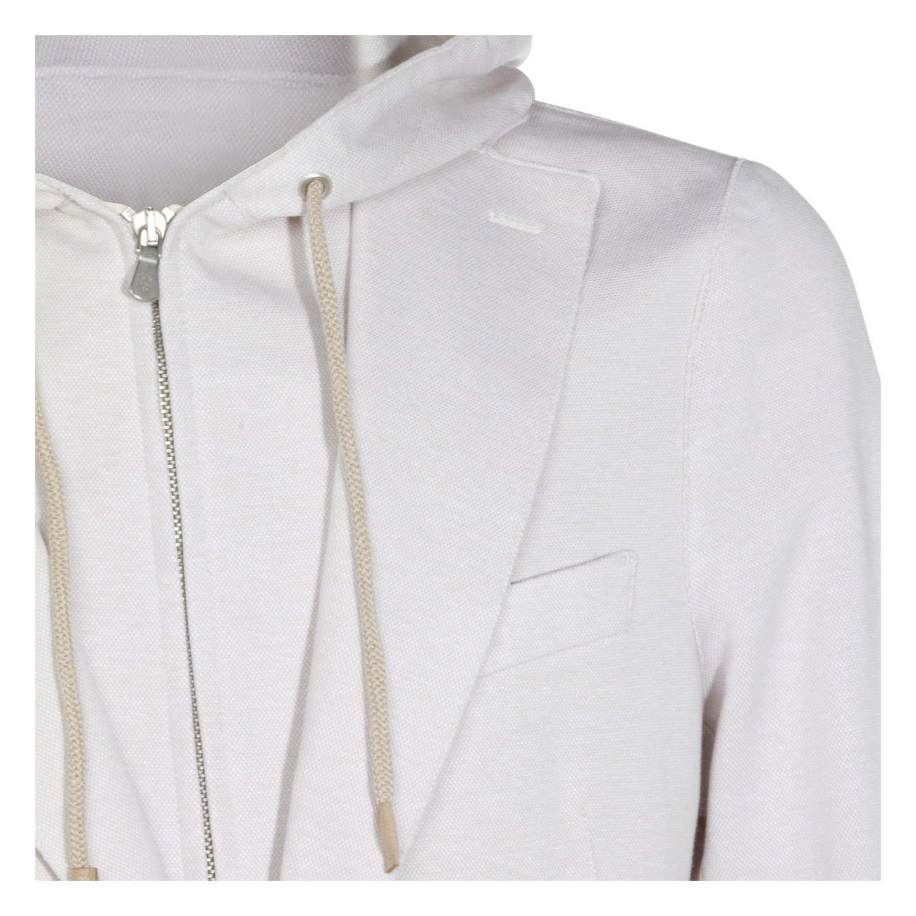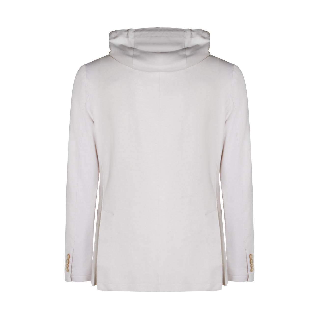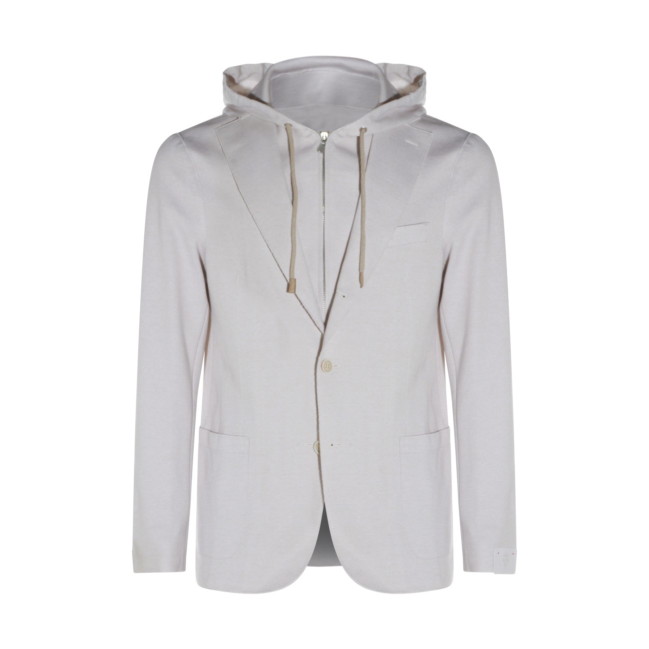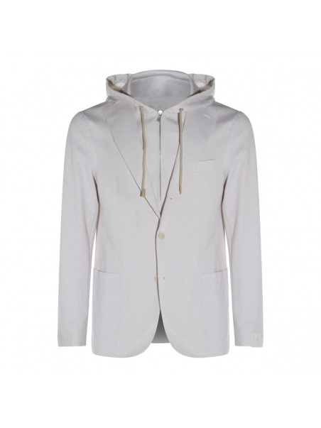 Sand cotton blazer from Eleventy featuring long sleeves, hood, round hem, buttons fastening and pockets.