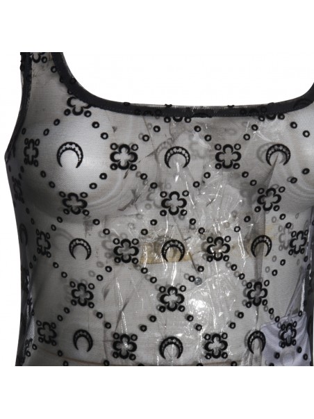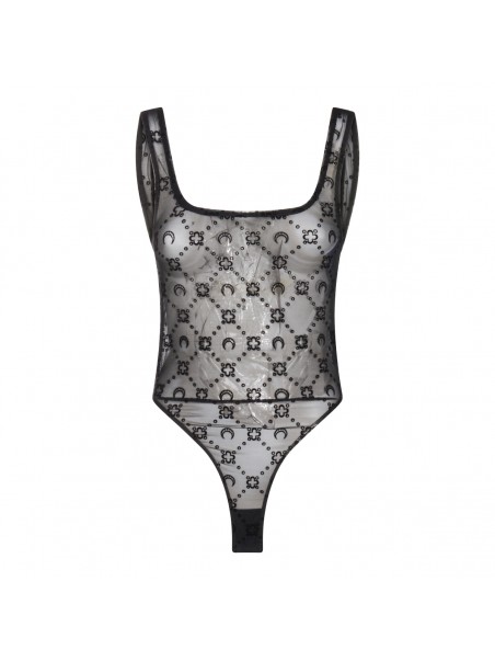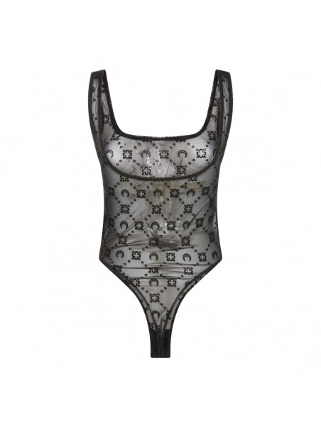 Black bodysuit from Marine Serre featuring square collar, sleeveless, thin straps, all-over logo texture, trasparence and slim fit.