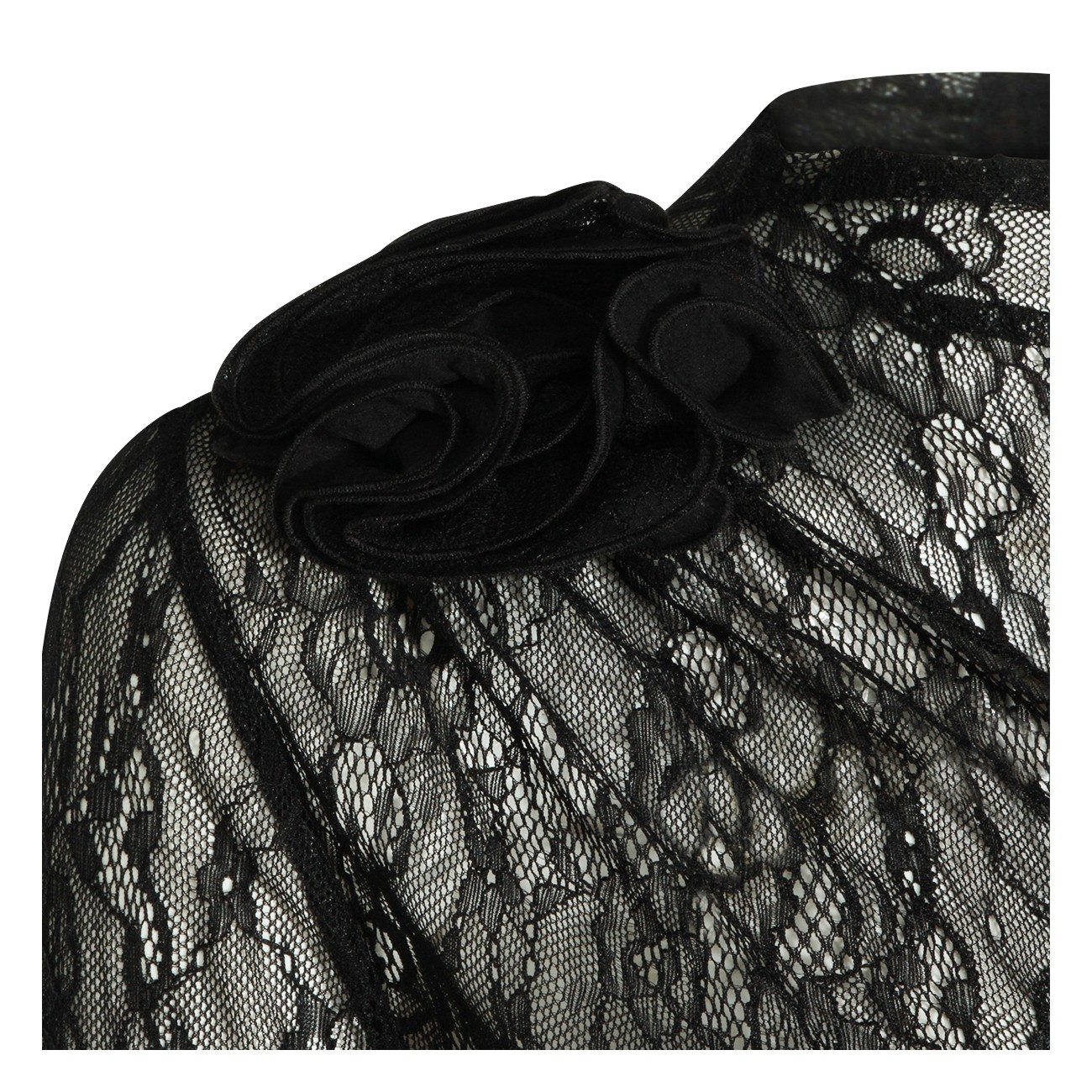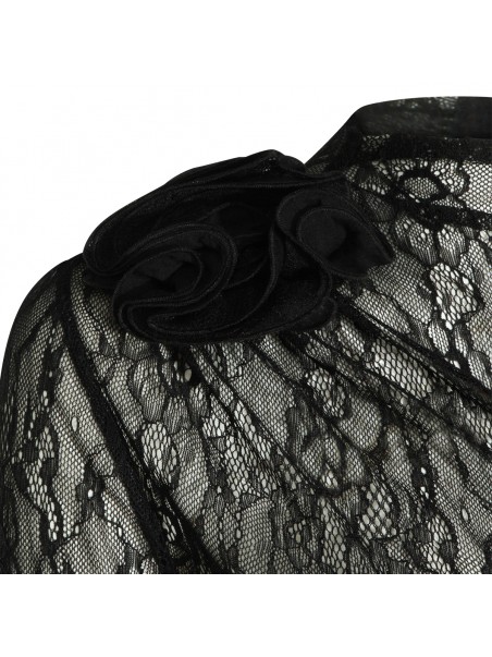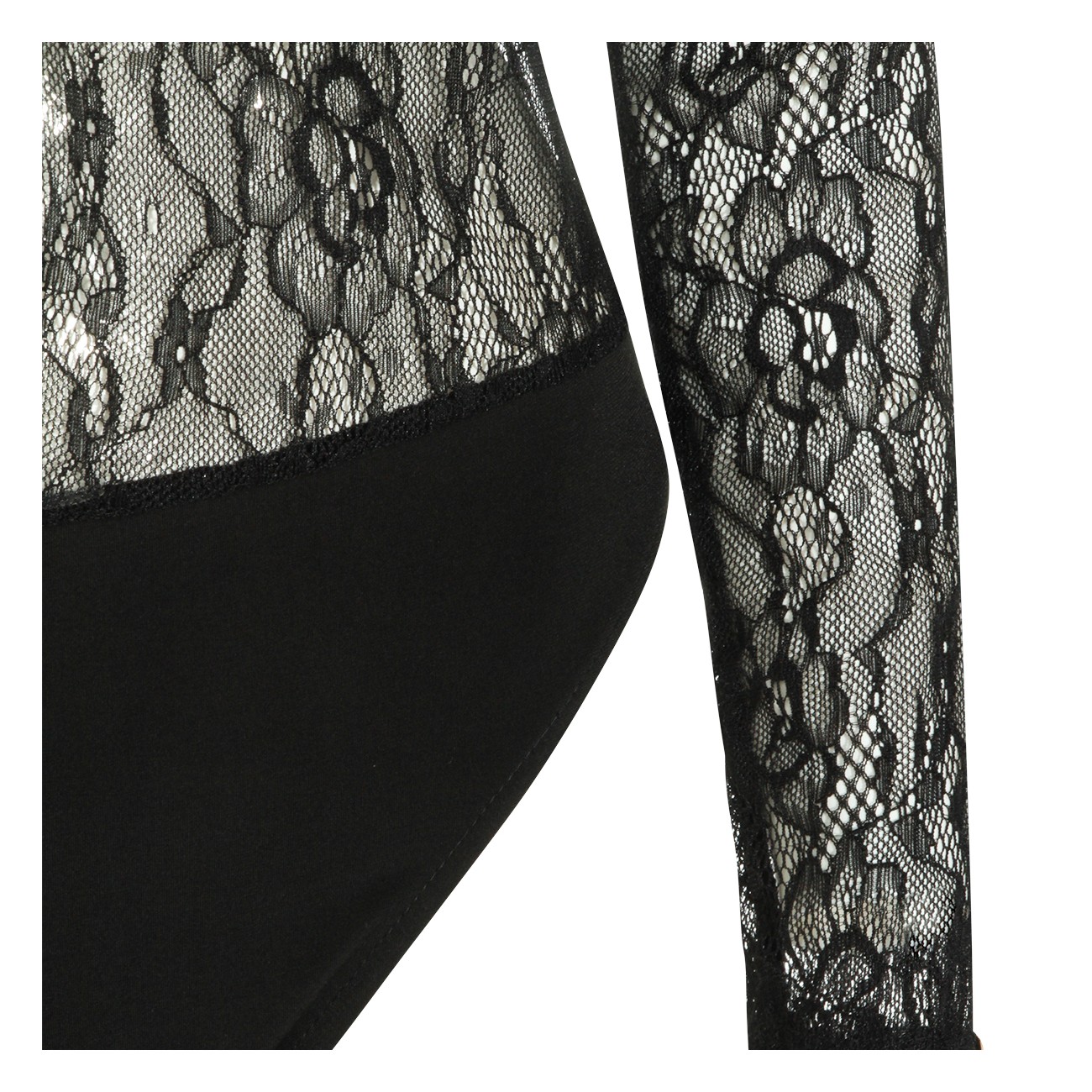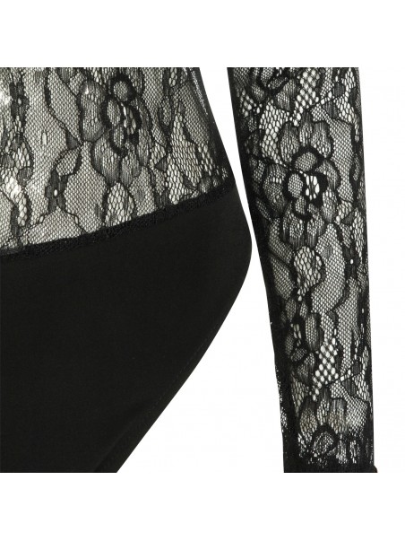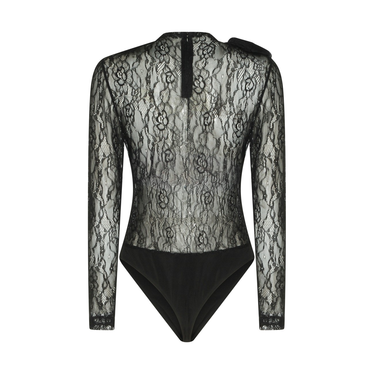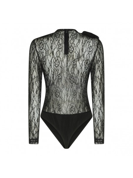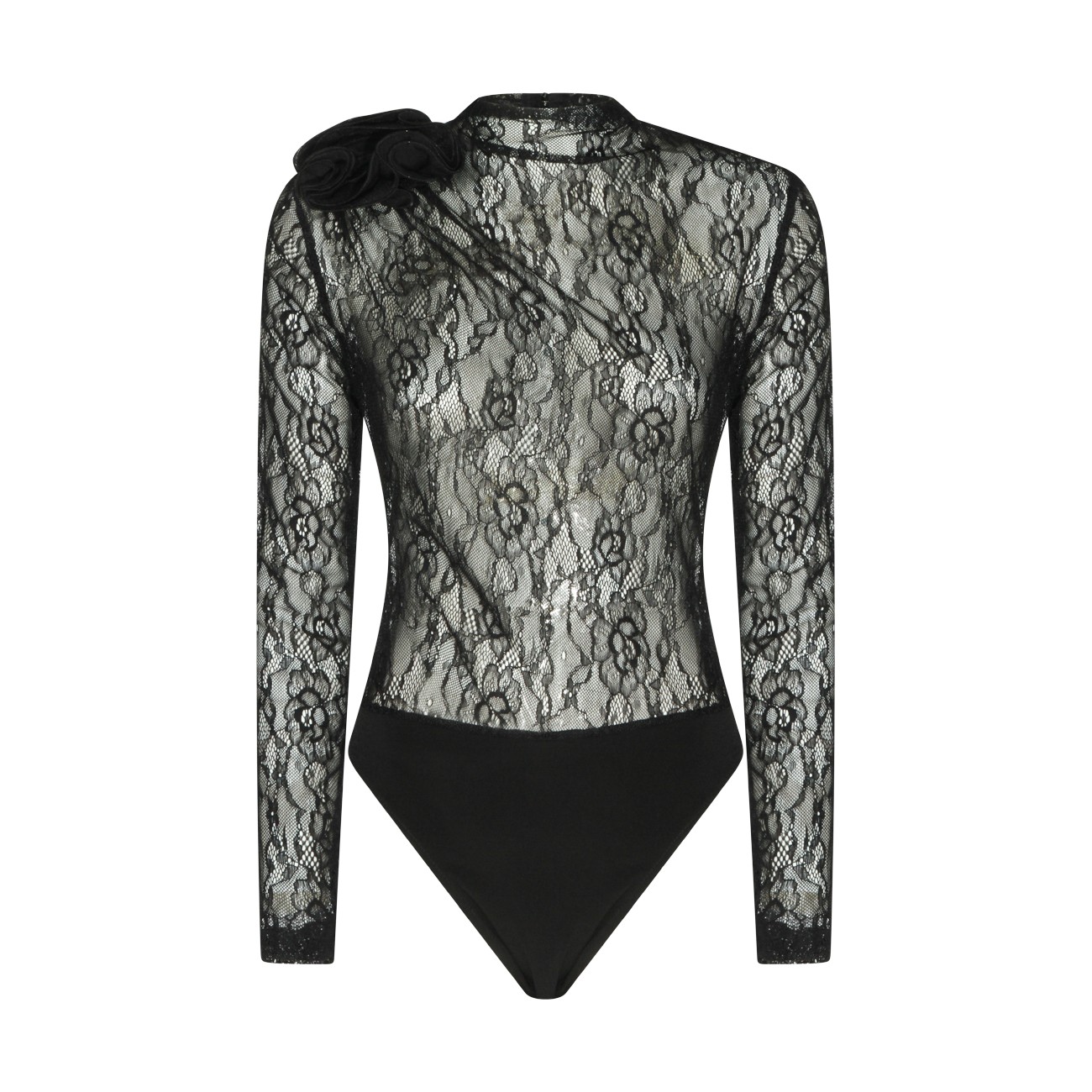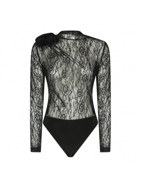 Black bodysuit from Nissa featuring long sleeves, round collar, all over laces, trasparence and flower detail.