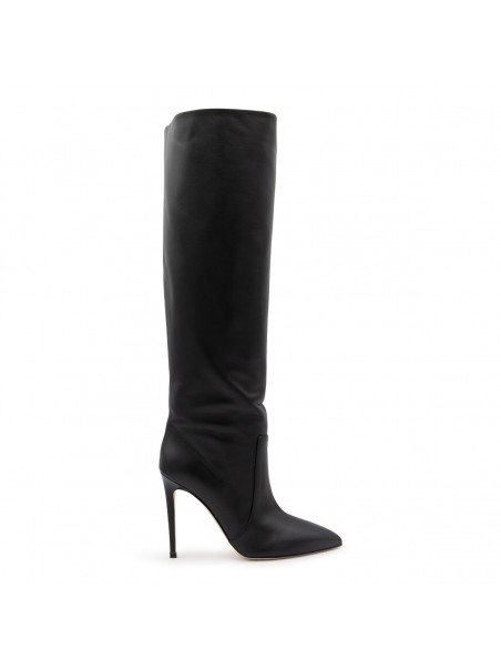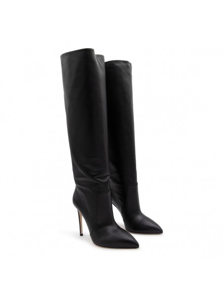 Black leather boots from Paris Texas featuring metallic finish, pointed toe, knee length and high stiletto heel.