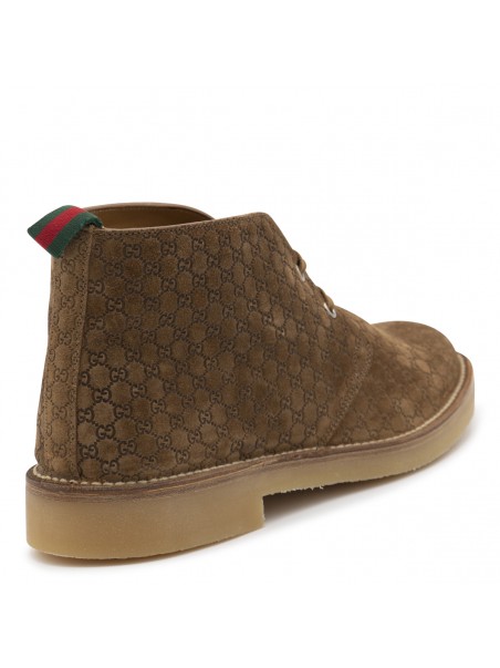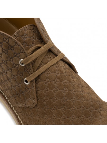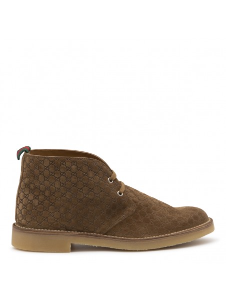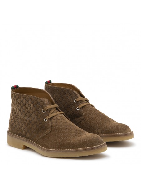 Brown leather boots from Gucci featuring round toe, laces fastening, leather sole and all over logo pattern.