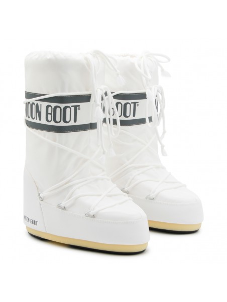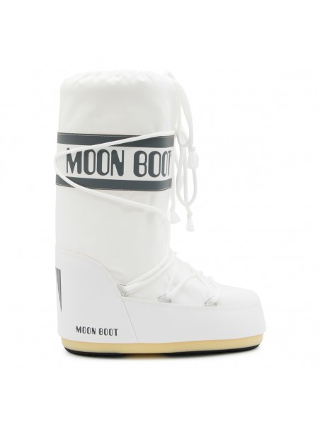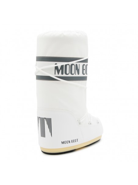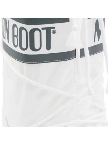 White Icon boots from Moon Boot featuring round toe, lateral logo print, laces fastening and drawstring.