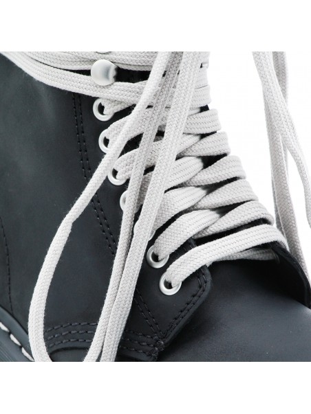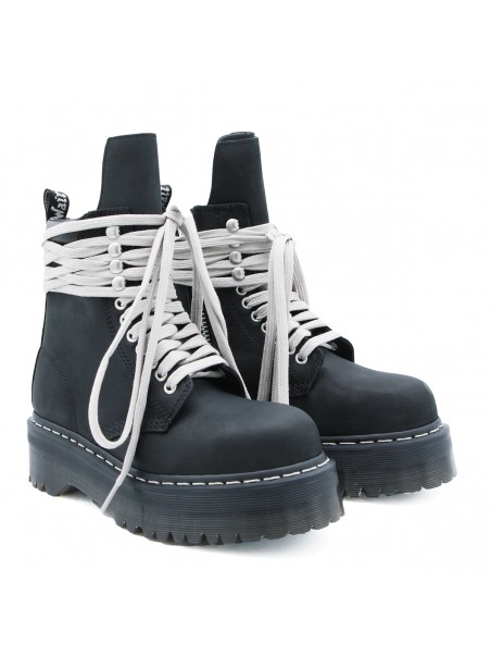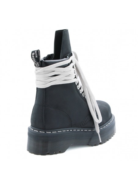 Black leather Steel Toe boots from Dr. Martens X Rick Owens featuring round toe, long laces fastening, long tongue, block heel, lateral zip fastening, branded insole and rubber sole.