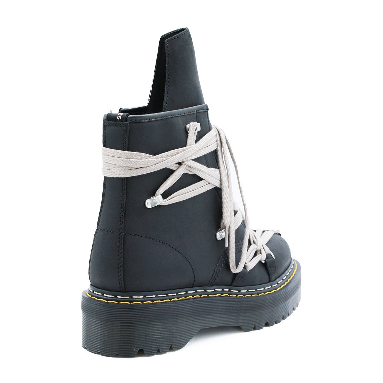 Black leather 1460 Megalace boots from Dr. Martens X Rick Owens featuring round toe, long laces fastening, long tongue, lateral zip fastening, branded insole and rubber sole.