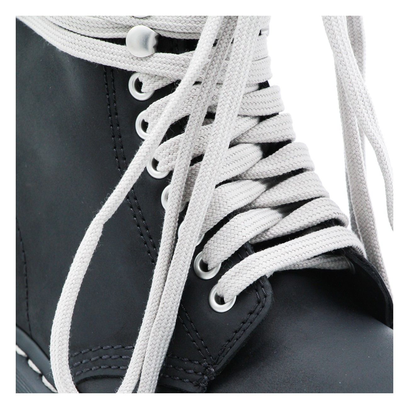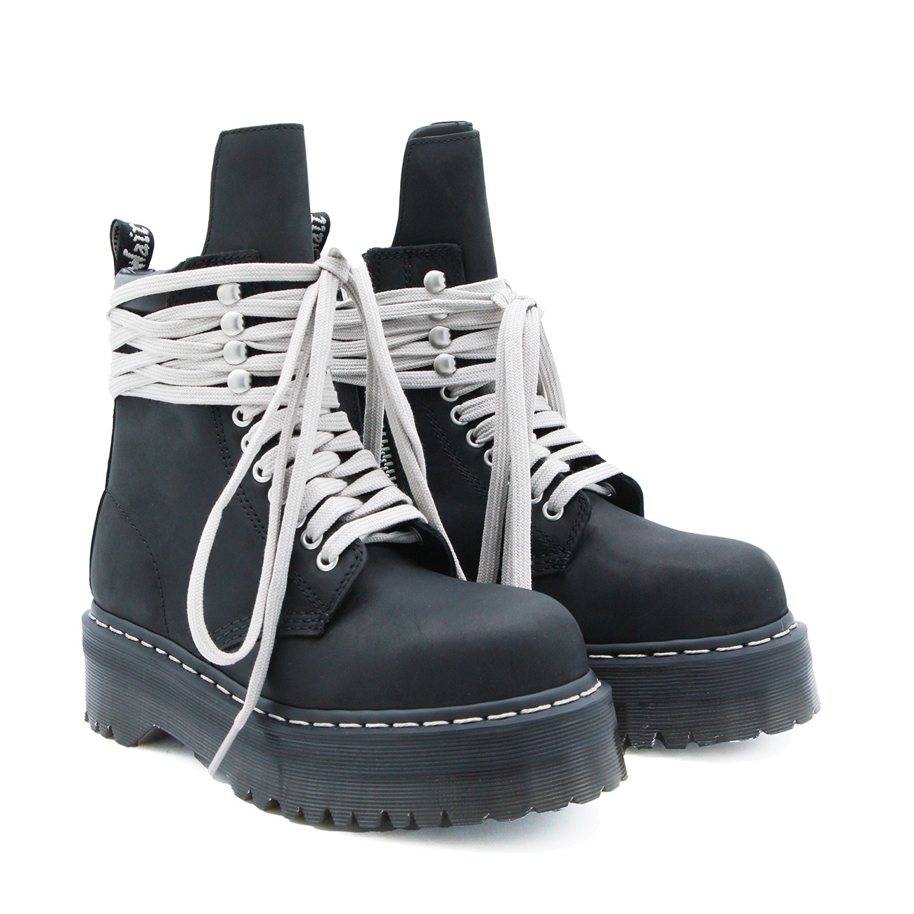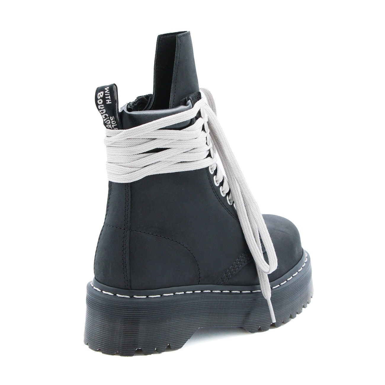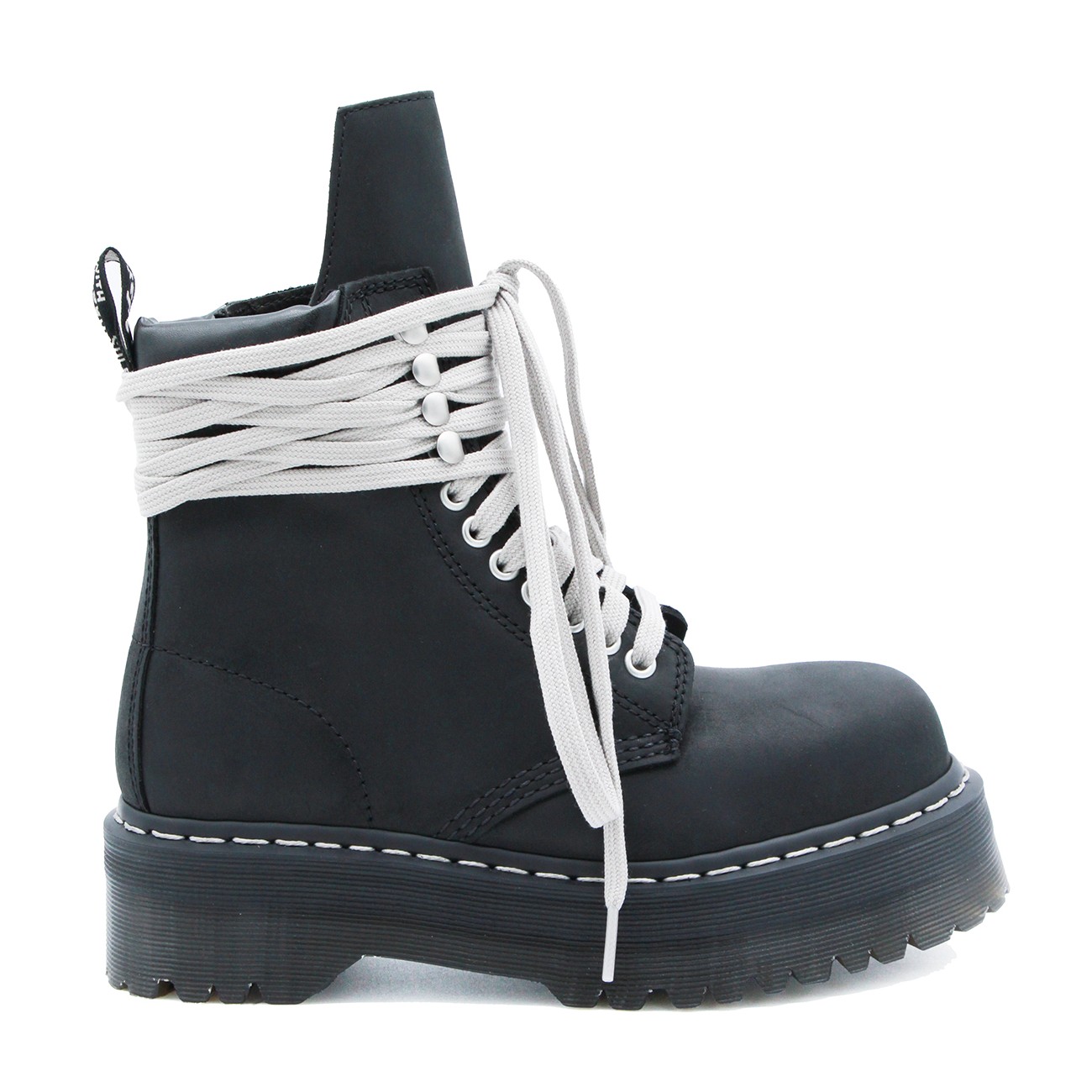 Black leather Steel Toe boots from Dr. Martens X Rick Owens featuring round toe, long laces fastening, long tongue, block heel, lateral zip fastening, branded insole and rubber sole.