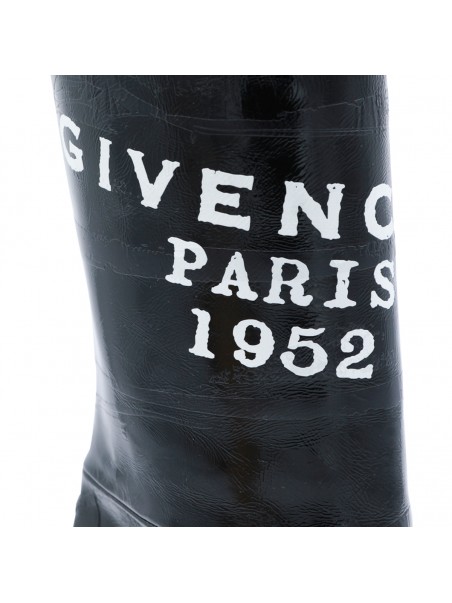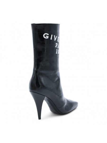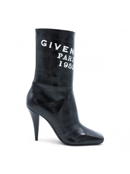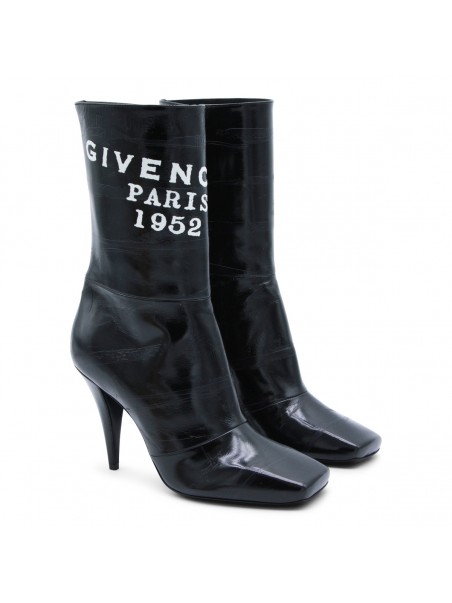Black leather boots from Givenchy featuring square toe, side zip closure, signature print and stiletto heel.