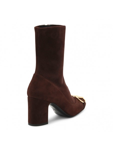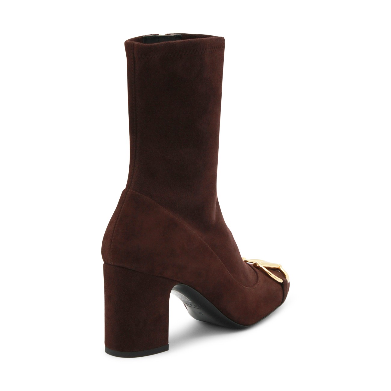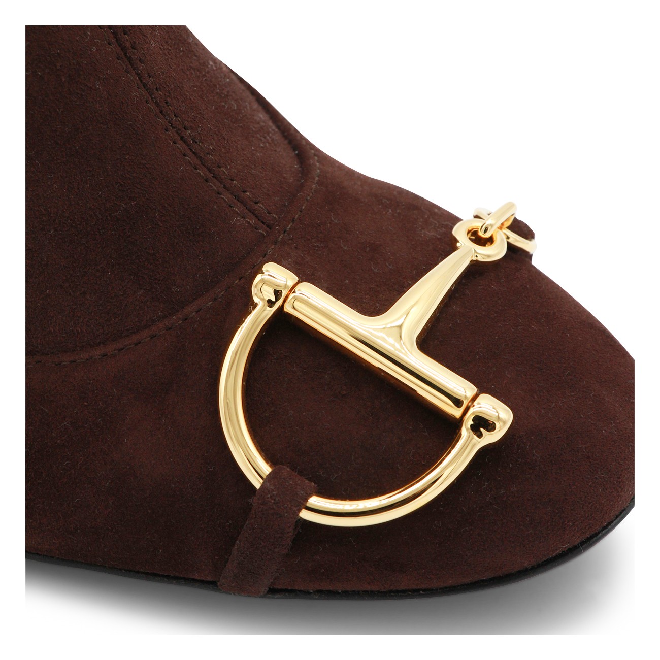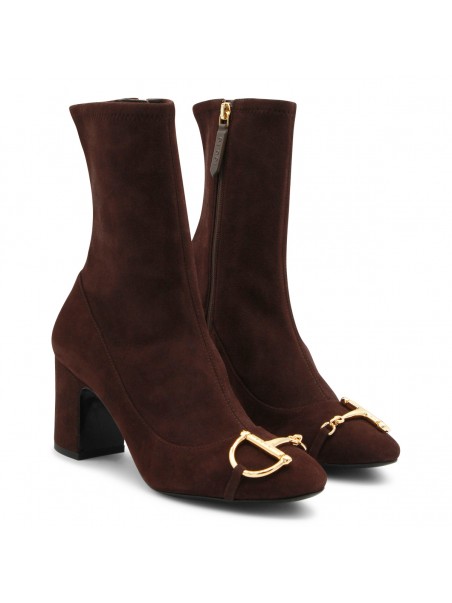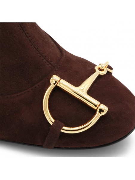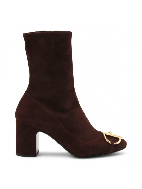 Brown leather boots from Gucci featuring round toe, square heel, frontal gold tone hardware and inside fastening.