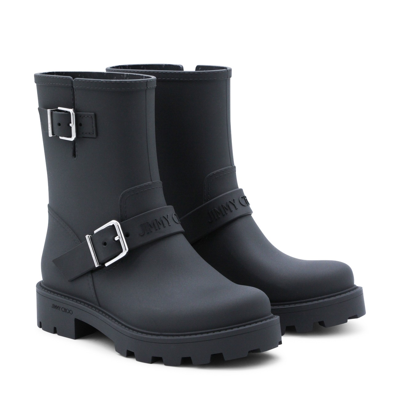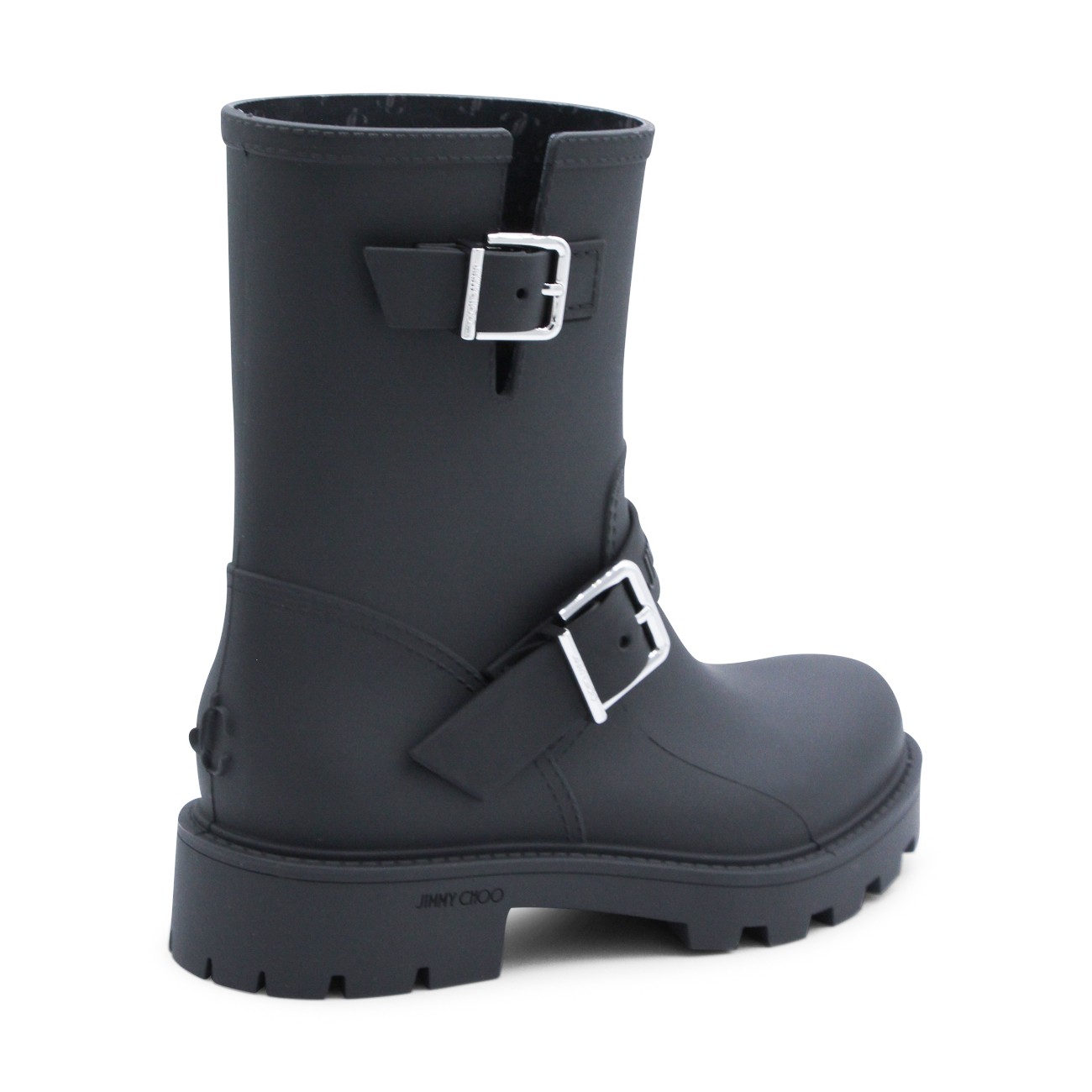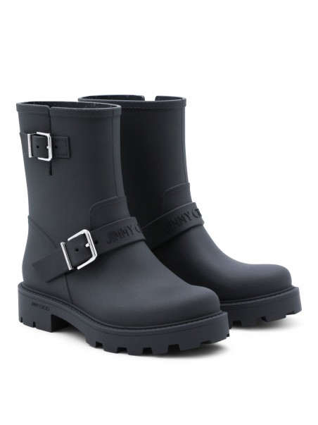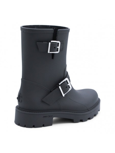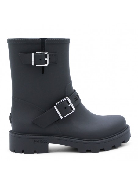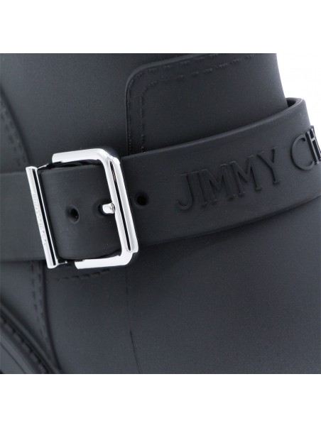 Black boot from Jimmy Choo featuring round toe, slip-on style, all-over buckles, silver tone hardware and low heel.