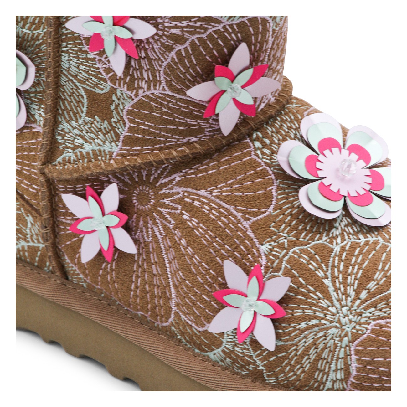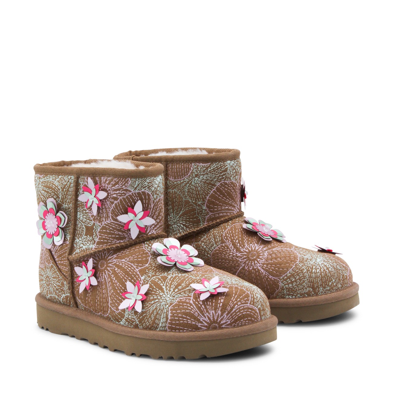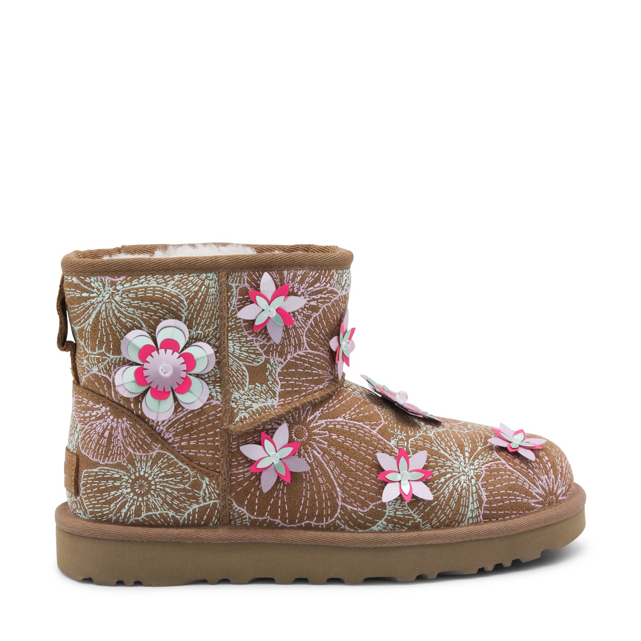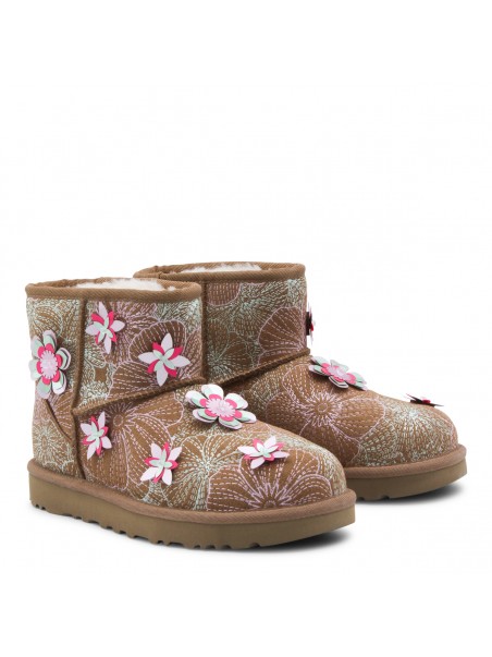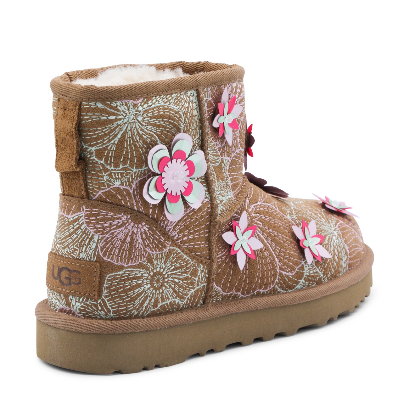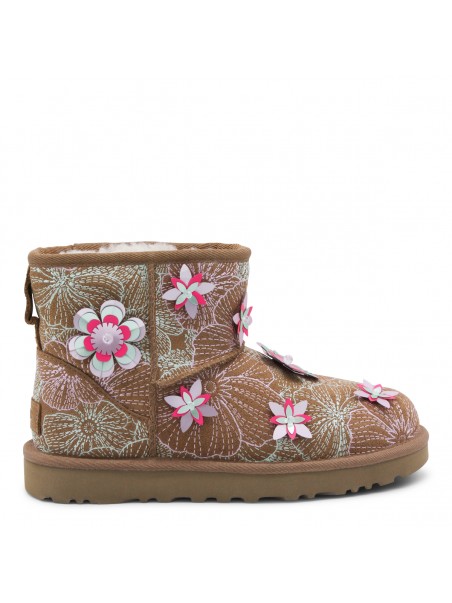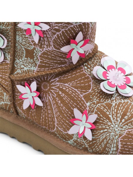 Chestnut classic mini Meadow boots from UGG featuring rubber sole, mid height, round toe, multicolor all over flower patches and logo inserts.