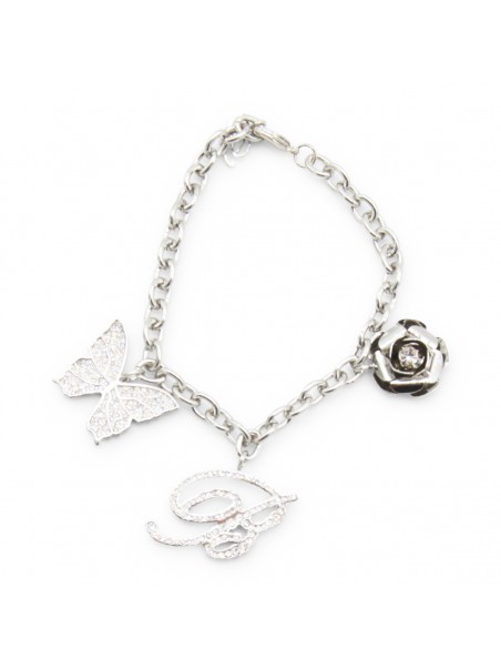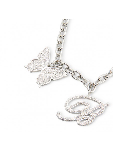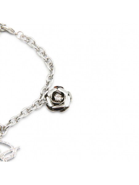 Silver tone bracelet from Blumarine featuring hook fastening, crystals and charms.