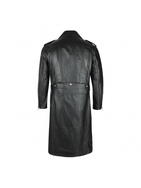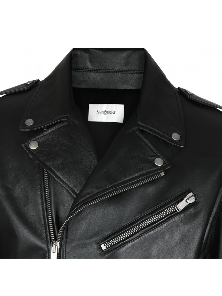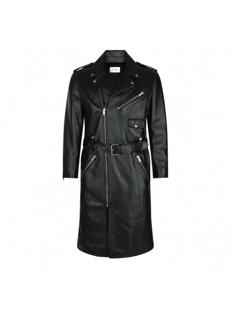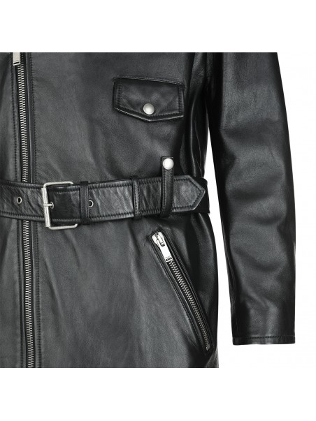 Black leather jacket from Saint Laurent featuring long sleeves, belt waist, multi pockets and midi length.